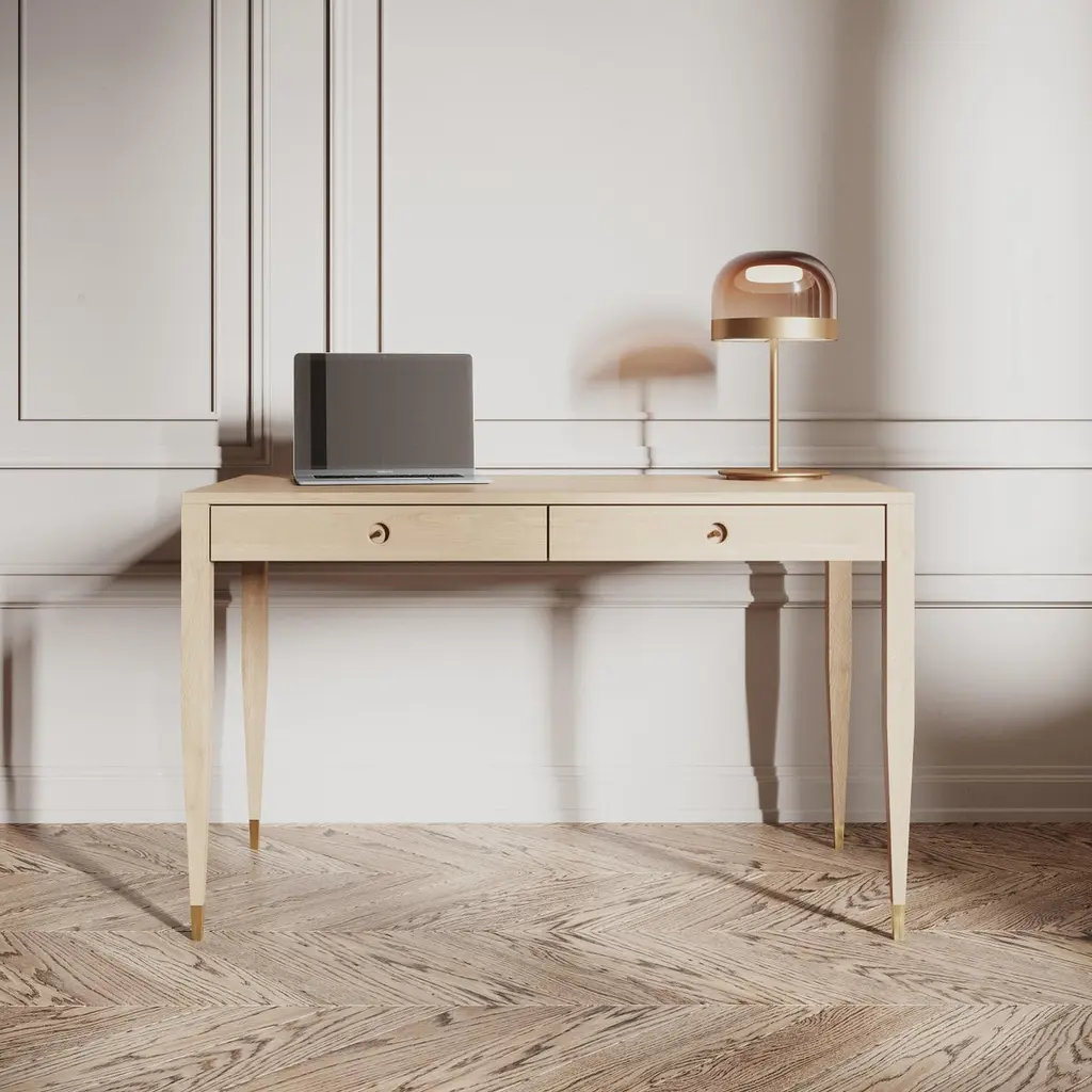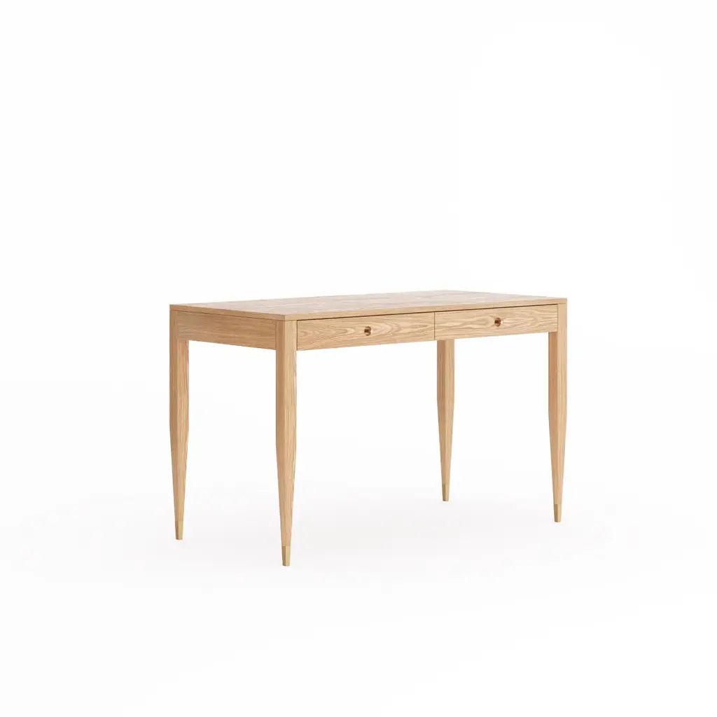 Oak desk in mid-century style with two drawers and brass handles. The tapered legs are finished with brass plated aluminum feet. Desk made of solid oak wood and wood covered with natural oak veneer. Other wood on request. Perfect as office desk, writing desk, study desk, computer desk, home office desk.Handmade in Poland.Materials:-drawer fronts, sides, dividers, back: solid oak-drawer body: solid oak-legs: solid oak-top: blockboard overlaid with oak veneer-handles: solid brass-feet: brass plated aluminum-matte varnishDimensions:width: 120 cm (47,2")depth: 60 cm (23,6")height: 75 cm (29,5")You can change the size, material, surface treatment after prior contact and setting prices.