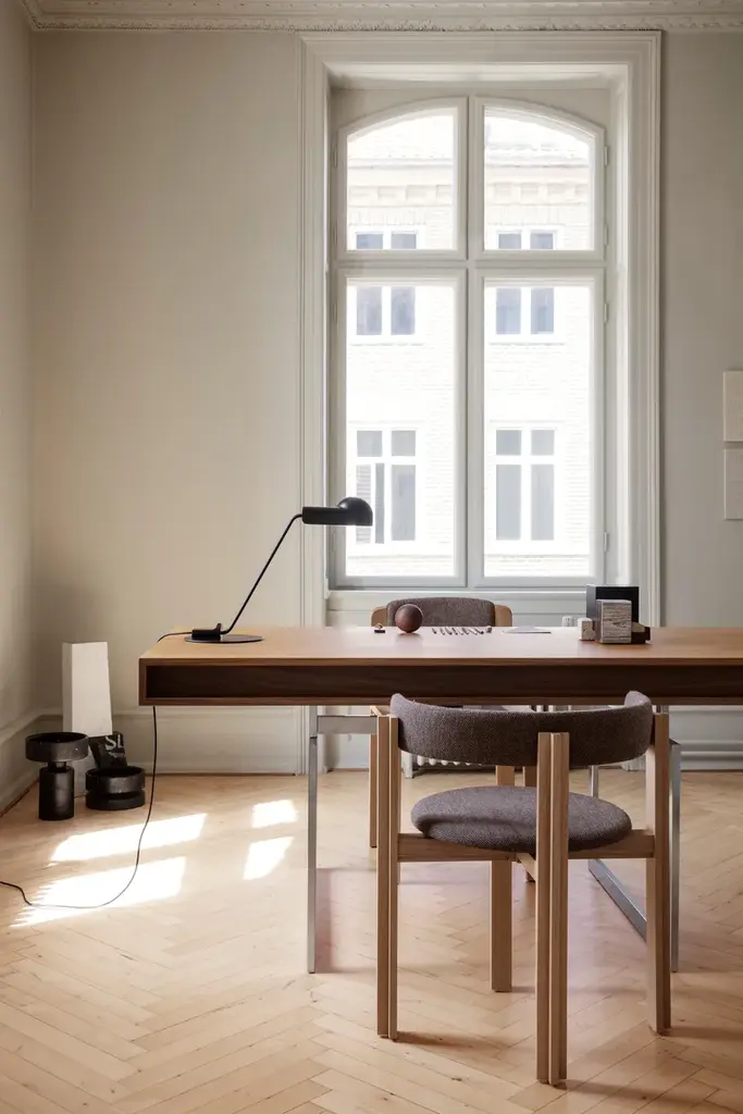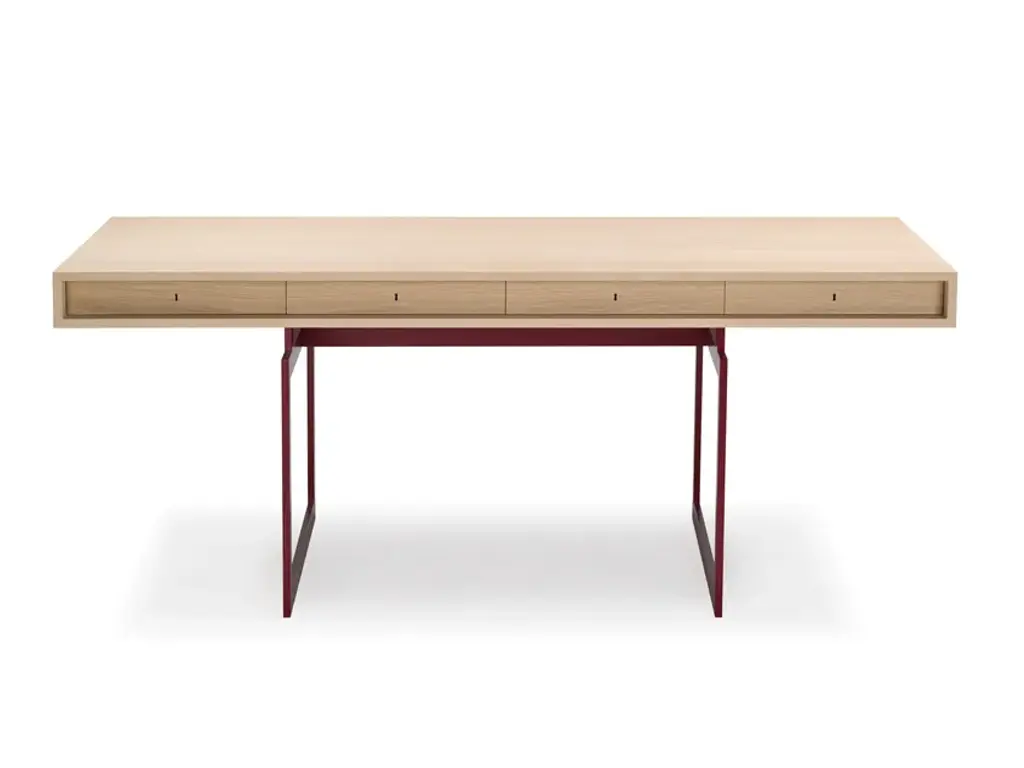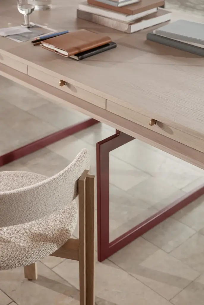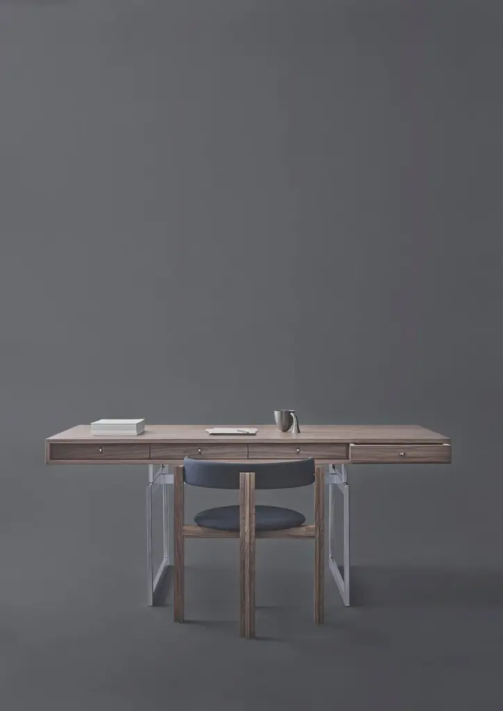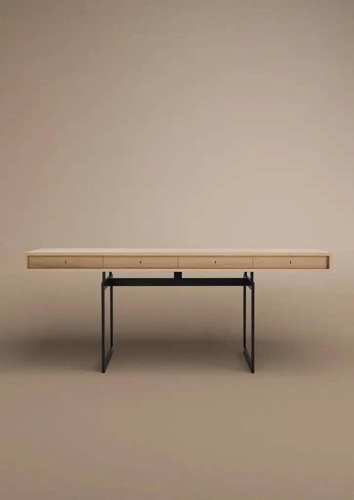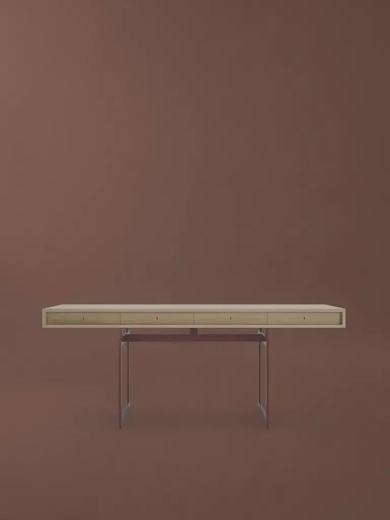 Karakter is proud to present Office Desk, their first design from a Danish designer. In this case, Danish architect, professor, and designer, Bodil Kjær. The iconic desk, designed in 1959, was the first of its kind with its pure and simplistic design, almost floating mid-air. Bodil Kjærs’ design has been called ‘The most beautiful desk in the world’ – or, the ‘James Bond desk’ as it was featured prominently in three early Bond movies.Material: Oak, oak veneer, aluColour: Red or grey lacquered frameFinish: Clear lacquered oak, lacquered alu