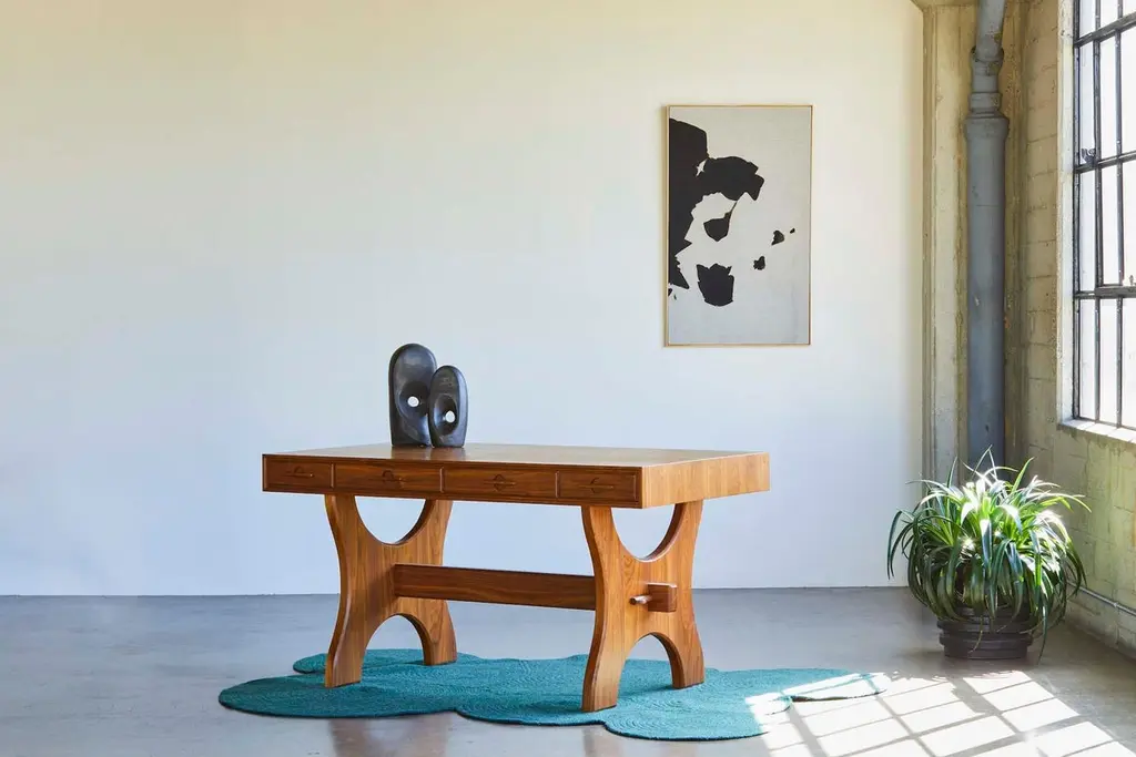 The Ojai desk has four drawers and features solid American walnut or white oak trestle legs. The drawer handles are made of solid carved wood. The Lawson-Fenning Ccollection is designed and handmade in Los Angeles, California. Reach out to discover what options are currently in stock.