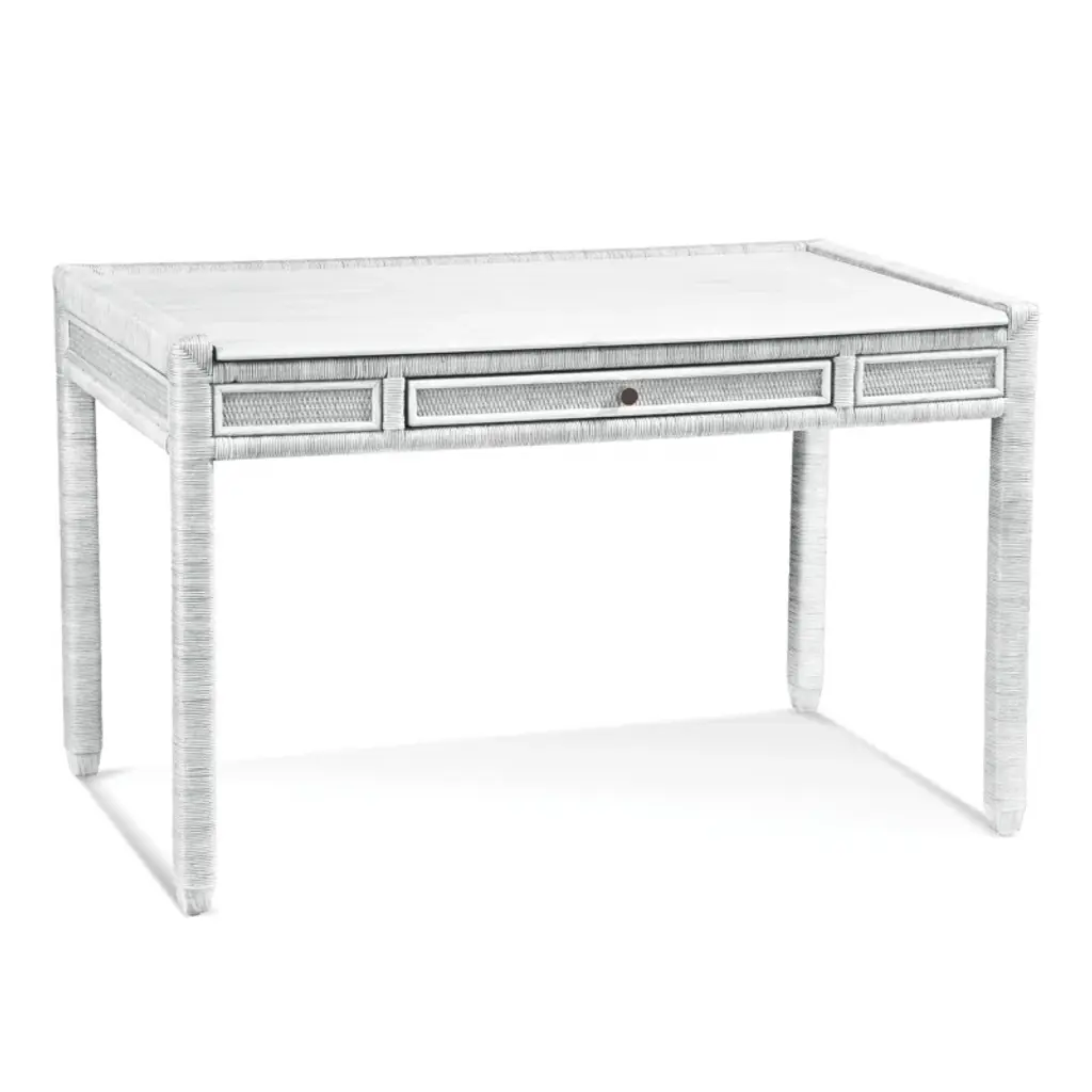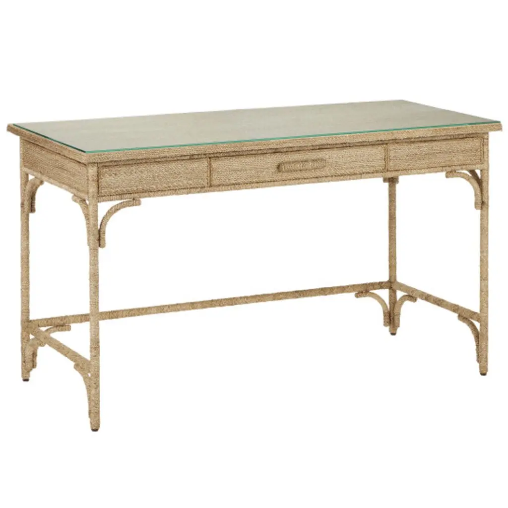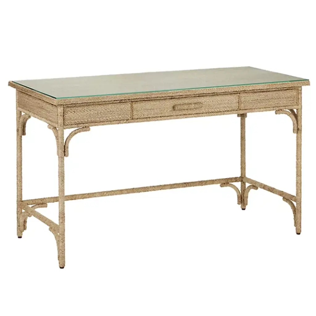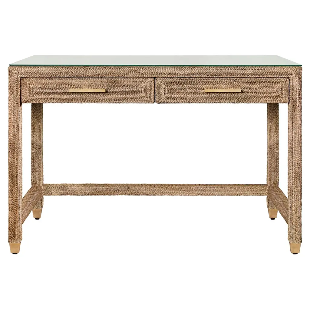 An earthy alternative to rattan and wicker, the Olisa Rope Desk is covered in braided abaca rope to bring a natural elegance to a room. The dexterity required to wrap a piece of furniture so skillfully makes this tan desk special. The artistic quality of this rope-wrapped desk makes it a stunning choice for a home office or a business-formal office in which style matters. This desk comes with a glass top that fits into the outer rim of the top and there is a beige finish inside its drawer. Aimee Kurzner designed this desk. The Olisa collection also includes a bar cart (sold separately). Ships In 7-10 Business Days This image is for illustrative purposes only. The colors shown are accurate within the constraints of lighting, photography, and the color accuracy of your screen.
