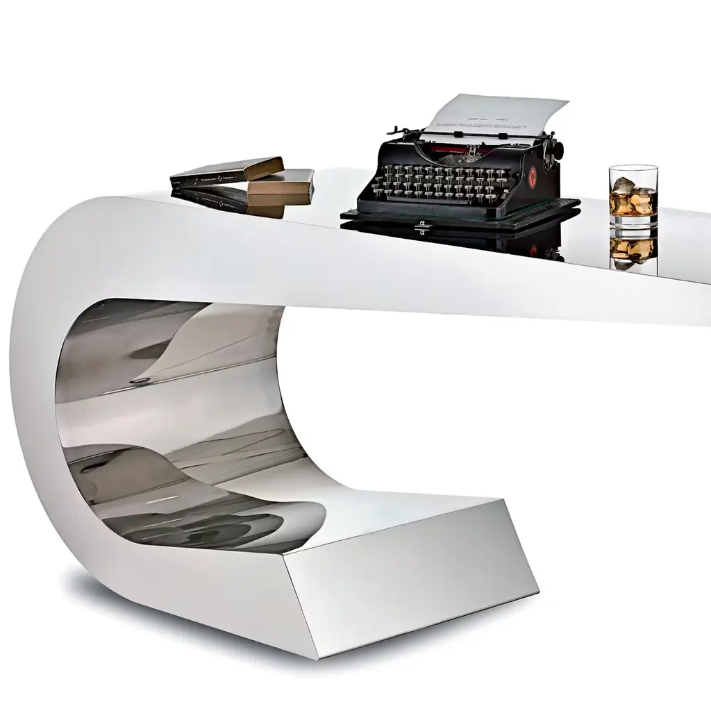 Aptly named Onda ("wave" in English), this remarkable desk's sinuous curves are fashioned of stainless steel with a stunning mirror finish that enhances the cantilever design.‎ This design by Giancarlo Pretazzoli is produced in a numbered series exclusively made to order.‎ It is available in two sizes (in cm): 183 x 55 x H 75 and mini 149 x 45 x H 73.