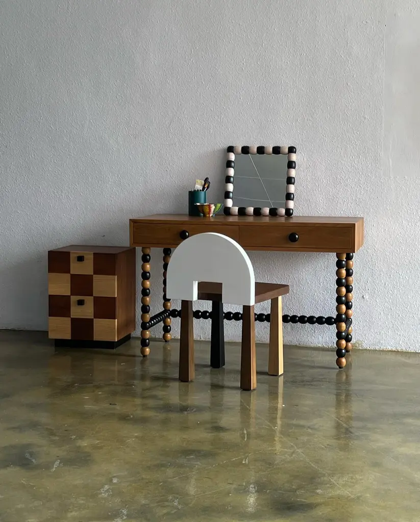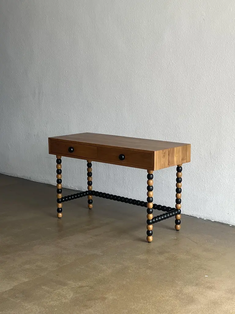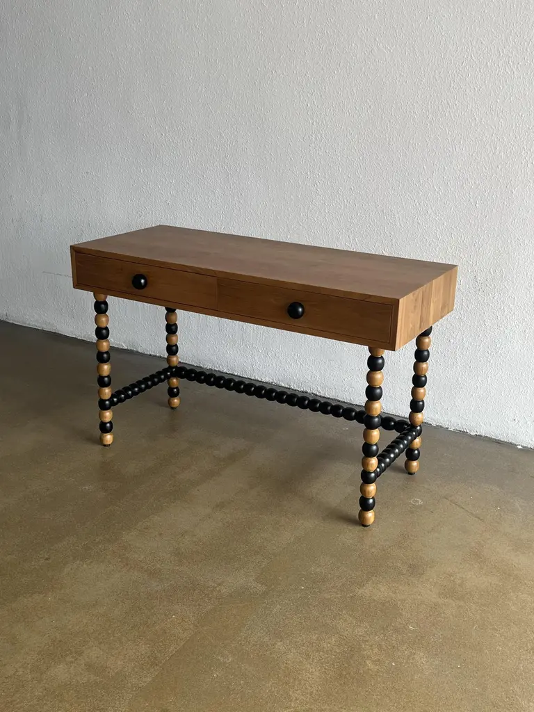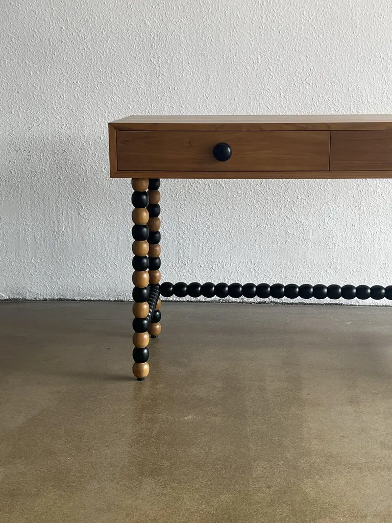 The Onde desk, designed by Studio Kallang in 2022, is a playful take on classic midcentury forms. Made in collaboration with generational artisans in Central Java, the desk is handcrafted from solid teak using traditional techniques and woodturning. Measures: L120 x D50 x H75 cm.Materials: Solid Teak.