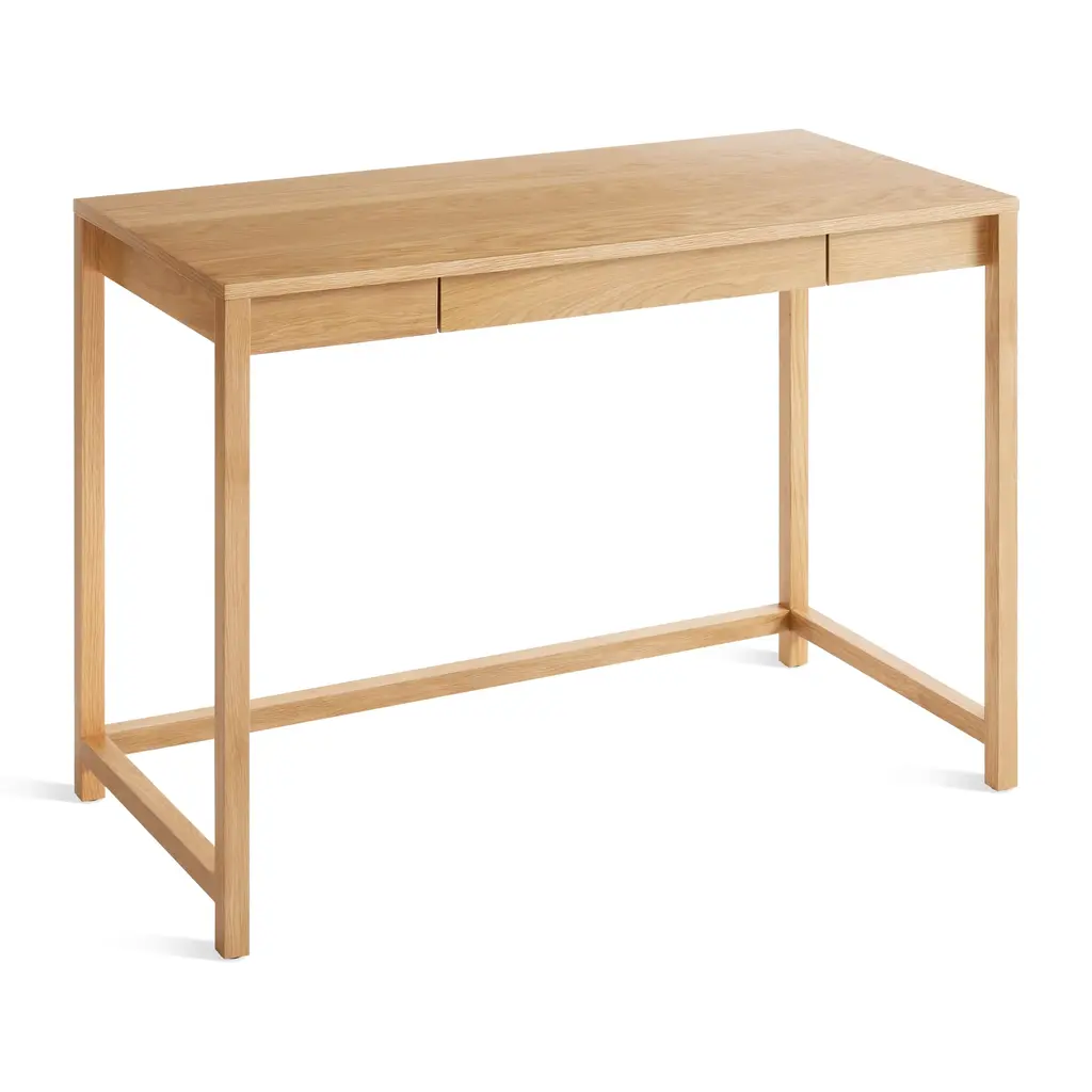 An architectural wood veneer frame and streamlined construction brings accessible style and functionality to your 9-to-5 with the Open Plan Desk from Blu Dot. An inconspicuous drawer provides ample space to store your supplies, while the rich finish lends a traditional feel to modern spaces. Adjustable feet help you stay level, topped with your laptop, storage pieces, and inspiring decor.Highlights