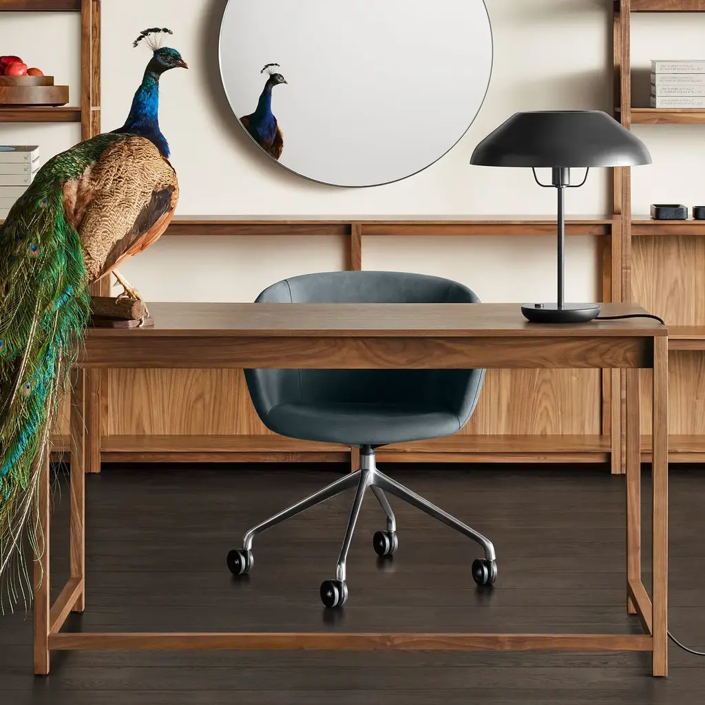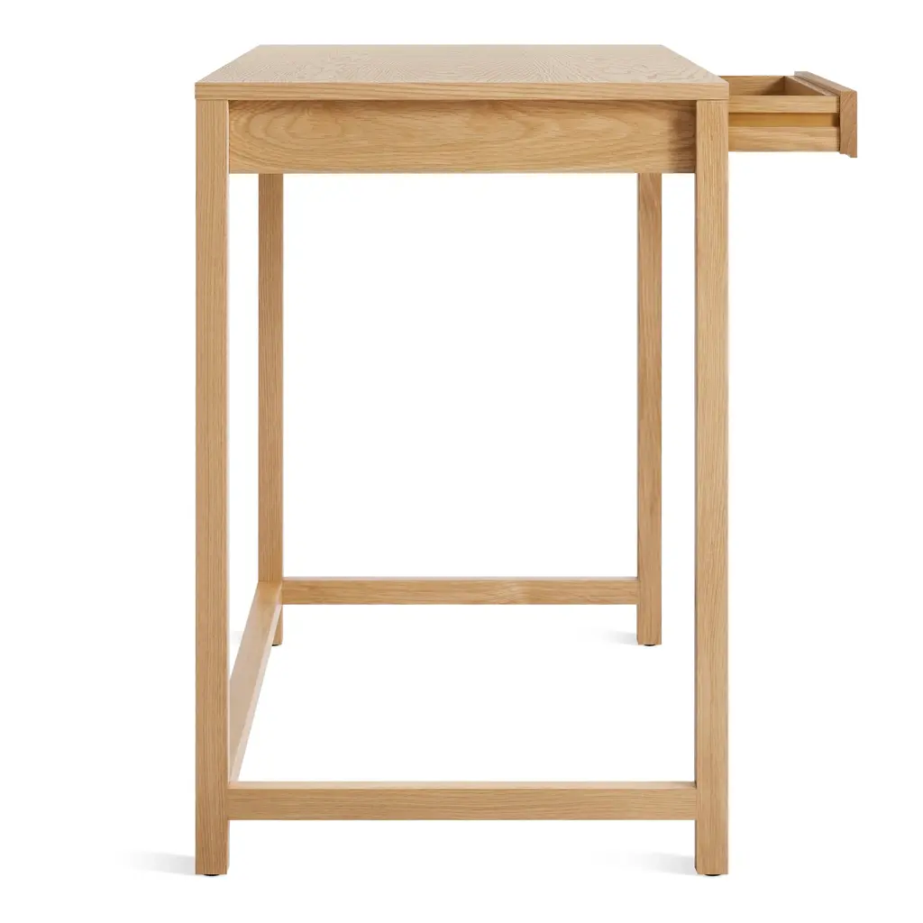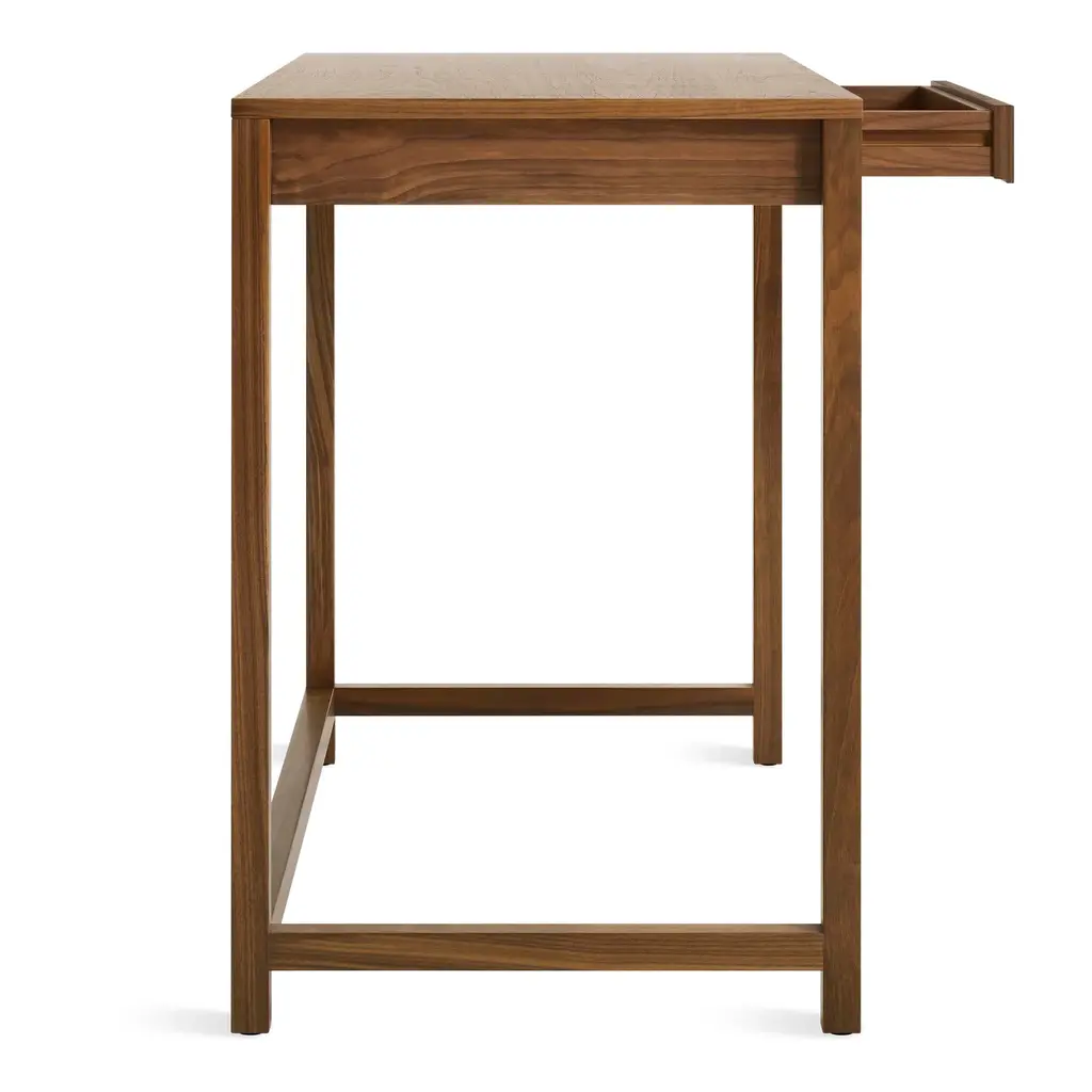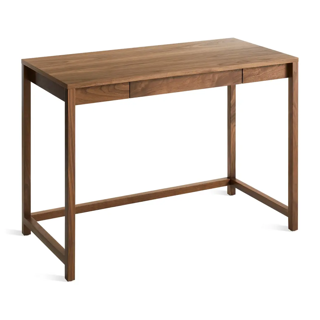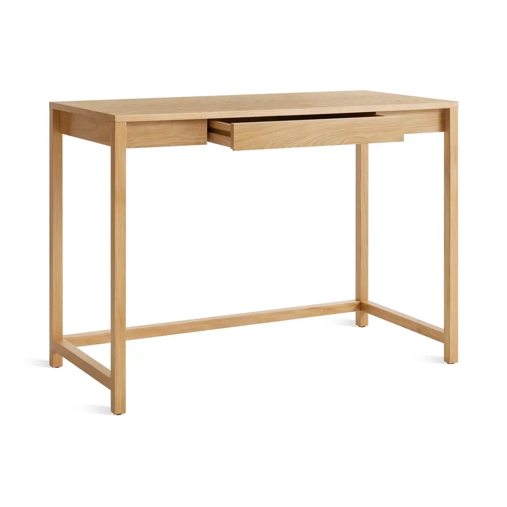An architectural wood veneer frame and streamlined construction brings accessible style and functionality to your 9-to-5 with the Open Plan Desk from Blu Dot. An inconspicuous drawer provides ample space to store your supplies, while the rich finish lends a traditional feel to modern spaces. Adjustable feet help you stay level, topped with your laptop, storage pieces, and inspiring decor.Highlights
