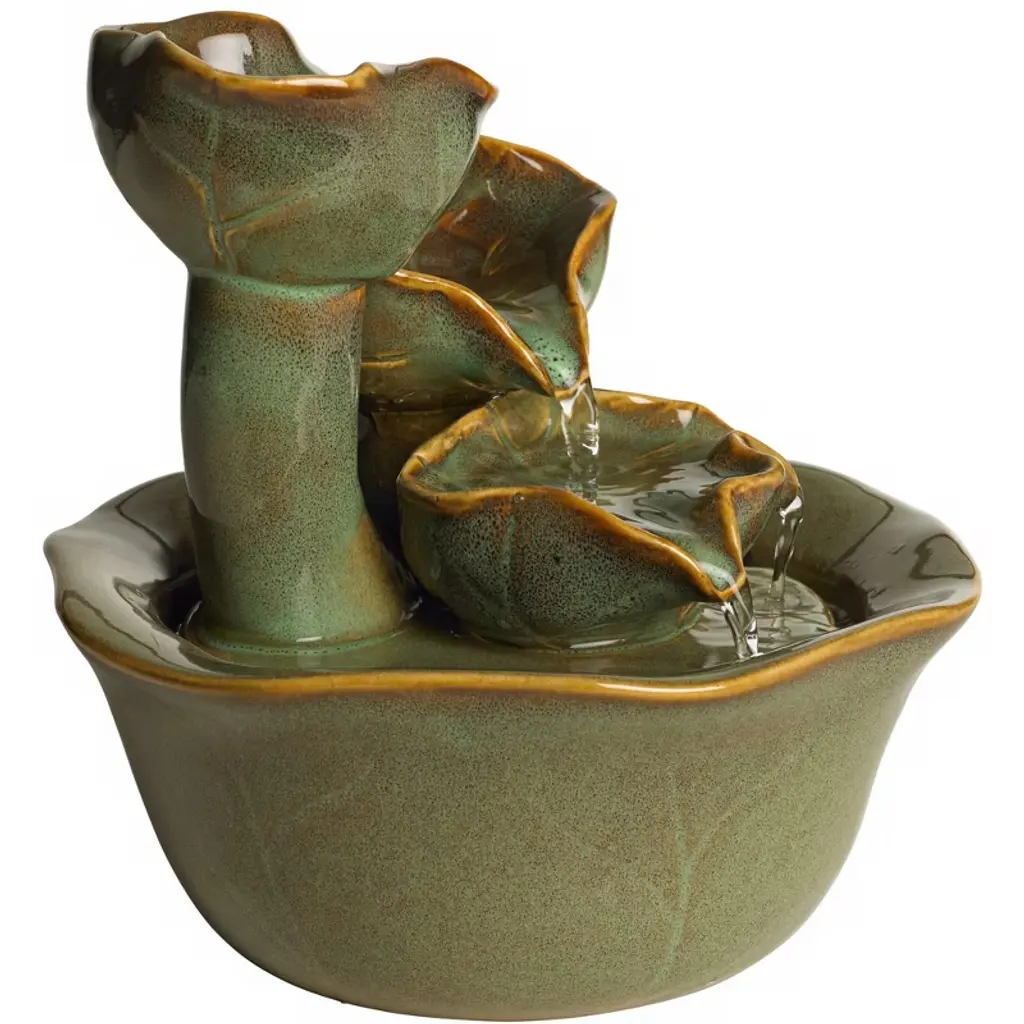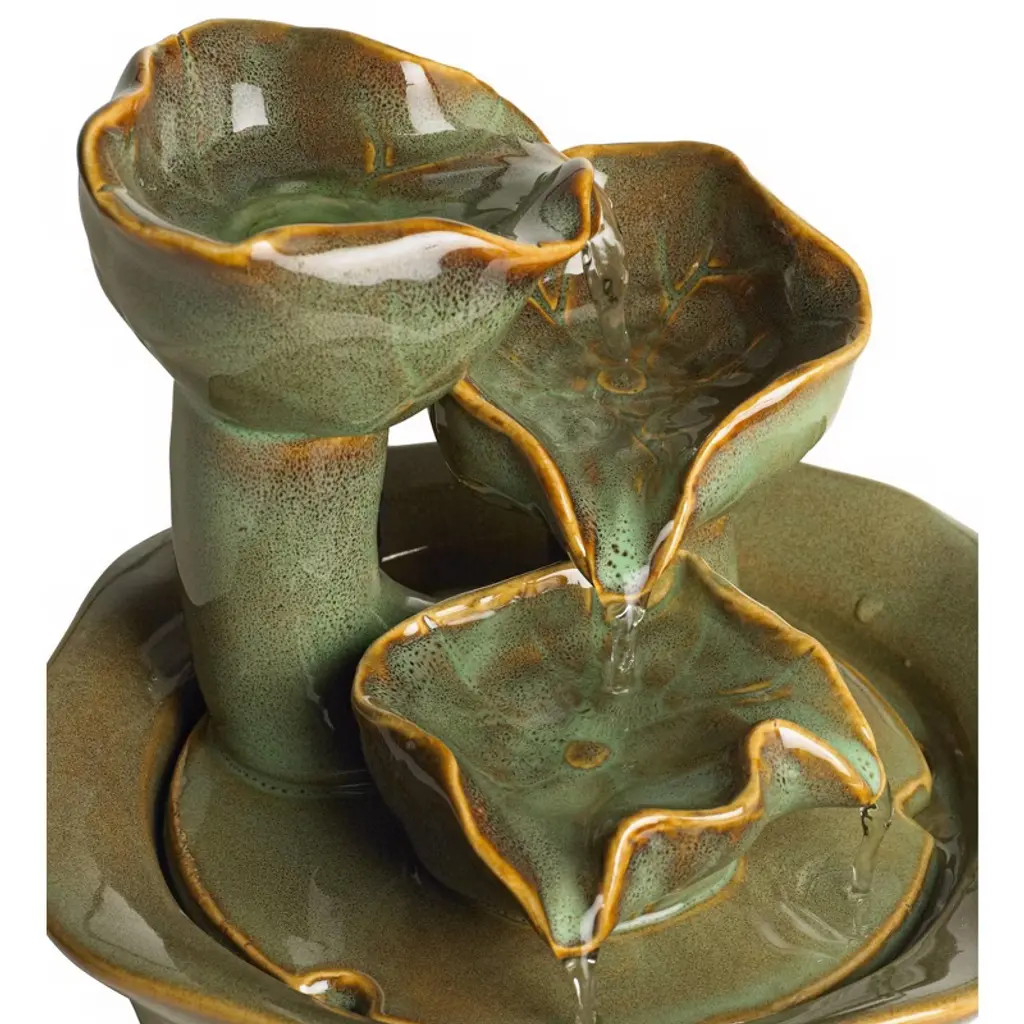 Give your home or work space a tranquil touch with this charming tabletop fountain design. Crafted from ceramic, with a natural edge, three water lilies rise up and trickle water elegantly from one tier to the next. Comes in an earthy glaze, and suitable for placement indoor or outdoor.