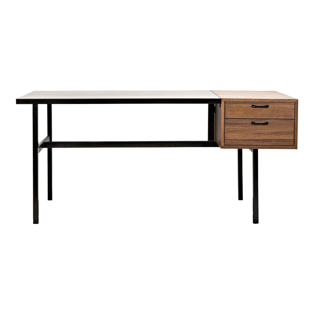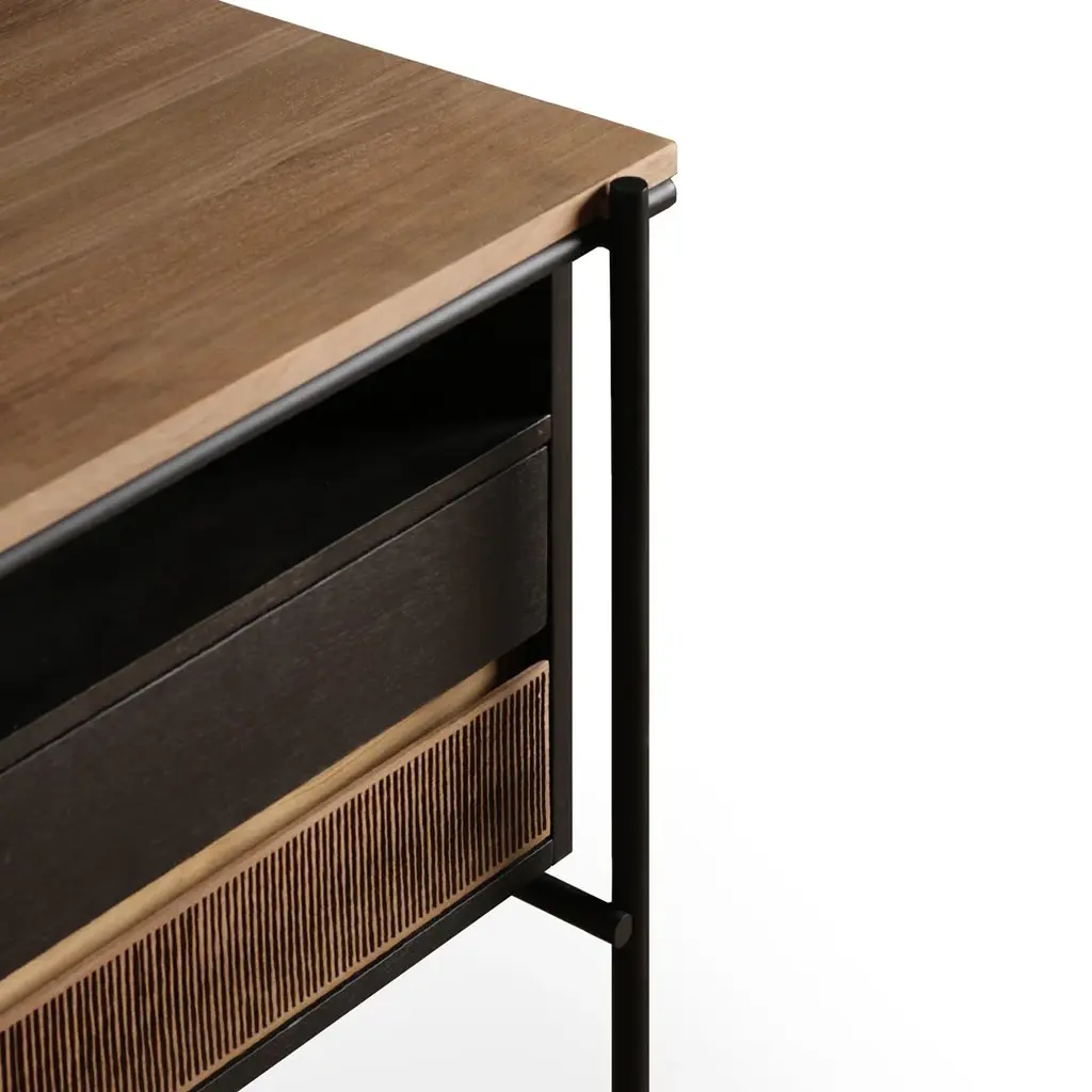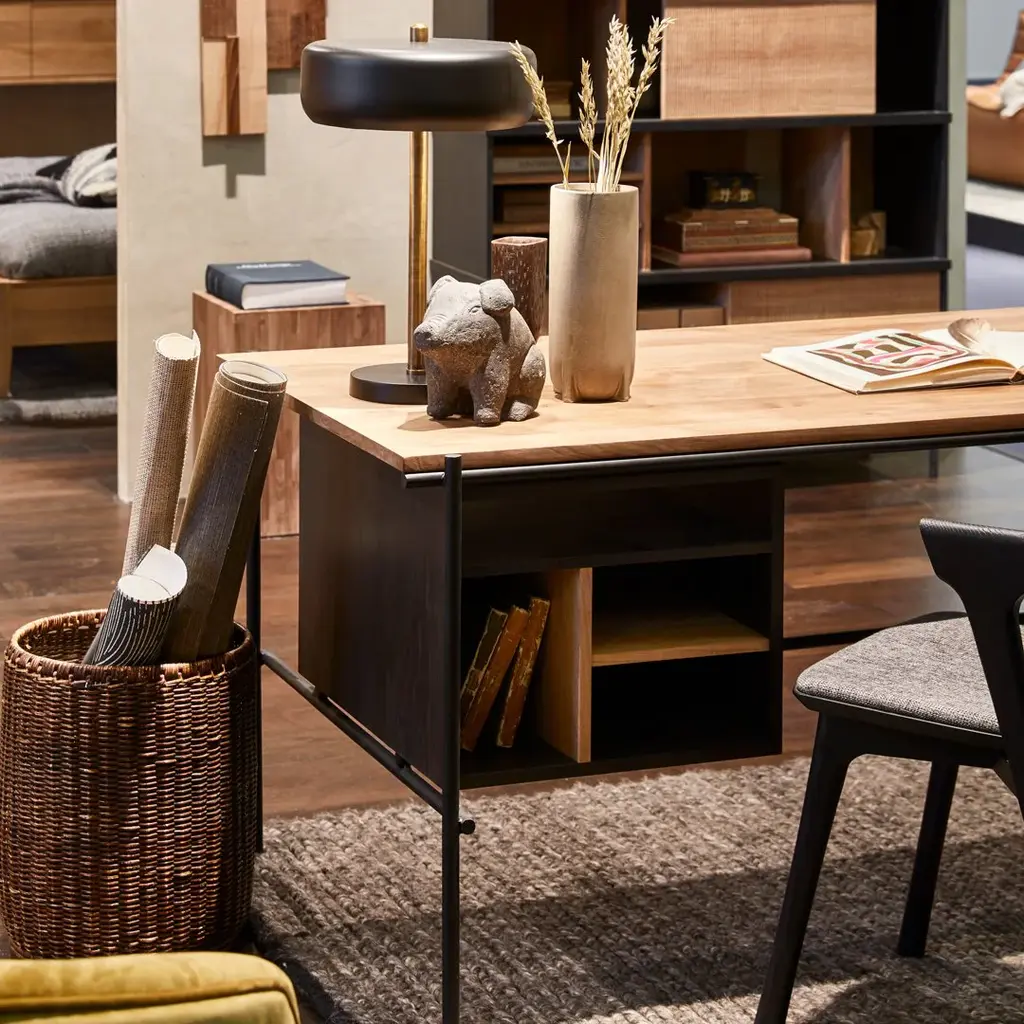 Some like a minimalistic look, others need more storage and organization. Whether you like the first or the latter: the Oscar desk is available with or without drawers. Made from teak with black metal legs and hand carved doors. Designed by Alain van Havre.