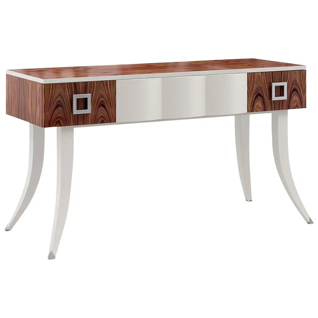 A remarkable piece of refined taste, this splendid writing desk with 3 drawers and push pull blumotion expertly combines tradition with modernity. The fabulous design of the new Oscar Collection adapts to settings with a contemporary and cosmopolitan flavor, as with this piece featuring elements in exquisite santos rosewood, finished with a lustrous polish and silver leaf detail.