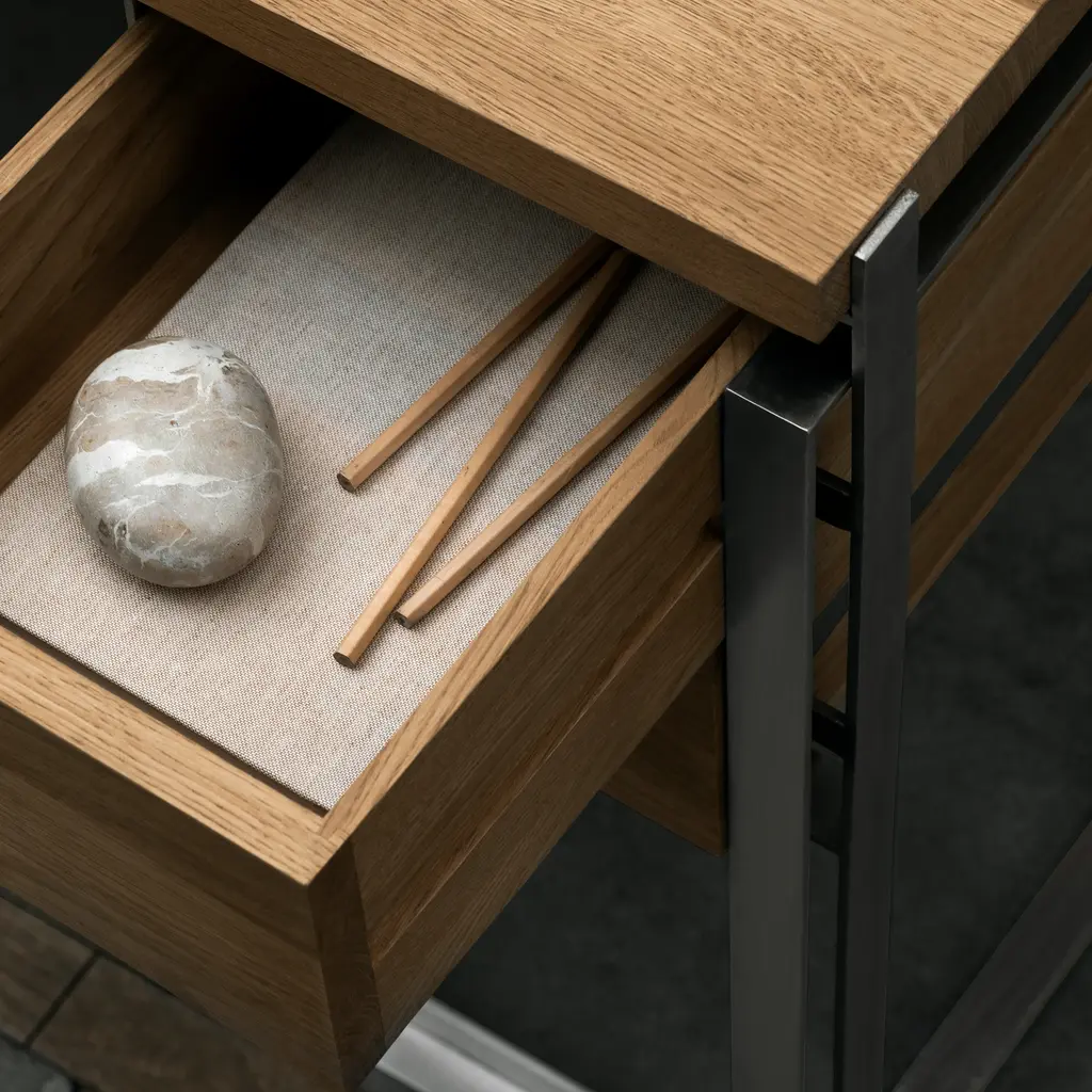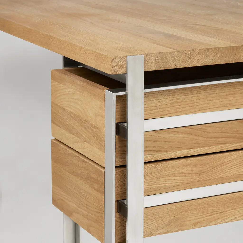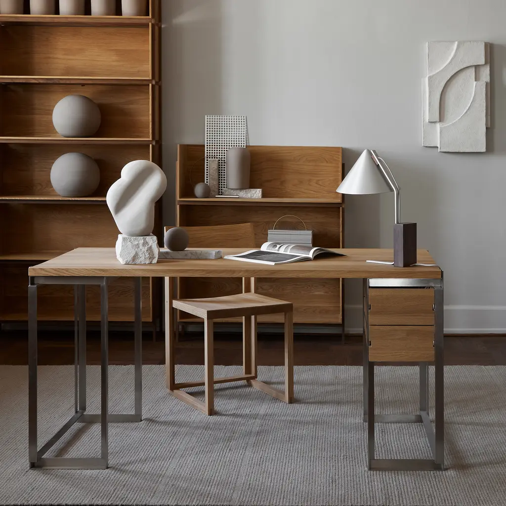 The Outline Desk is a functional, minimalistic desk designed by Kristina Dam Studio. It features a solid oak tabletop and drawers, which offer ample workspace and storage solutions. The Outline Desk features a robust steel frame, offering reliable support and enduring quality for a stable workspace. The design of the Outline Desk is straightforward, with clean lines and a clear architectural influence. The combination of oak and steel gives it a versatile appearance that can complement various decor styles, from modern to more traditional office environments. The oak provides a natural, warm aesthetic, while the steel frame adds a touch of industrial simplicity. This desk is suitable for both home and office use, offering a practical workspace solution. The Outline Desk’s compact and efficient design ensures it fits comfortably in diverse spaces, regardless of room size. The high-quality materials used in its construction ensure that it can withstand daily use, making it a reliable choice for anyone seeking a durable and functional desk.