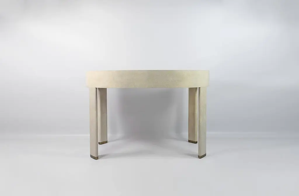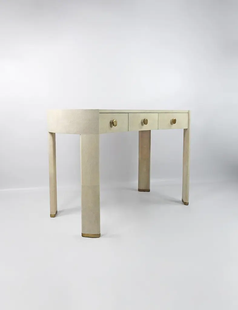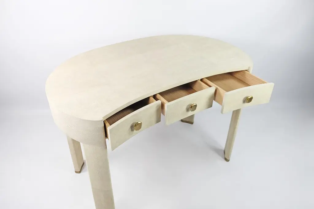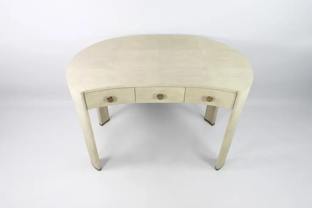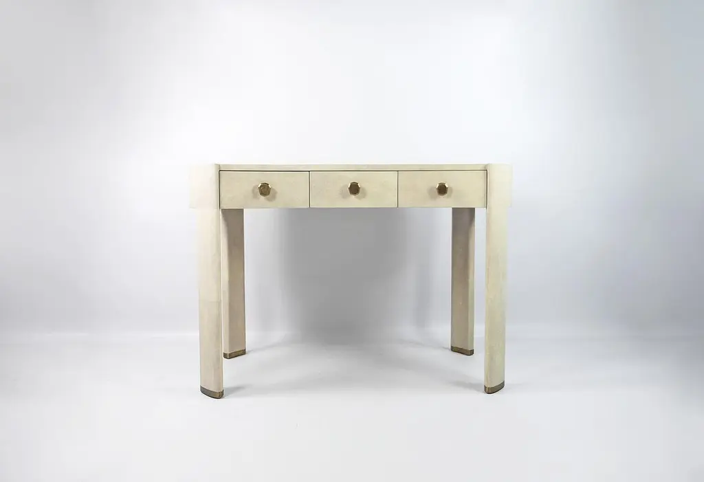 This desk is made of original shagreen in a natural colour, with brass caps on the legs.It has three drawers with brass handles.It can be used as a writing desk or as a vanity table in a bedroom.The dimensions of the table are W45.2" x 23.6" x H 29.5" (115x60x75cm)We can customize the size, and colors.Details and price upon request.Care instructions:Keep the materials dryTo clean, simply wipe with a dry clean clothDo not use any cleaning agent on the surfaceThis piece is 100% handmade by our talented master craftsmen.USA trade customers: This piece is made of shagreen and you will need to obtain a fish and wildlife licence to import it in the US (If you don't have one already).The cost is approximately 150$ and is delivered within 1 month.We can assist you with the procedure to obtain it.