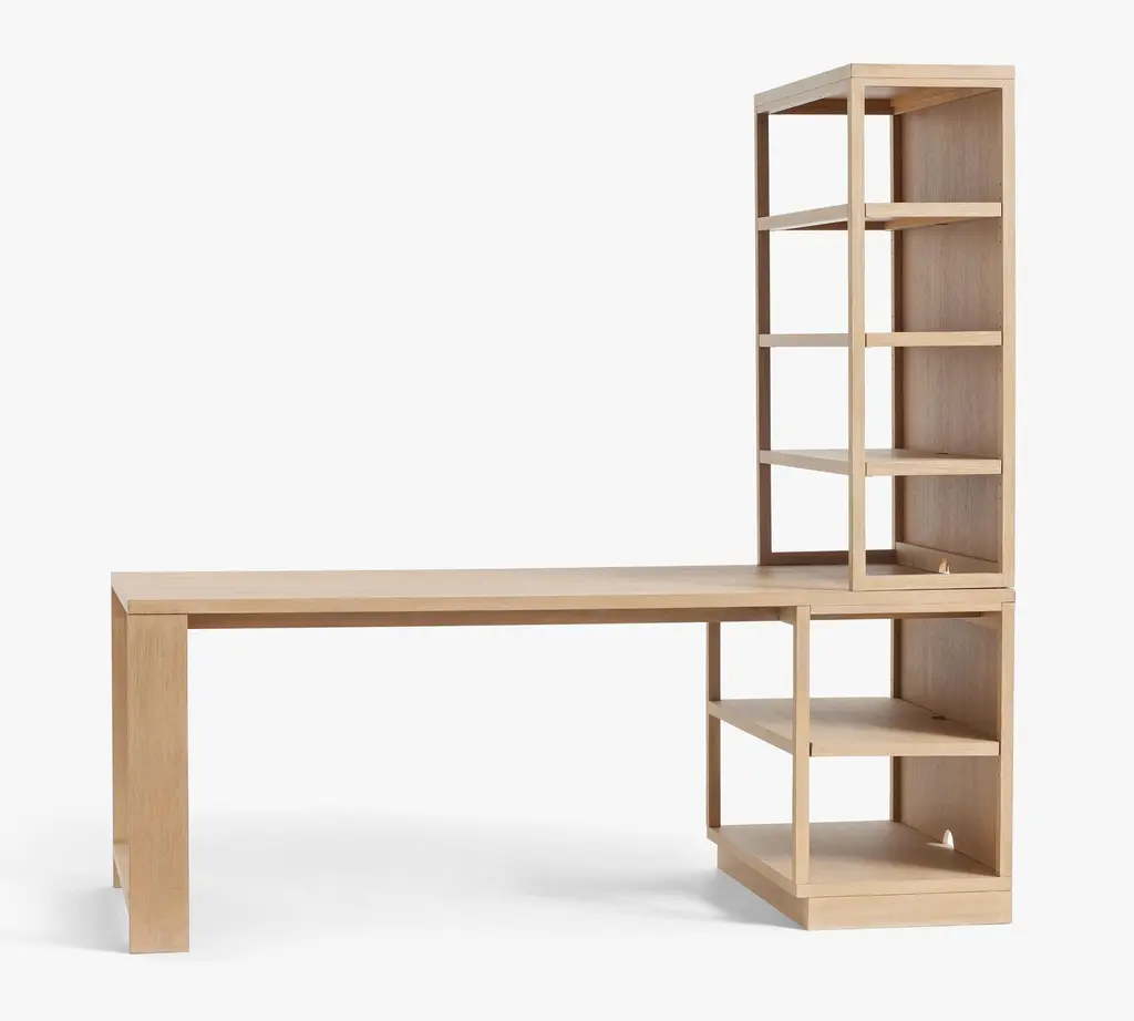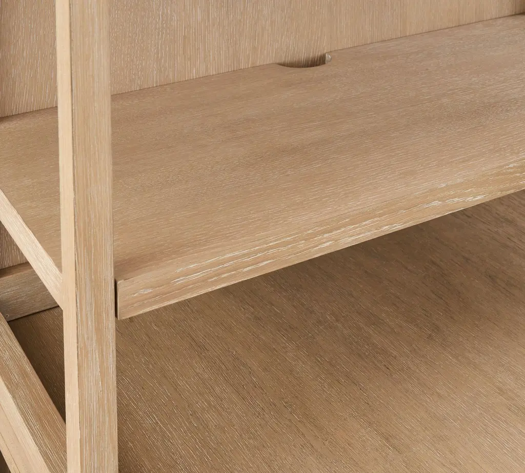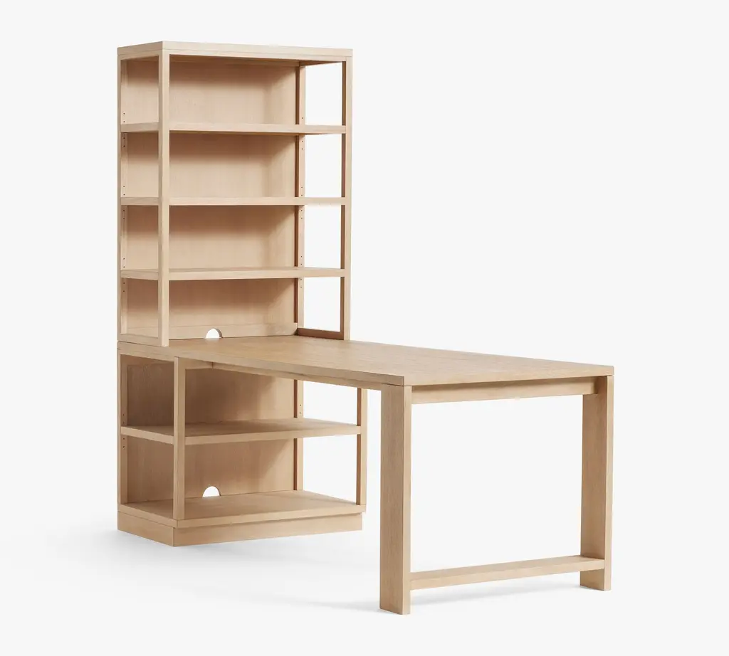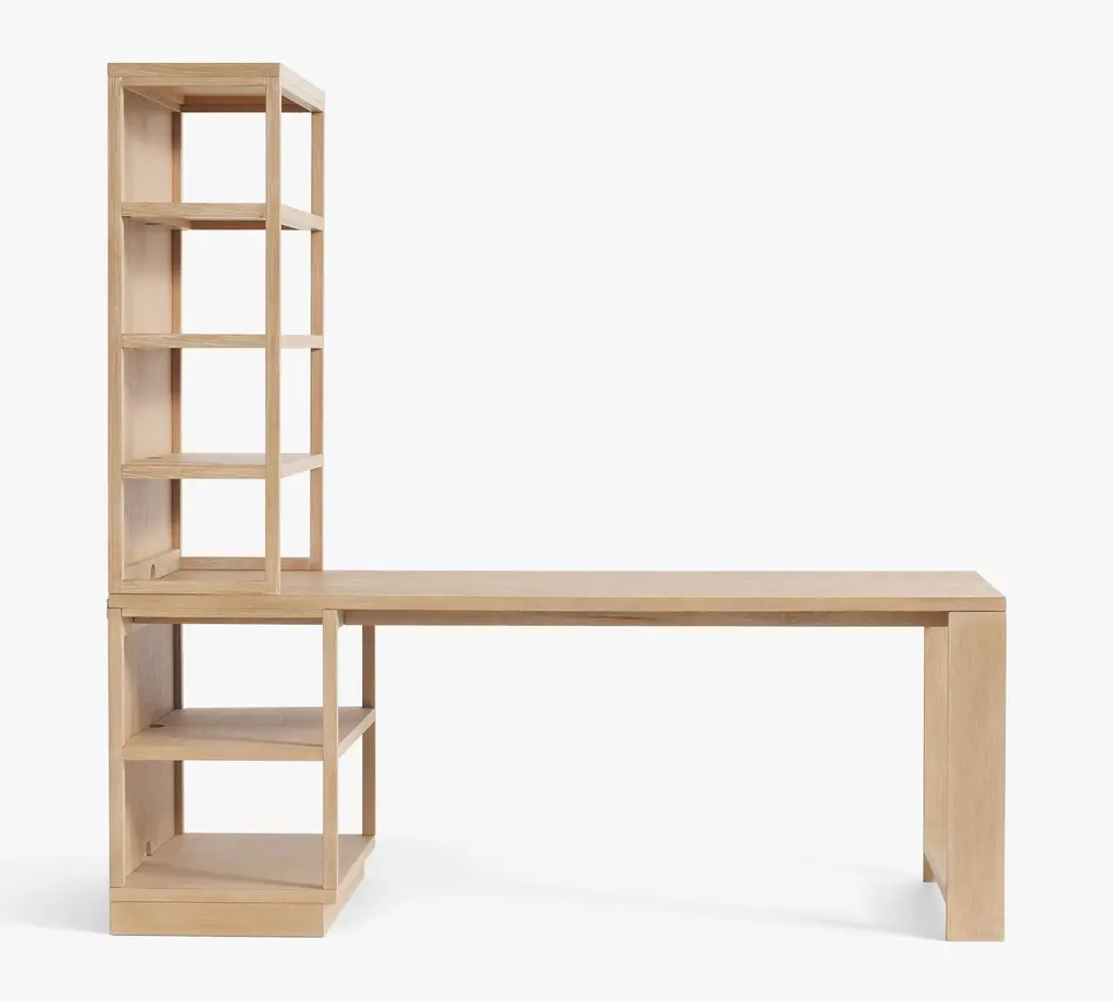 From the planked-style wood to its streamlined silhouette, Pacific emphasizes clean lines and an understated design that’s striking in its simplicity. This desk has a roomy central opening and plenty of open, easy-access storage and display. It also works seamlessly with other pieces in this modular collection.