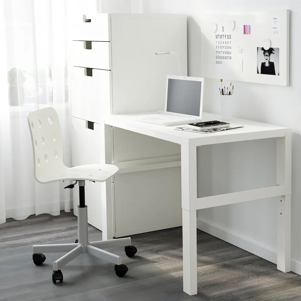 PÅHL Desk - white 37 3/4x22 7/8 ". This desk is designed to grow with your child, thanks to the three different heights. The desk is easily adjusted to 23¼", 25⅞" or 28⅜" by using the knobs on the legs.