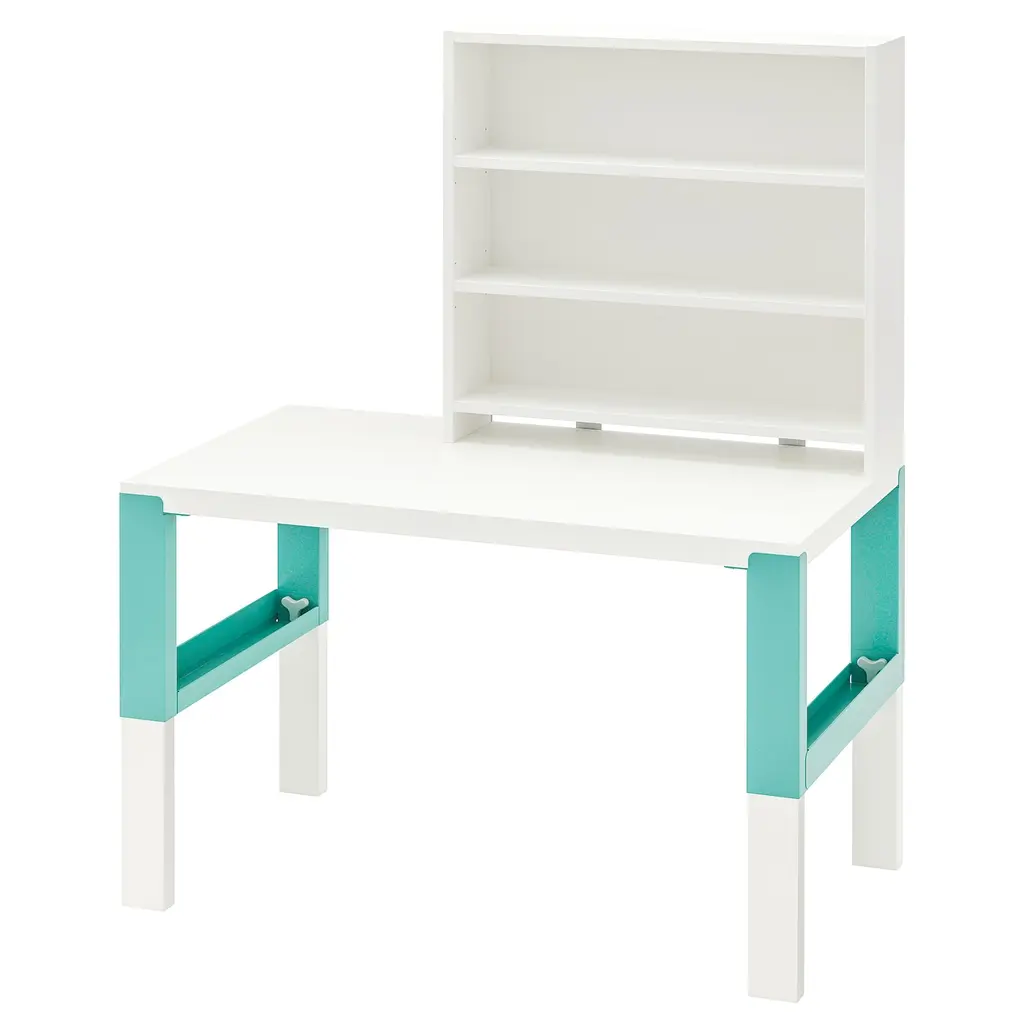 PÅHL Desk - white/turquoise 37 3/4x22 7/8 ". The desk is easily adjusted to 23, 26 or 28 inches by using the knobs on the legs. You can keep cables and extension cords organized by placing them in the cable holders between the front and back legs.