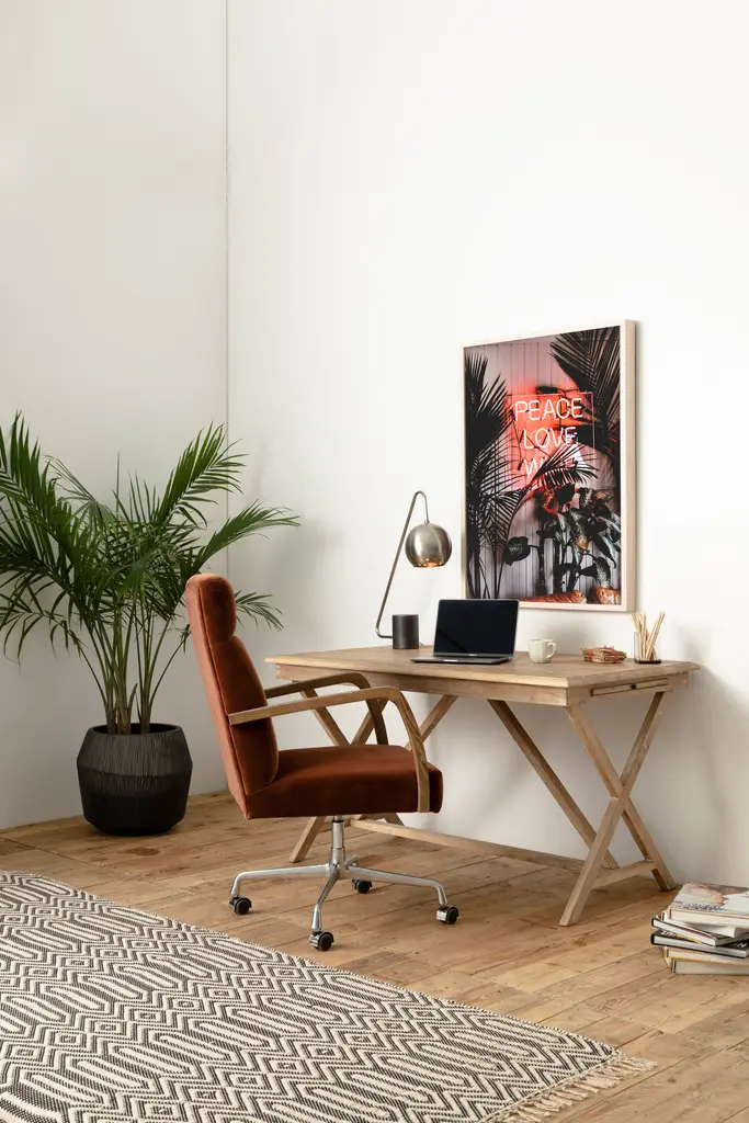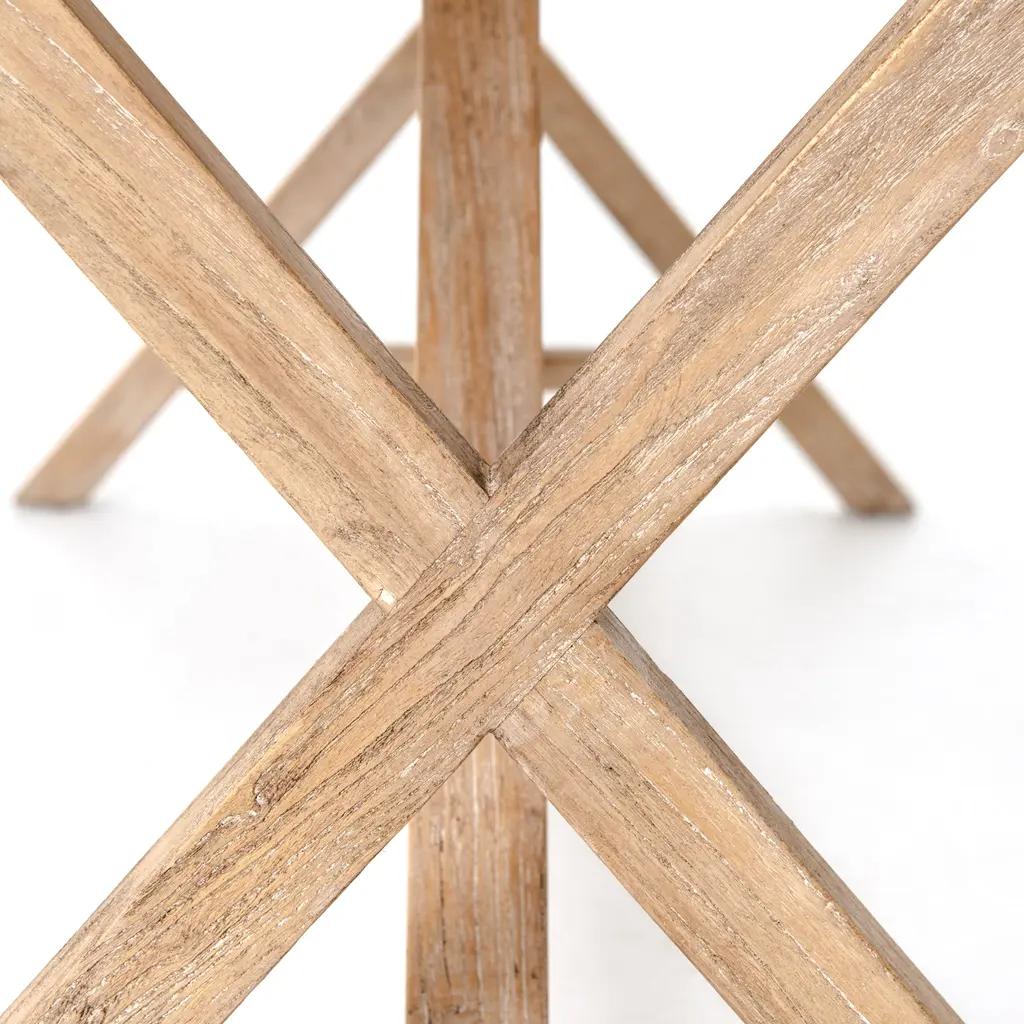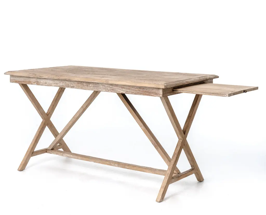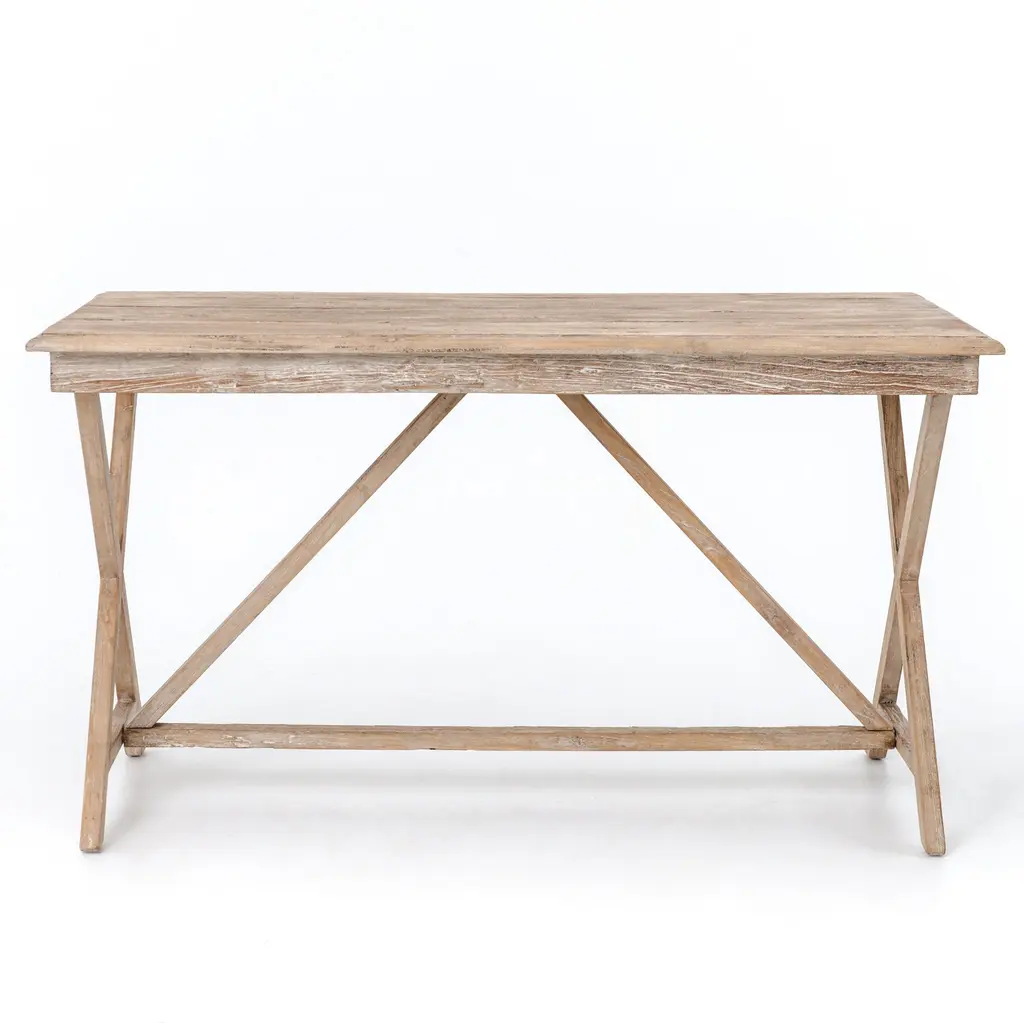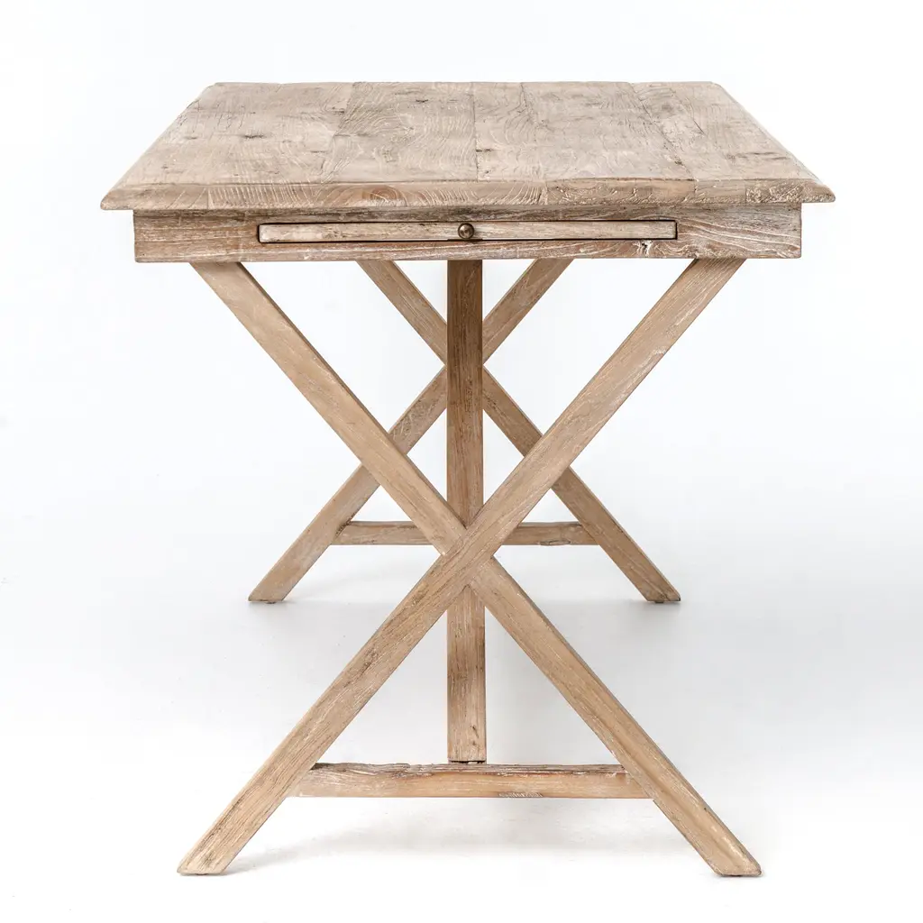 Criss-crossed and angled supports add architectural interest to a spare, French-inspired desk. A lightly whitewashed finish serves to bring out the warmth of the wood.