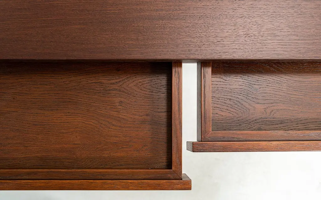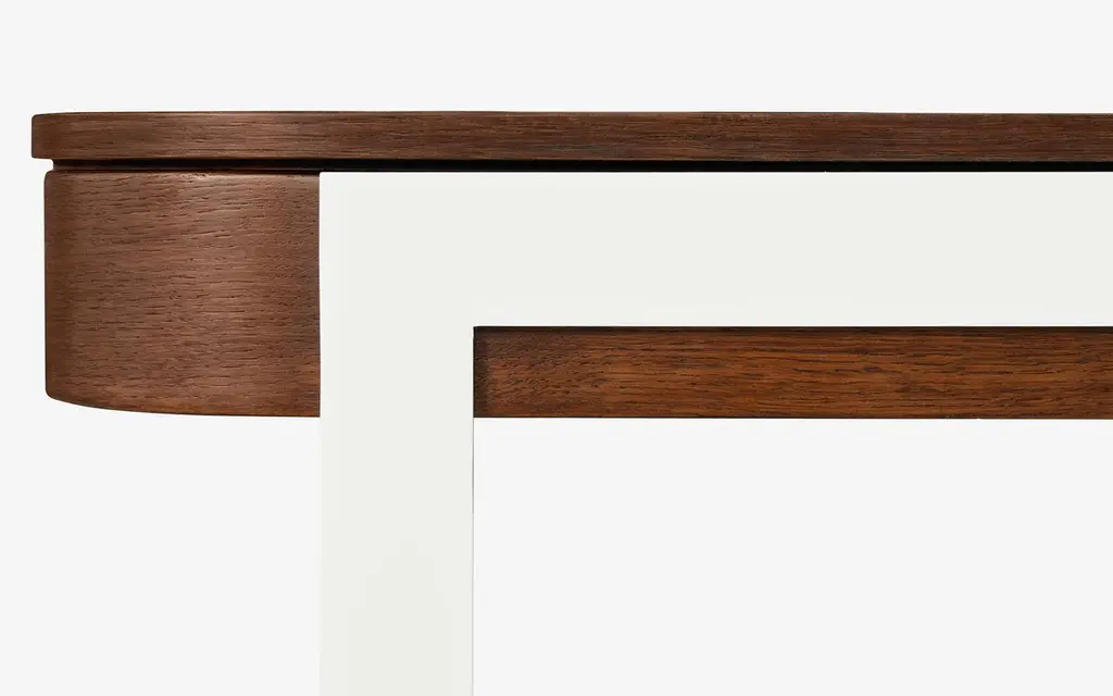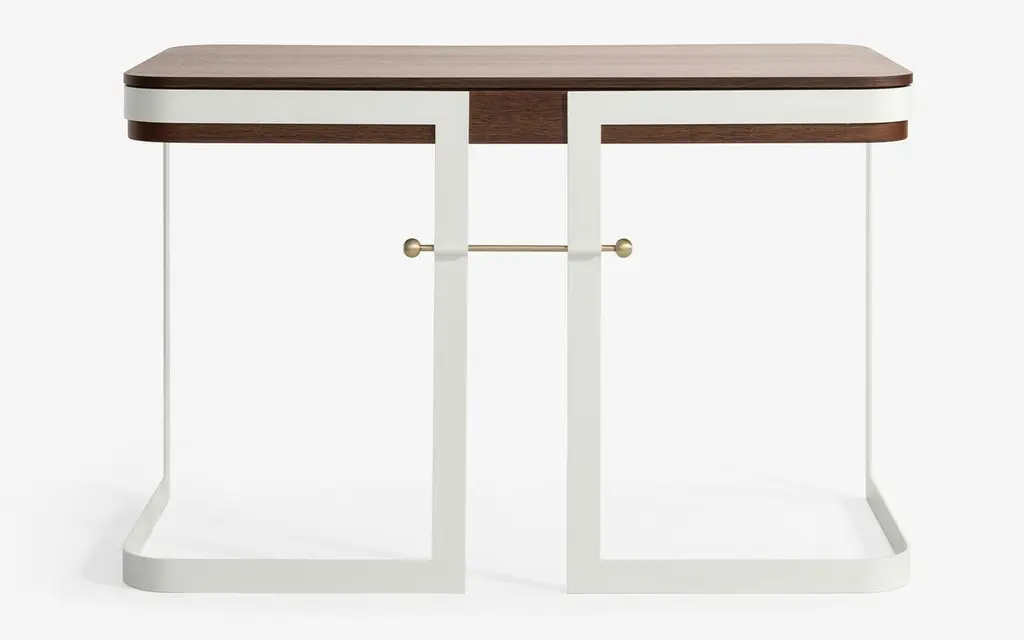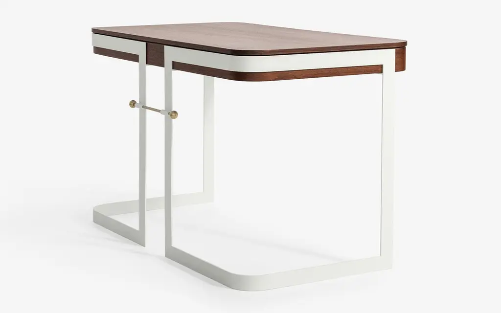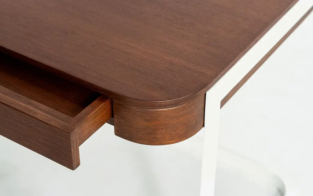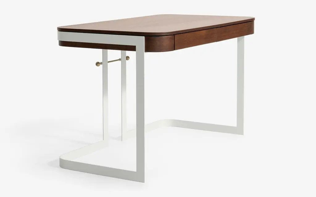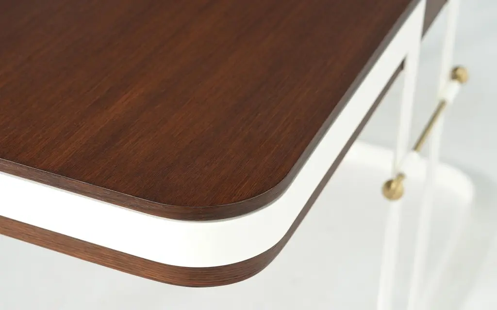 Part of the Papillonne collection, this desk is a special design that adds elegance to work spaces.Measuring 120 cm wide and 70 cm deep, this desk offers a large work surface. The dark polished top gives it both a high-quality and stylish appearance. Static painted metal legs add a modern atmosphere to the table, while brass-plated metal accessories reinforce the elegance of the design.The desk's two bottom-opening drawers provide an ideal storage space for computers and stationery. The space under the drawers allows work chairs to easily slide under the desk, saving space.Ideal for both home and office use, this table adds an elegant and subtle touch to your decoration.-1st Class Oak Veneer Dark Polished Top-Static Painted Metal Leg-Brass Plated Metal Accessory