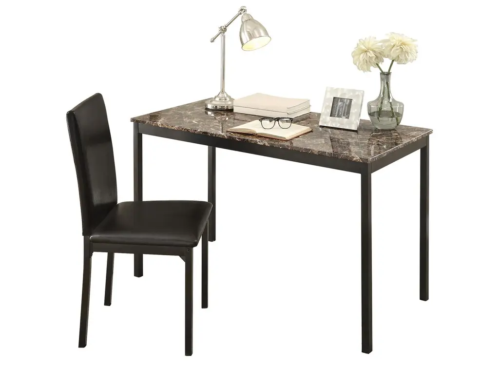 With a scale appropriate for any number of smaller home office spaces, dorms or bedrooms, the Paseo writing desk with chair will provide the look and style you want in your home. The transitional feel of the group comes from the richly hued faux marble desk top and the minimalistic design of the accompanying dark brown bi-cast vinyl desk chair.