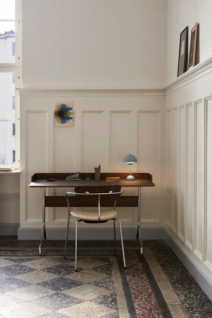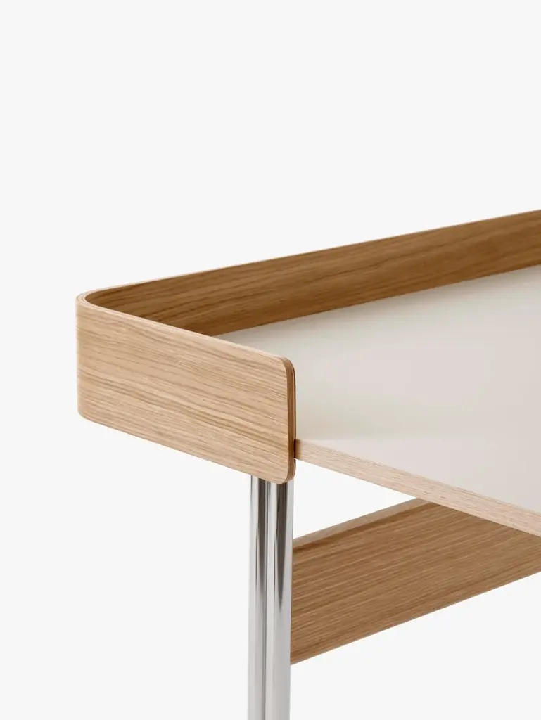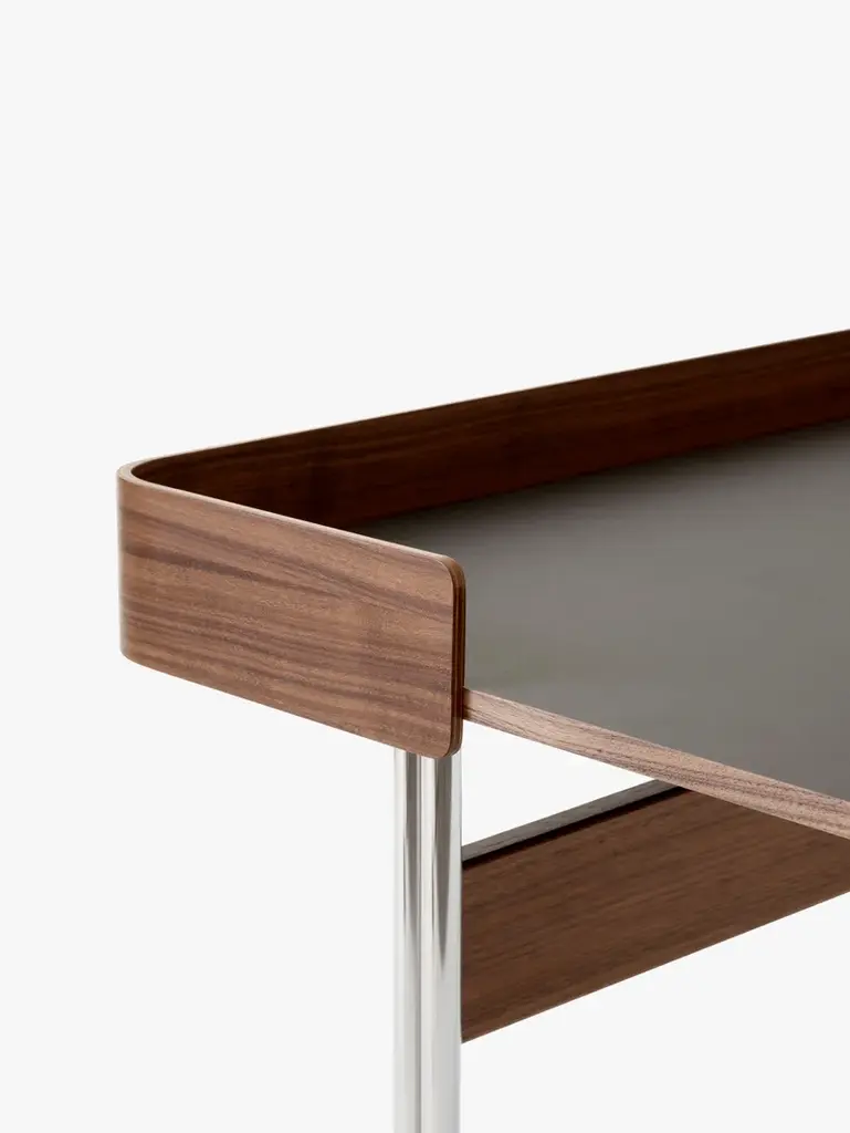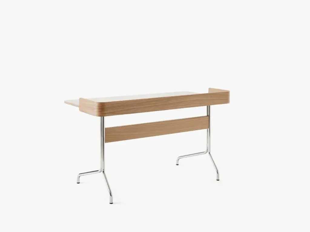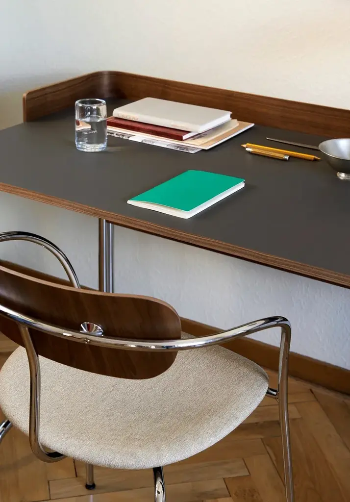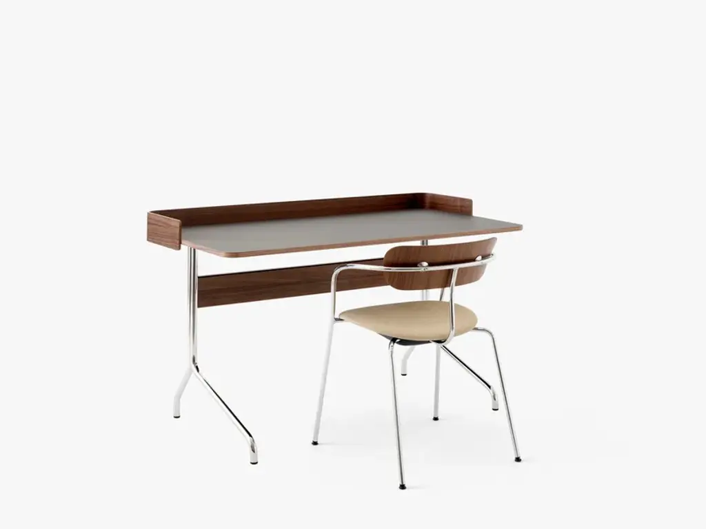 When Anderssen & Voll created their Pavilion chair series, the award-winning duo drew their design cues from the iconic Langelinie Pavilion. Now, this light and lyrical aesthetic has been translated into a compact desk intended to suit both office and home spaces. Designed at the start of the pandemic, the Pavilion desk took the demands of home-working into consideration with a version that boasts a back panel.MaterialSteel, wood veneer, formpressed wood veneer, Forbo linoleum.Production ProcessThe Pavilion Desk is made of a tabletop laminated with linoleum and veneered edges. The legs are made from bent steel tubes. The backboard is made from formpressed veneer.Tabletop FinishesMushroom Linoleum w. lacquered oakIron Linoleum w. lacquered walnutMetal FinishesChromeManufacturerProduced in Denmark by Kvist Industries A/S