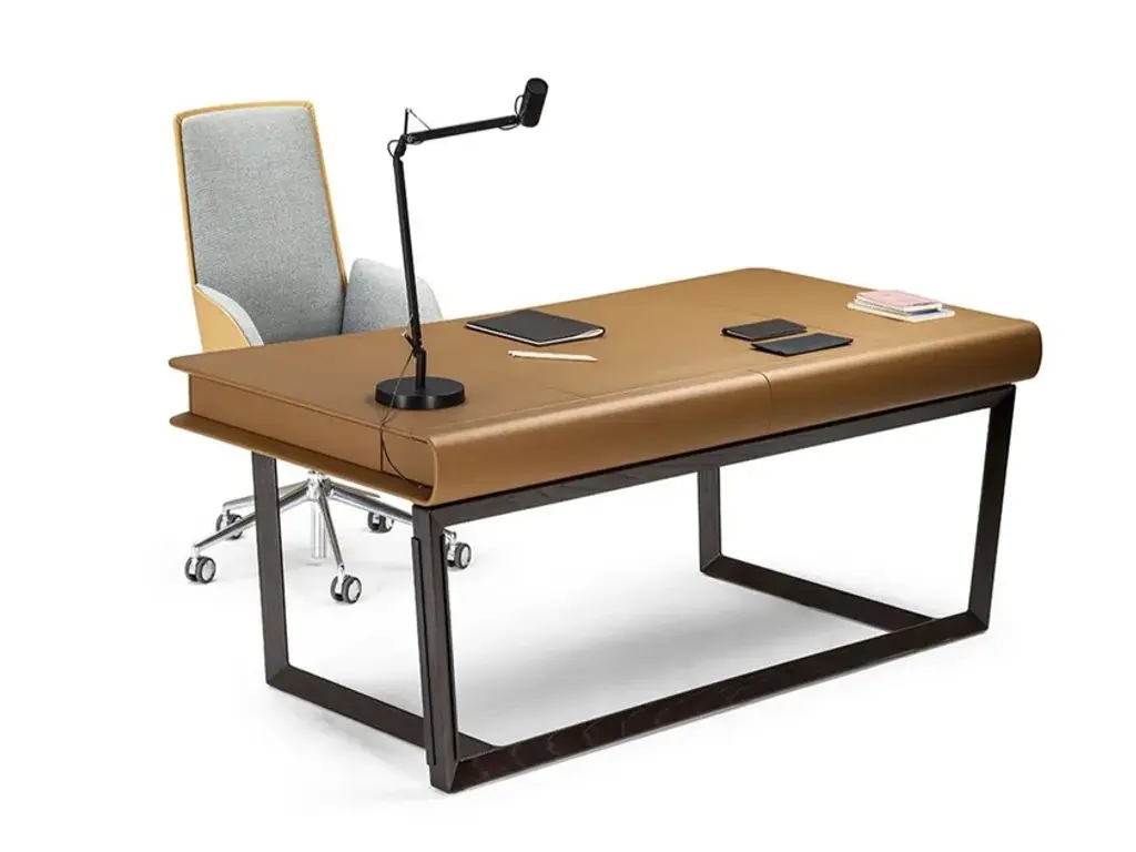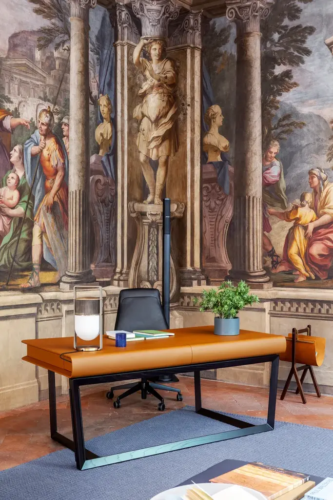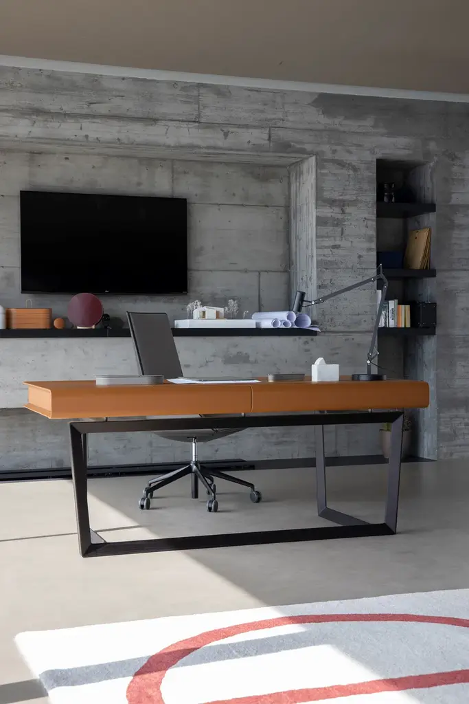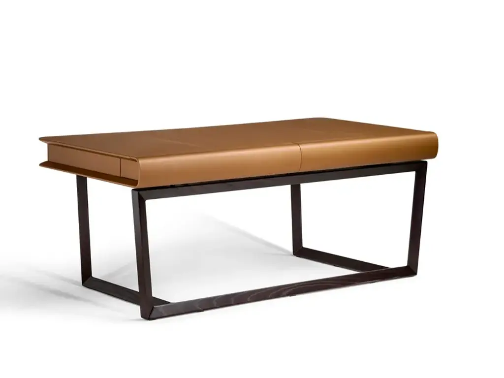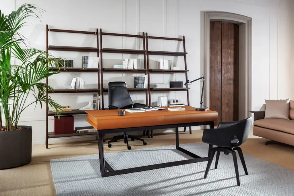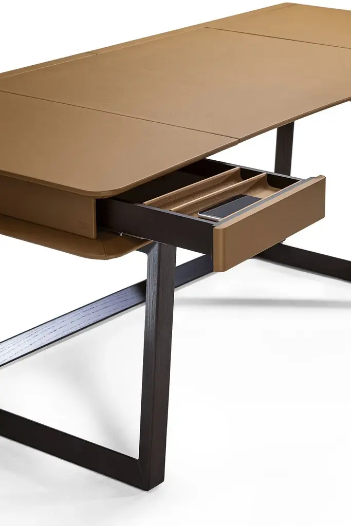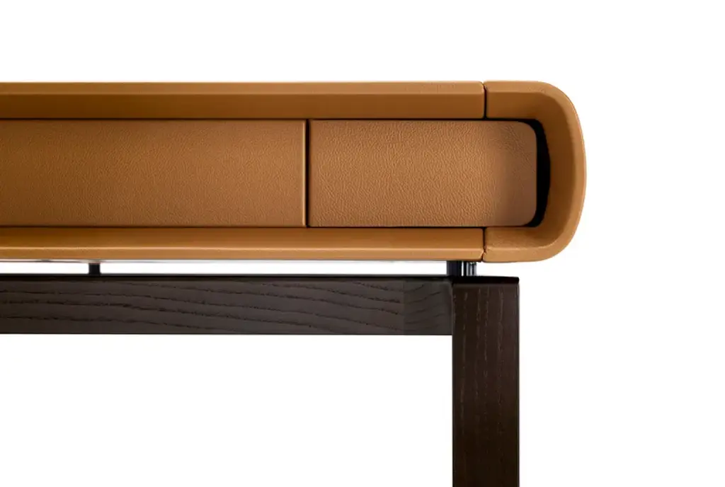 Designed by Roberto Lazzeroni, the Peek-a-Book desk embodies all of the typical elegance and comfort of a Poltrona Frau office, ushering it into the domestic setting. Lazzeroni envisages a generous work surface and a design that revisits the materials, warmth and style of his residential collections while at the same time guaranteeing all of the functions of a “genuine” office desk.The Peek-a-Book desk consists of an extremely simple sheet of poplar plywood covered in Pelle Frau® leather which is curved and folded in two to form the base and the desktop, as well as to accommodate two drawers. The visual effect is that of a valuable leather-bound book that symbolises the function of the object. In fact, the desk is a place for thinking, collecting our thoughts and looking back over our memories: the most intimate and personal side of the person that uses it to study or work.The base structure consists of an easel made from triangular-section solid ash in a moka or wenge stain which forms three trapezium-shaped supports connected to each other with fine joints created in the wood. The front of the two drawers is in MDF covered in Pelle Frau® leather matching the upholstery of the top, while the internal structure is made from solid ash in a wenge stain. The upholstery of the top, the front of the drawers, the side walls and the doors accessing the rear compartments is in Pelle Frau® ColorSphere. The upholstery of the top is produced using a particular covering technique without any visible stitching.Behind the two central drawers, the Peek-a-Book desk has two side flaps that conceal a hollow space. The compartments are designed to act as a conduit for cables and can be used to house multi-sockets or electric cables with Schuko or USB.It is also possible to install a smartphone induction charger under the leather upholstery of the desktop, as suggested by the branded logo.