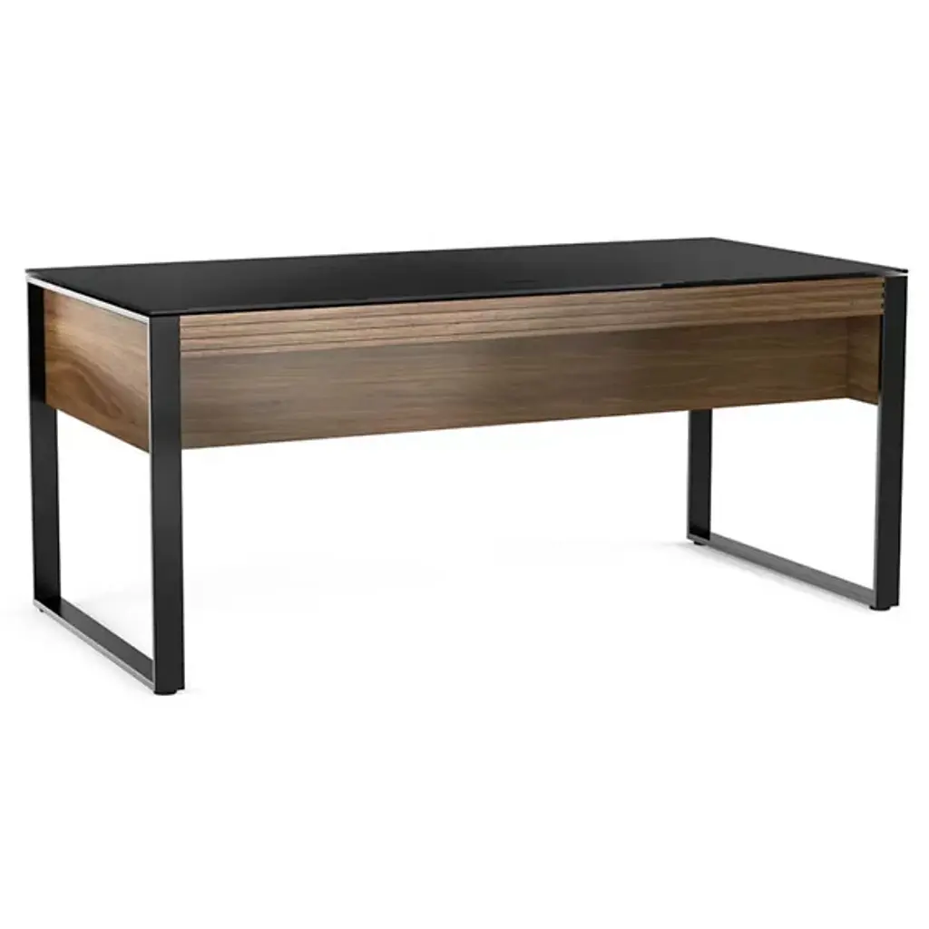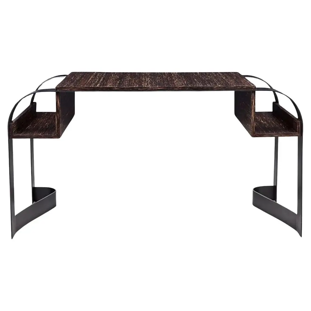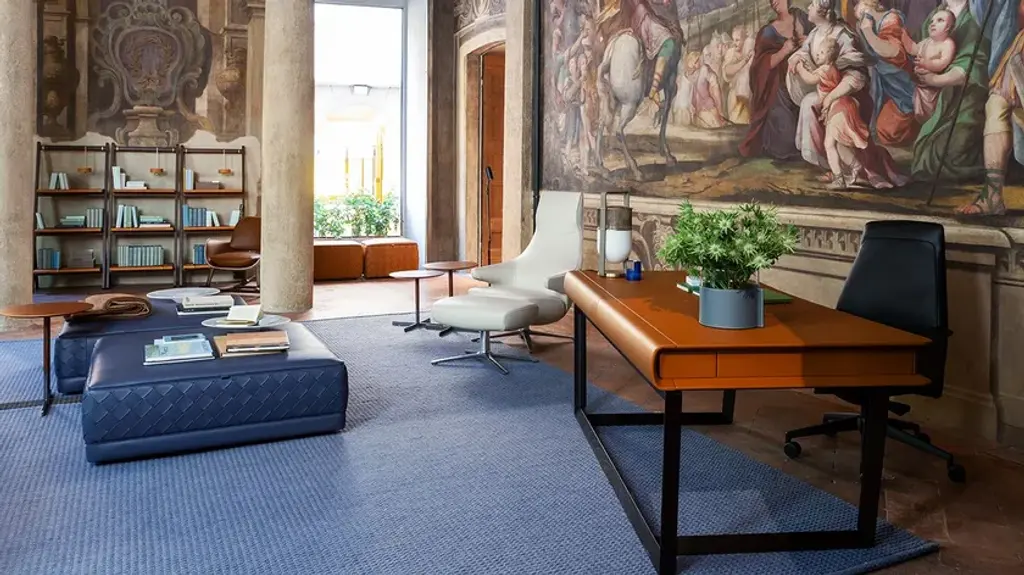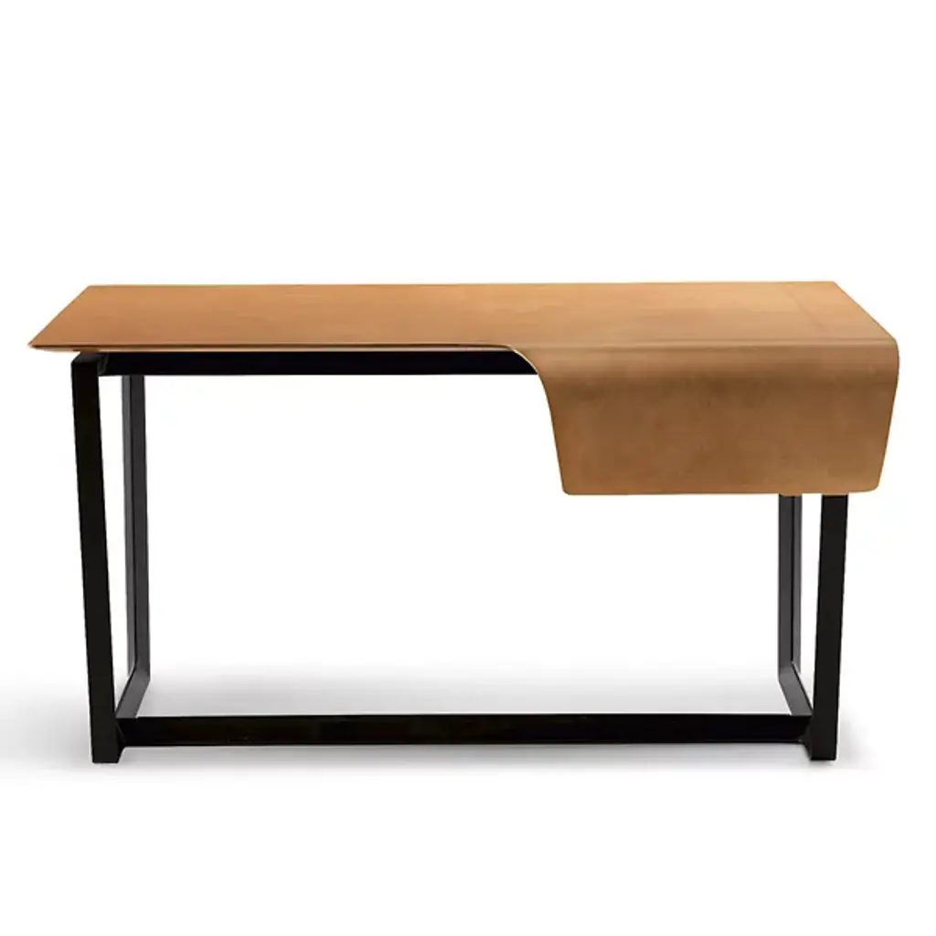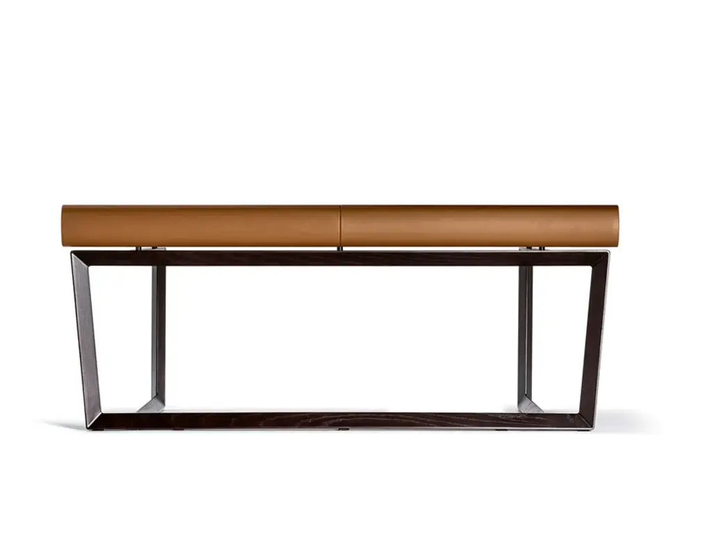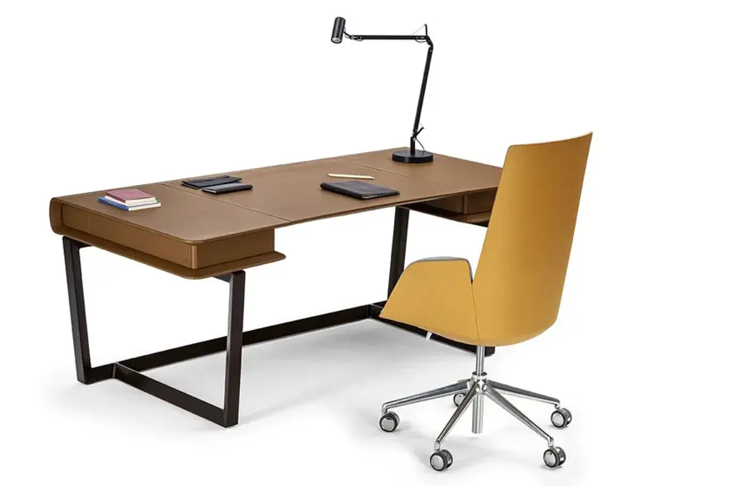 Designed by Roberto Lazzeroni, the Peek-a-Book desk embodies all of the typical elegance and comfort of a Poltrona Frau office, ushering it into the domestic setting. Lazzeroni envisages a generous work surface and a design that revisits the materials, warmth and style of his residential collections while at the same time guaranteeing all of the functions of a “genuine” office desk.The Peek-a-Book desk consists of an extremely simple sheet of poplar plywood covered in Pelle Frau® leather which is curved and folded in two to form the base and the desktop, as well as to accommodate two drawers. The visual effect is that of a valuable leather-bound book that symbolises the function of the object. In fact, the desk is a place for thinking, collecting our thoughts and looking back over our memories: the most intimate and personal side of the person that uses it to study or work.The base structure consists of an easel made from triangular-section solid ash in a moka or wenge stain which forms three trapezium-shaped supports connected to each other with fine joints created in the wood. The front of the two drawers is in MDF covered in Pelle Frau® leather matching the upholstery of the top, while the internal structure is made from solid ash in a wenge stain. The upholstery of the top, the front of the drawers, the side walls and the doors accessing the rear compartments is in Pelle Frau® ColorSphere. The upholstery of the top is produced using a particular covering technique without any visible stitching.Behind the two central drawers, the Peek-a-Book desk has two side flaps that conceal a hollow space. The compartments are designed to act as a conduit for cables and can be used to house multi-sockets or electric cables with Schuko or USB.It is also possible to install a smartphone induction charger under the leather upholstery of the desktop, as suggested by the branded logo.