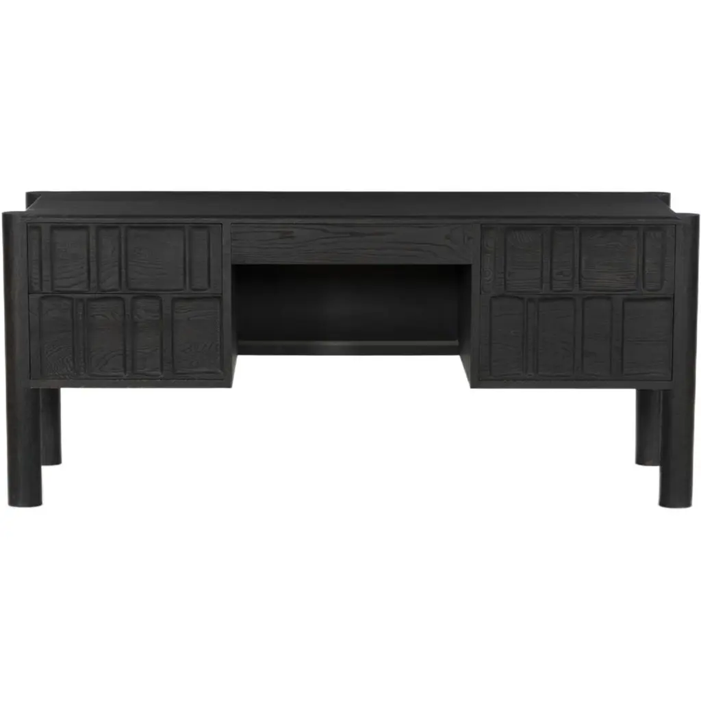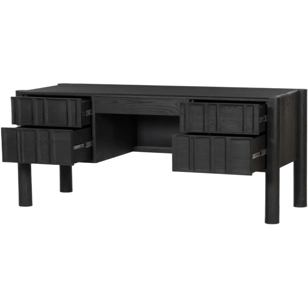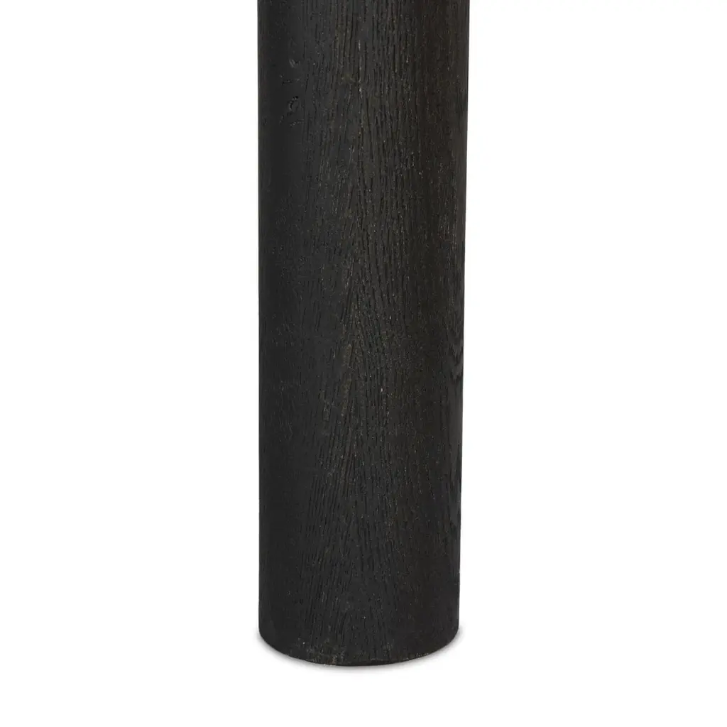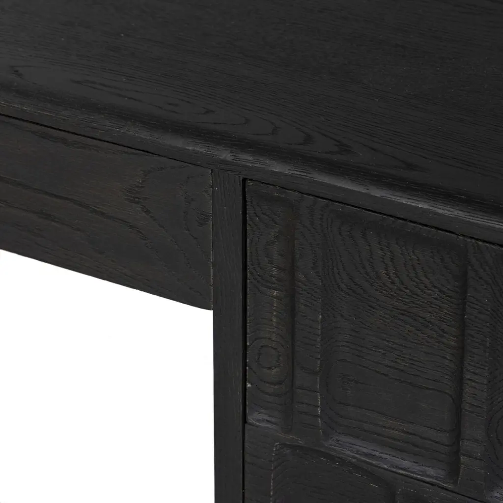 The Percy Desk captivates with its organic visual interest, showcasing grain and character variation within a solid oak finish. Its design features a full-width carved panel on opposite sides, adding depth and sophistication. A sleek pencil drawer offers convenient storage, while the floor-to-top cylinder legs provide a primitive look that beautifully balances the dynamic wood pattern.