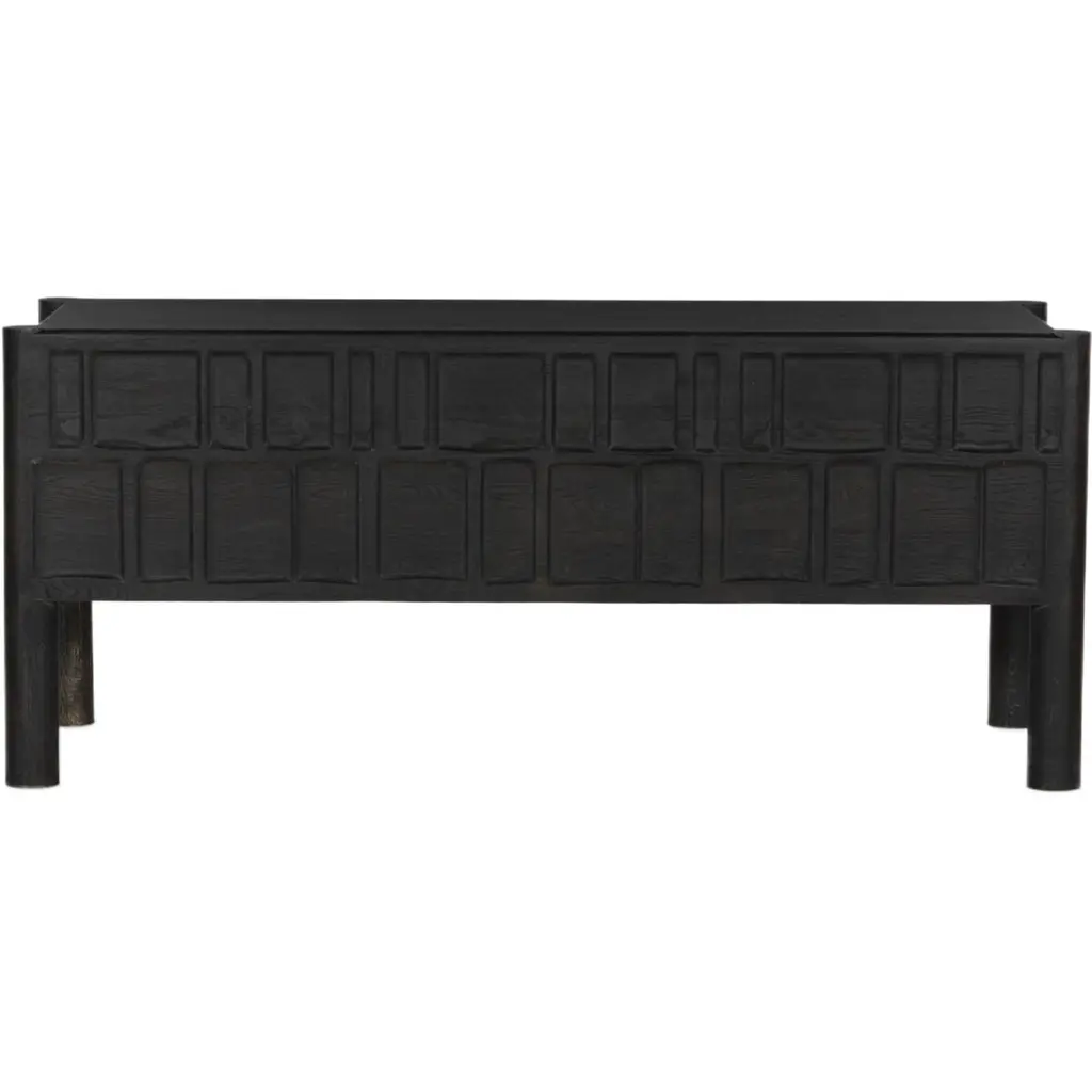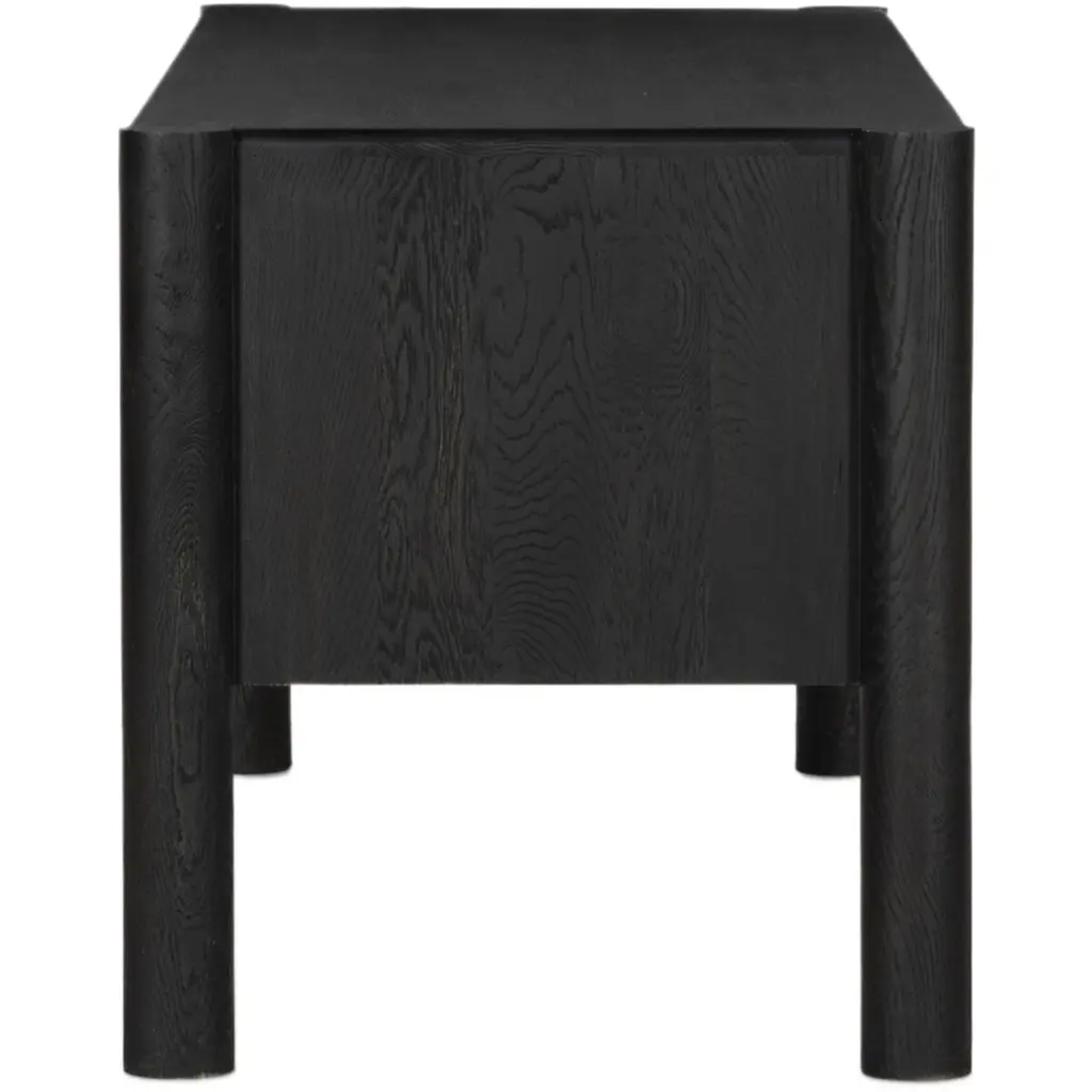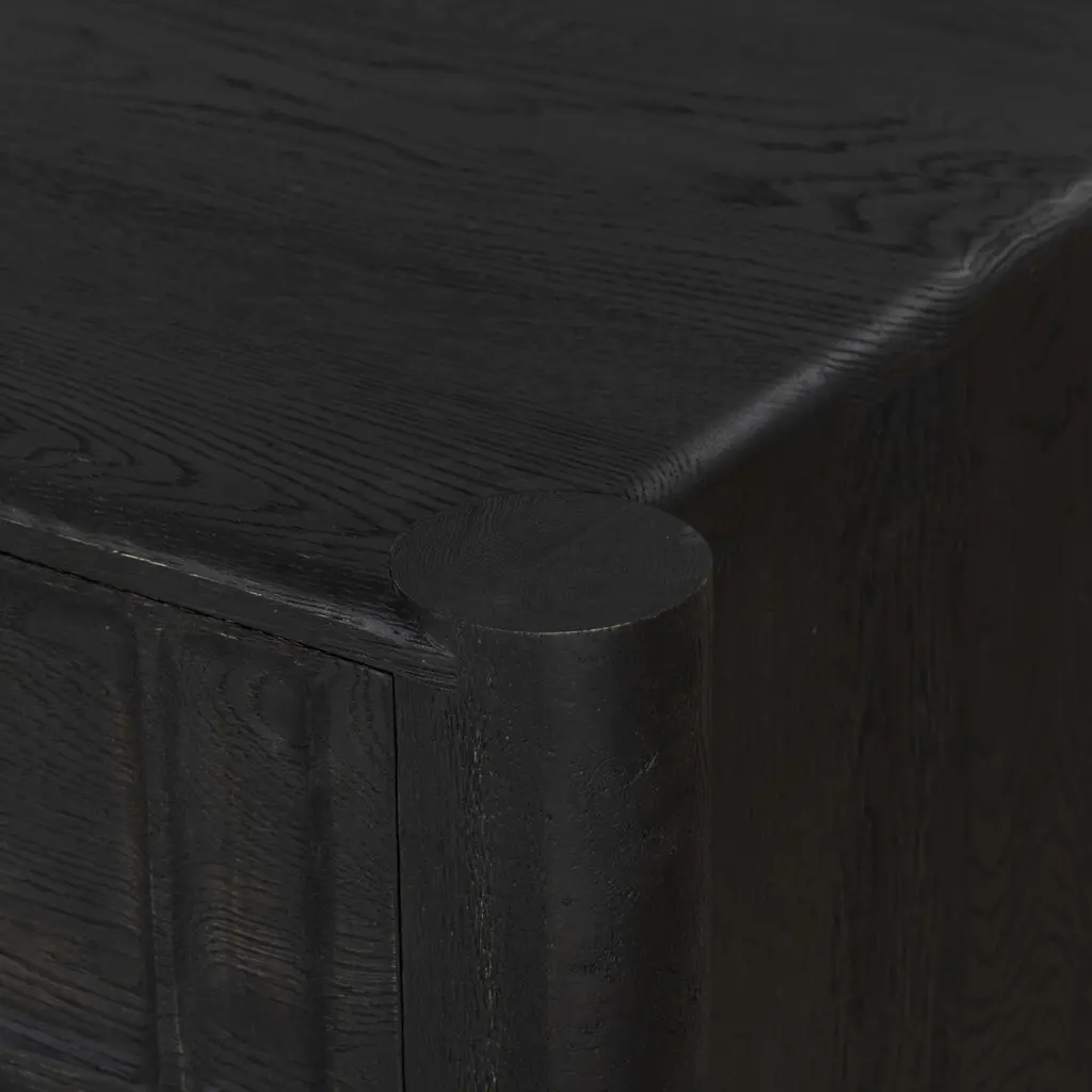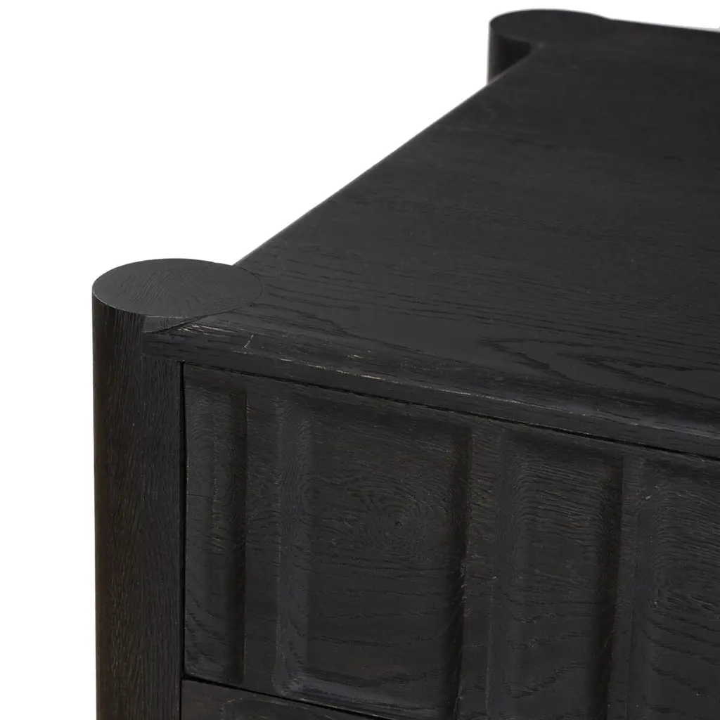The Percy Desk captivates with its organic visual interest, showcasing grain and character variation within a solid oak finish. Its design features a full-width carved panel on opposite sides, adding depth and sophistication. A sleek pencil drawer offers convenient storage, while the floor-to-top cylinder legs provide a primitive look that beautifully balances the dynamic wood pattern.
