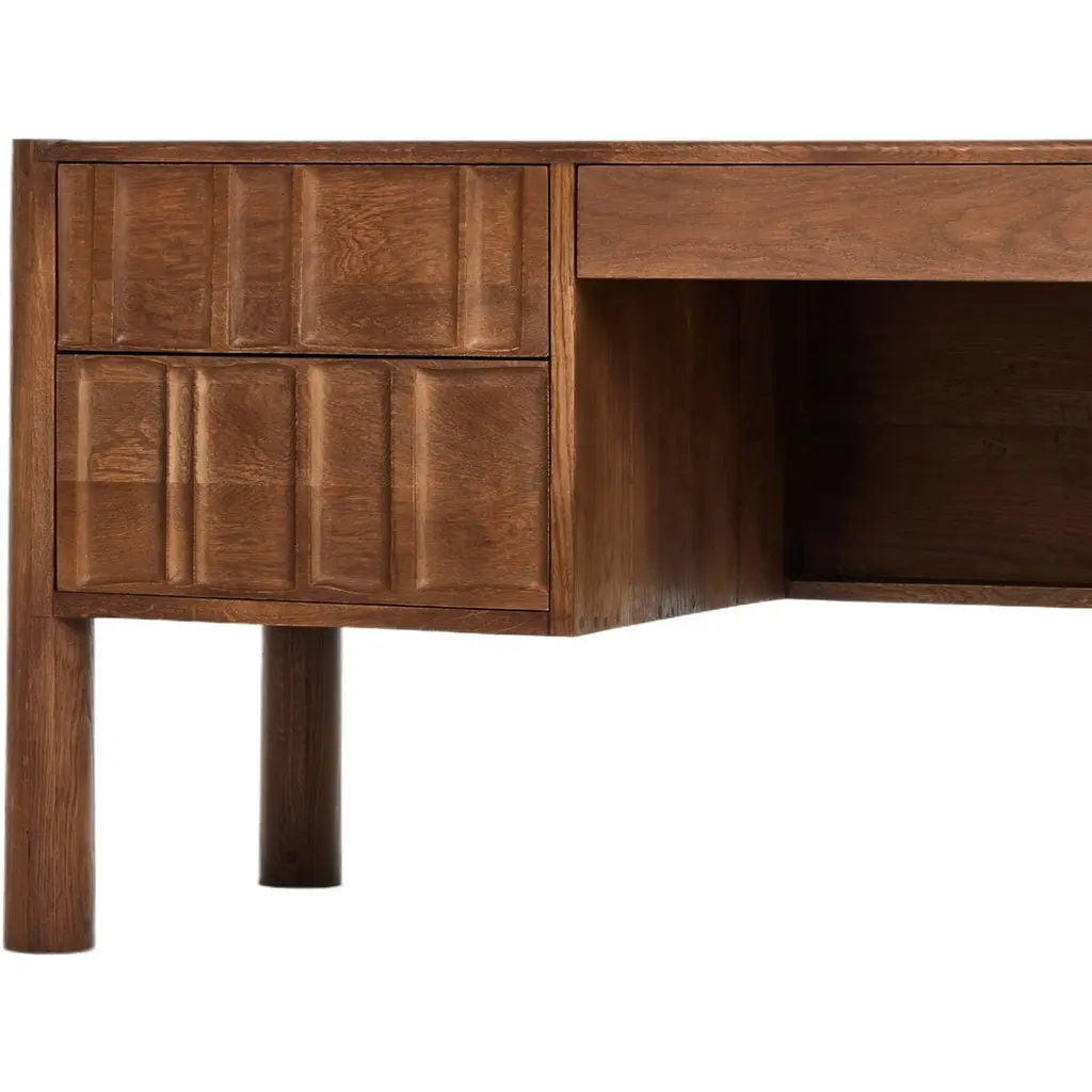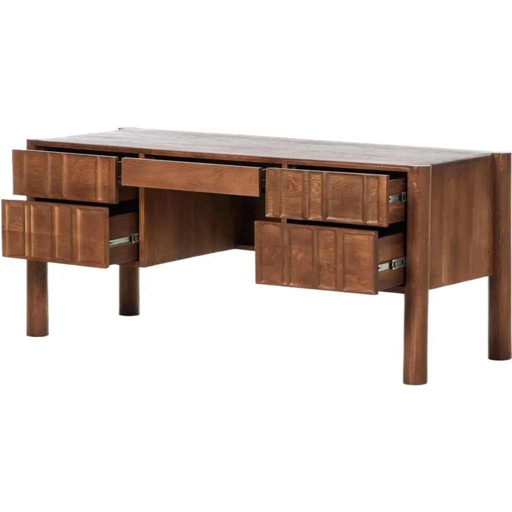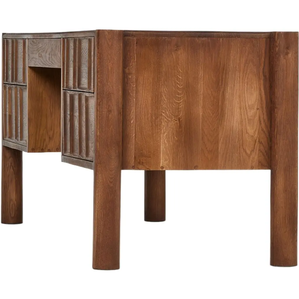 The Percy Desk captivates with its organic visual interest, showcasing grain and character variation within a solid oak finish. Its design features a full-width carved panel on opposite sides, adding depth and sophistication. A sleek pencil drawer offers convenient storage, while the floor-to-top cylinder legs provide a primitive look that beautifully balances the dynamic wood pattern.