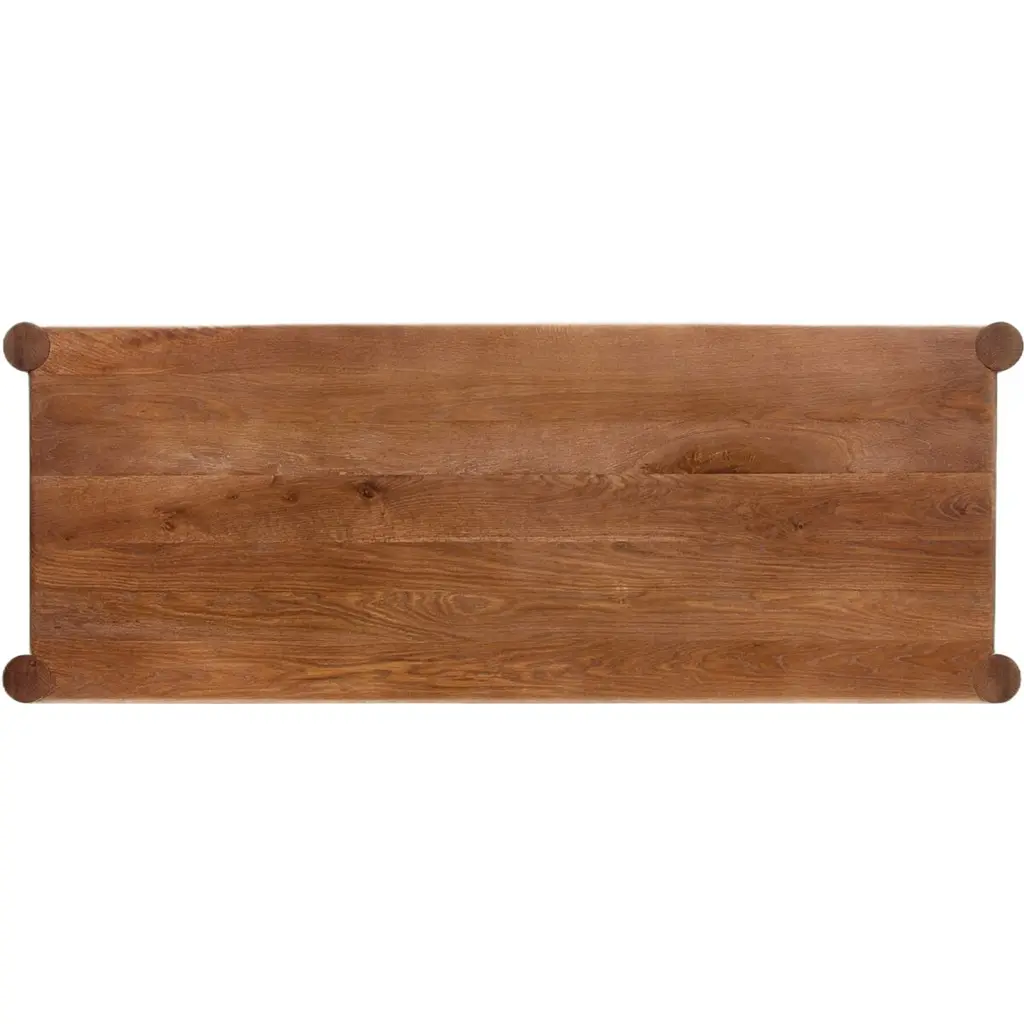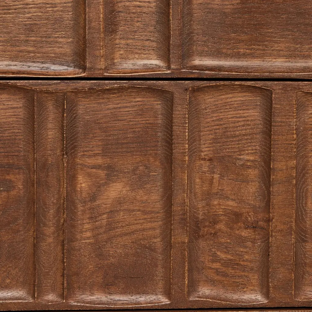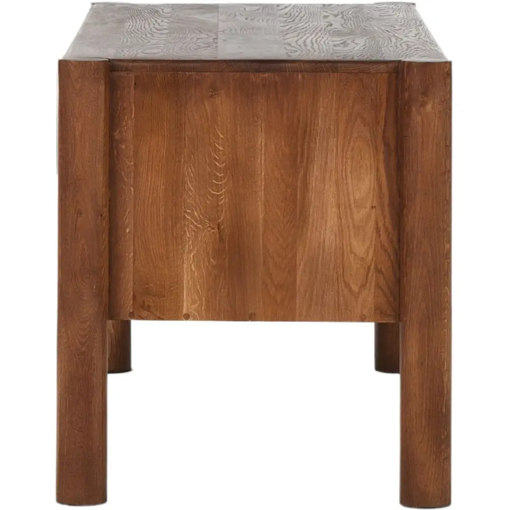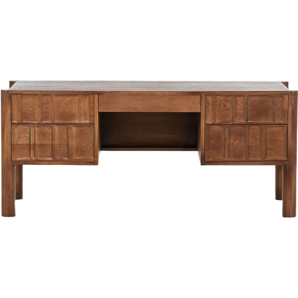 The Percy Desk captivates with its organic visual interest, showcasing grain and character variation within a solid oak finish. Its design features a full-width carved panel on opposite sides, adding depth and sophistication. A sleek pencil drawer offers convenient storage, while the floor-to-top cylinder legs provide a primitive look that beautifully balances the dynamic wood pattern.