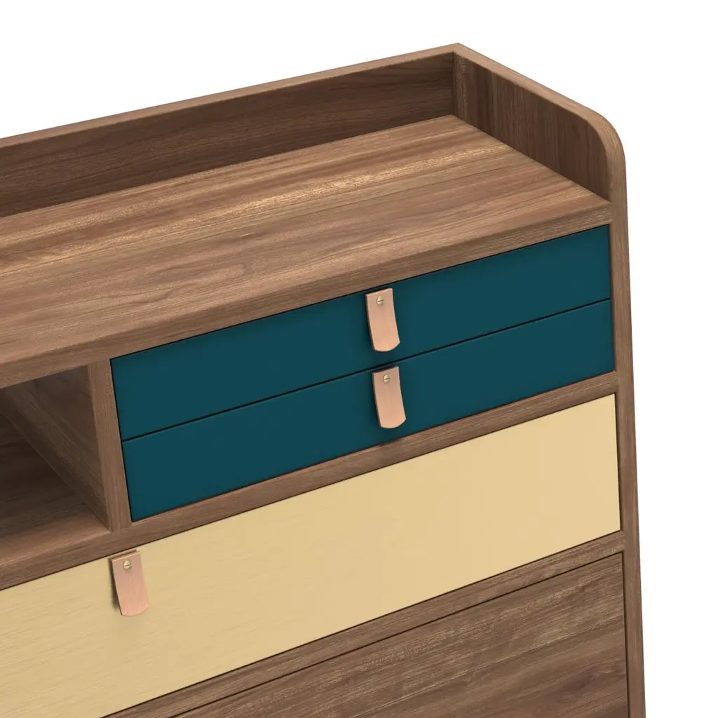Petrol Blue Drawers Gaston Floating Writing Desk 80 cm Natural Walnut by HARTODimensions: W 80 x D 32 x H 72 cm. Materials: MDF wood veneer, Lacquered MDF, Leather.Weight: 27.5 kgGaston has everything a big boy needs and yet it takes up so little space! A wall-mounted secretary, to free up floor space while having everything at hand, and to hide what you don't want to show. 3 drawers, a spacious niche for a computer, leather handles for style: Gaston is perfect for creating an office corner in a living room or bedroom. Gaston is made in Portugal, in oak veneered MDF, lacquered MDF and leather handles. Gaston is a creation of Florence Watine.About: Hartô, a French furniture brand, was born in 2012 from the desire of its founders to offer a different design, less elitist, which combines the useful with the beautiful. A light, joyful design, as if to say "I'm fed up" (with boring furniture): this is the meaning of the word harto in Spanish. The first pieces of the collection, the desks offer a new vision on a market that was then quite sparse, and offer functional tips and a joyful, colorful design, out of step with the archetypes. The foundations of the Hartô spirit are laid: a free spirit, a design of the useful, curved shapes, colors. In a word: creativity! And of course, from the beginning, this translates into collaborations with talented designers. This spirit crosses the years and the collections, evolves, refines itself, without ever denying itself. Today, audacity and creativity are still there, and are translated in a subtle way, all in elegance. At Hartô, the freedom to create is also based on strong commitments to quality and durability: the furniture is made by the best local craftsmen, who use noble materials to give life to pieces that will last through the ages.