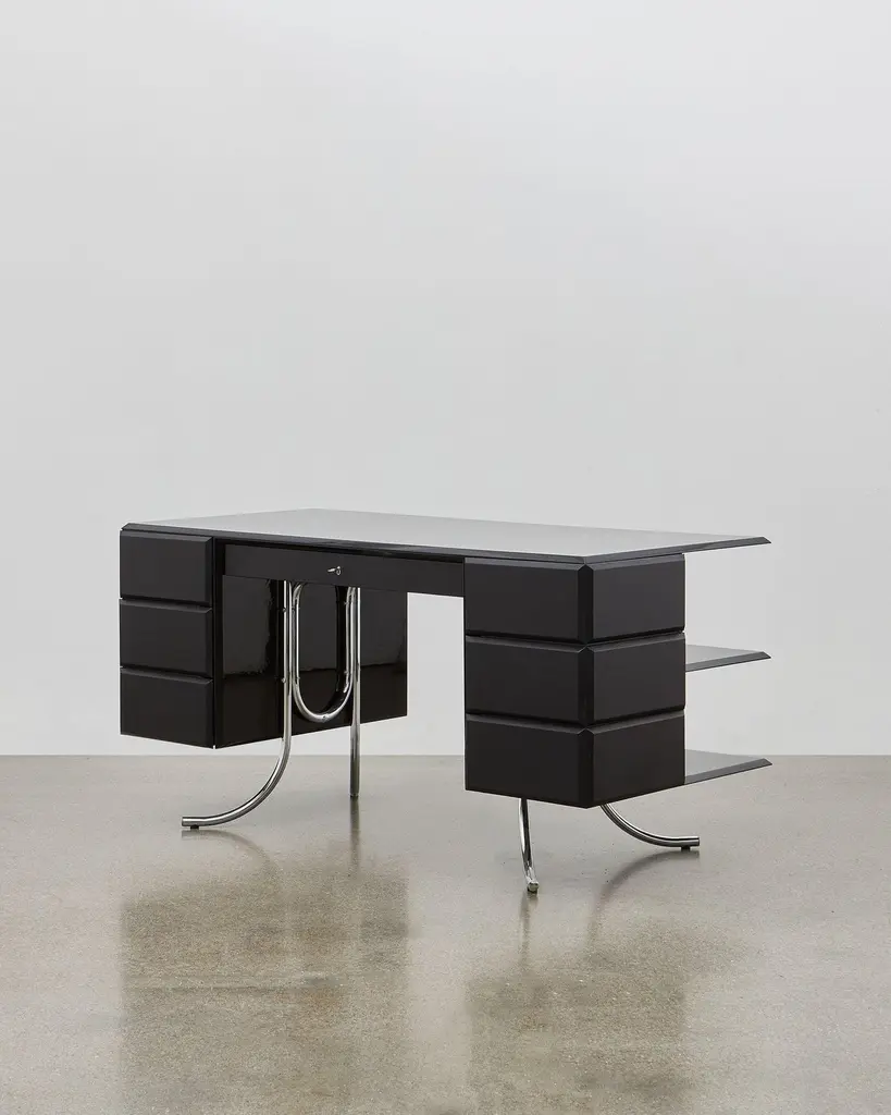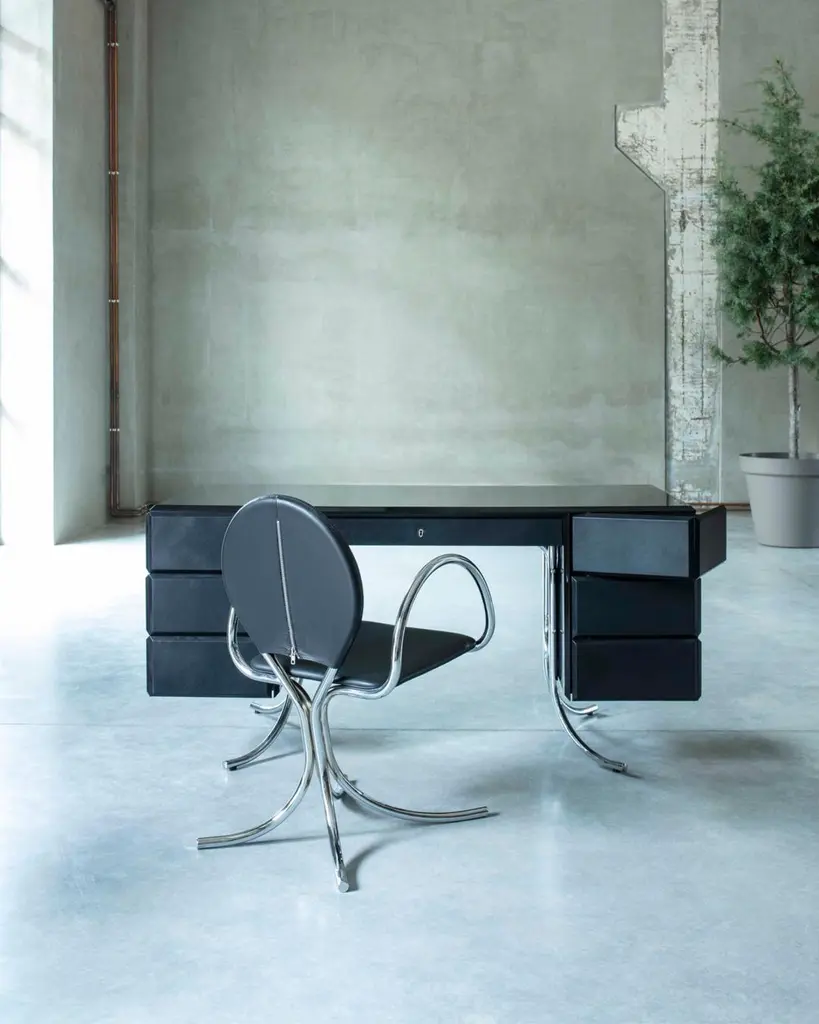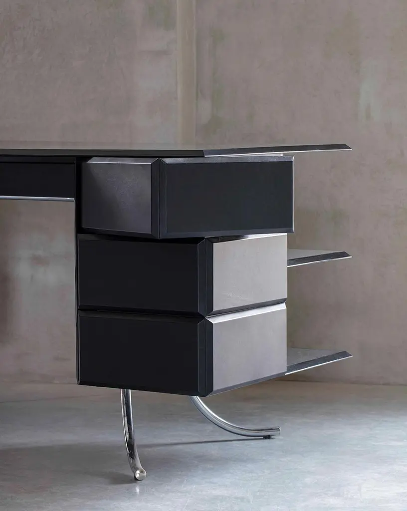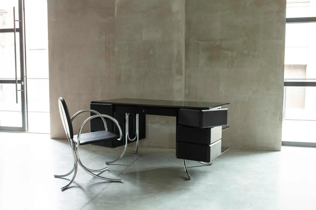 Ph Office Desk, Chrome, Black Painted Polished, Leather On Panles, Satin Matt