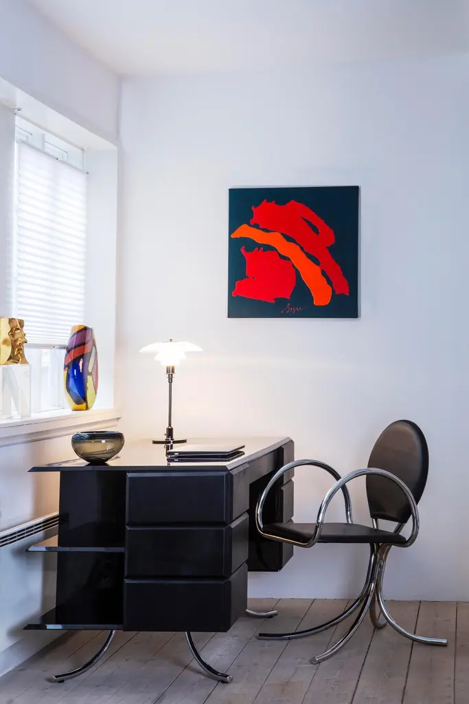 Bold and colorful, this desk will add style and character too your working day. Poul Henningsen designed this masterpiece in 1935. A harmony of striking aesthetics and practicality, PH’s design features a desktop painted in high gloss, six swing drawers, panels covered in leather, together with chromed legs.The story behind this avant-garde design is simply that Poul Henningsen wished to create an alternative to the traditional wooden desk, designed to capture the imagination of the user beyond the use of standard design and materials. The PH office desk comes with a red or black high gloss desk top, matched on the open shelves, with a coordinating matte tonal colour inside the drawer. The panels of the swing drawers are available in black or green lamb nappa.It is also available in traditional wood finishes: mahogany with solid edges or light oak with plywood edges. In any combination, the PH office desk is a statement piece for the home, the showroom, the office or the lobby.