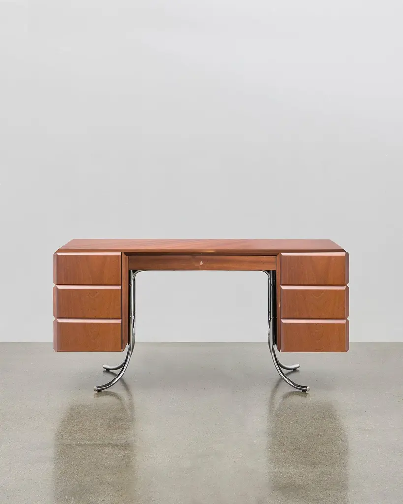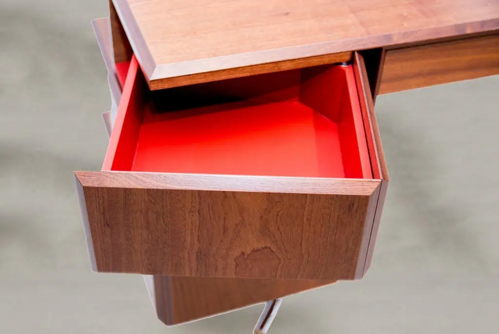 Bold and colorful, this desk will add style and character too your working day. Poul Henningsen designed this masterpiece in 1935. A harmony of striking aesthetics and practicality, PH’s design features a desktop painted in high gloss, six swing drawers, panels covered in leather, together with chromed legs.The story behind this Avant Garde design is simply that Poul Henningsen wished to create an alternative to the traditional wooden desk, designed to capture the imagination of the user beyond the use of standard design and materials.The PH office desk comes with a red or black high gloss desk top, matched on the open shelves, with a coordinating matte tonal color inside the drawer. The panels of the swing drawers are available in black or green lamb nappa.It is also available in traditional wood finishes: mahogany with solid edges or light oak with plywood edges. In any combination, the PH office desk is a statement piece for the home, the showroom, the office or the lobby.