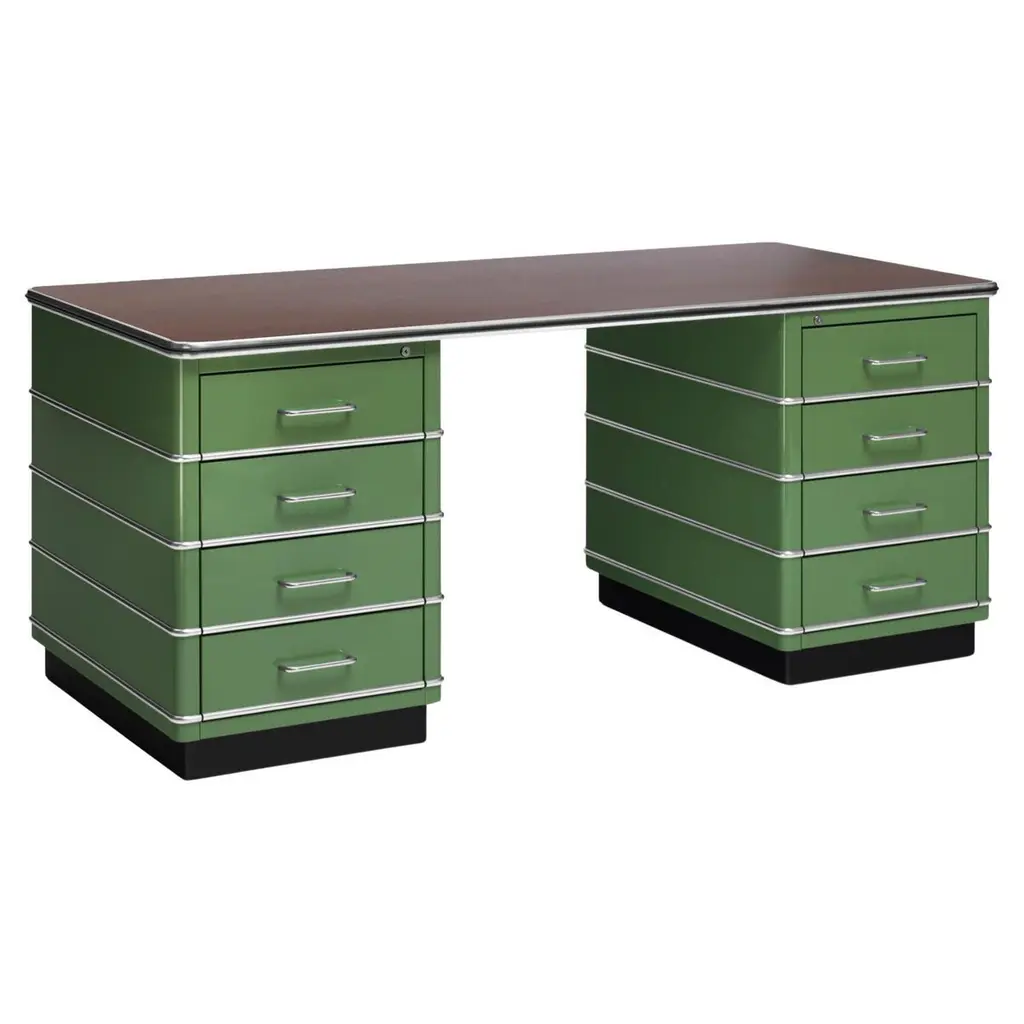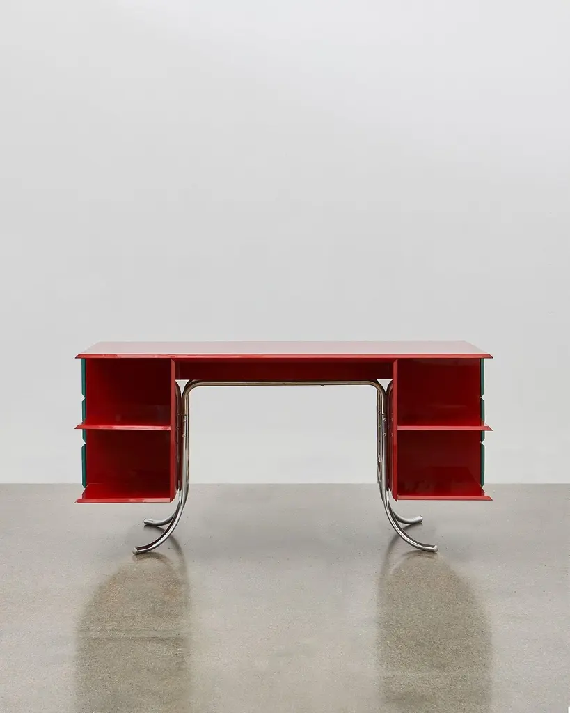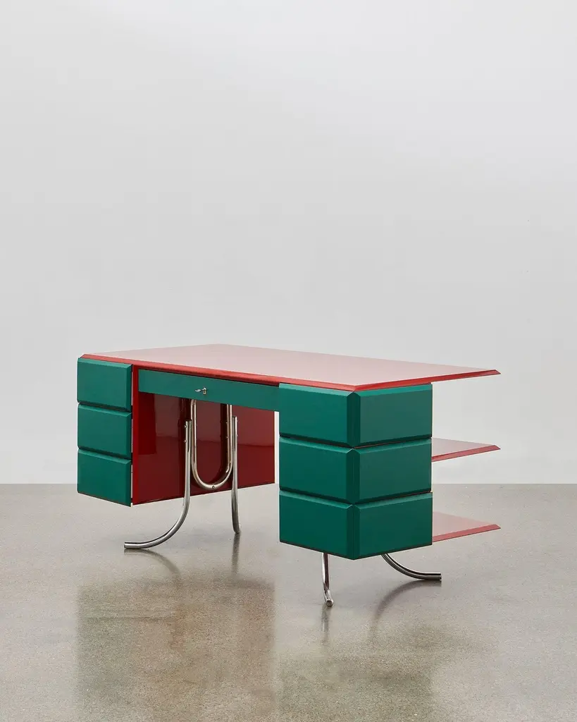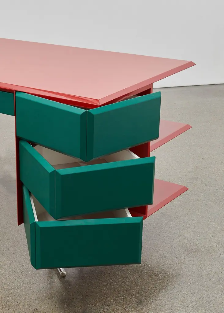 Ph Office Desk, Red Painted, Emerald Green Leather, Chrome, Satin Matte Drawers