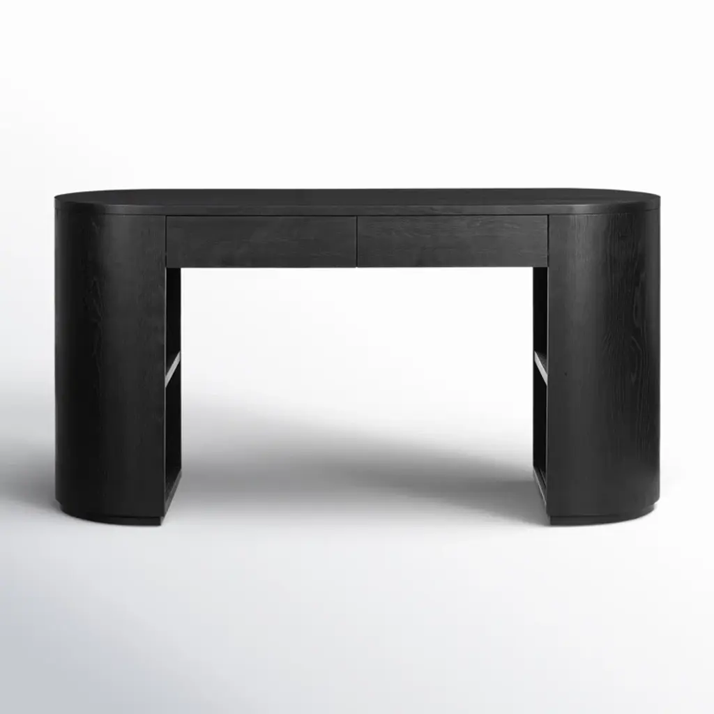 Make your workspace work for you. With its bold oval silhouette and versatile concealed storage, this desk transforms your home office. Crafted from a blend of solid and engineered wood wood grain tone, it features an oval, pill-shaped silhouette inspired by retro designs. A distressed finish adds to the retro, antique vibe. The two pillar bases have half-cylinder shapes with built-in shelving that complements the storage offered by the two drawers. At 60.3'' wide, it lets you spread out while you tackle your workday.