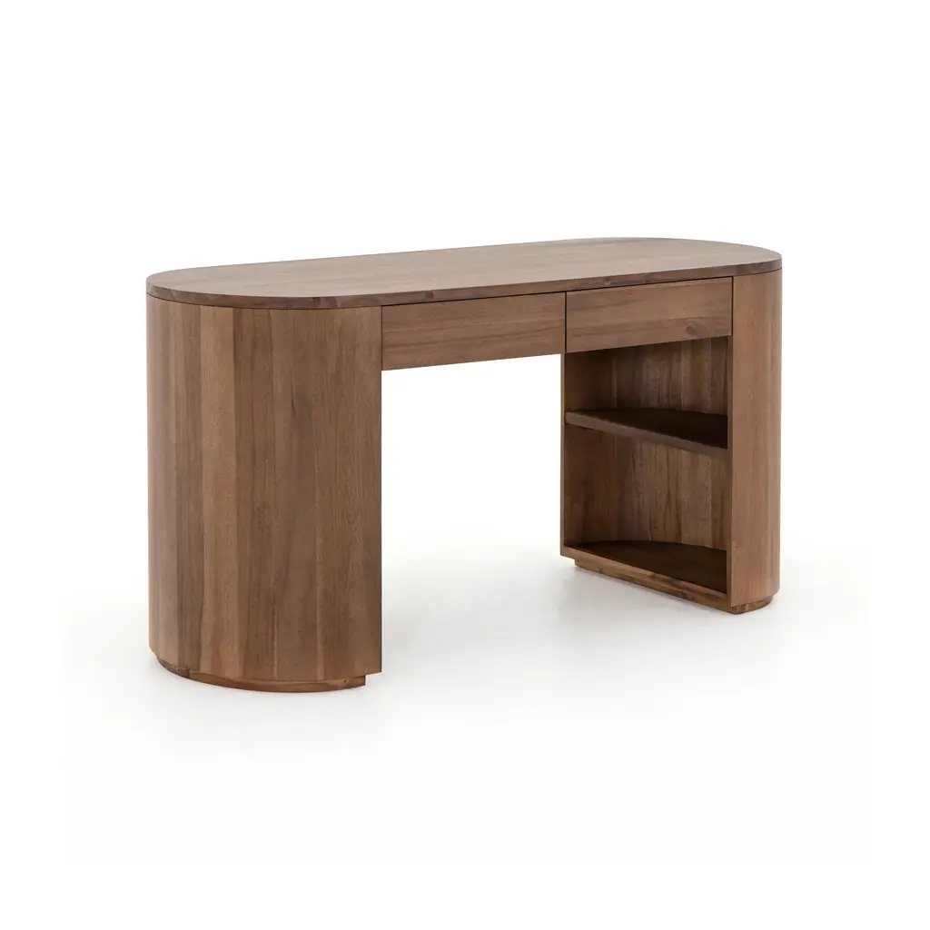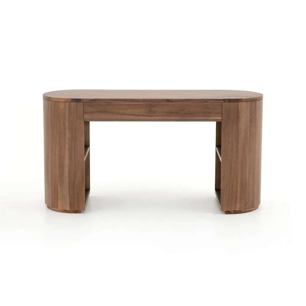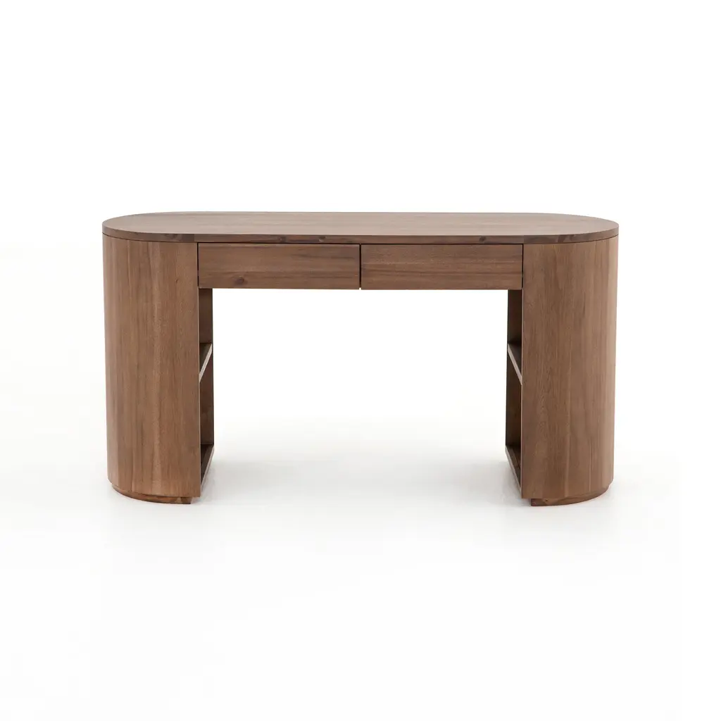 Create a timeless modern office with the Pilar Desk from Four Hands. Crafted from warm caramel brown-finished acacia wood, this Eighties-inspired piece showcases a pill shape, half-cylinder bases, and two top pencil drawers for keeping supplies close at hand. Each detail combines to create an unmistakably luxe feel, ensuring your space is nothing but the best. Highlights