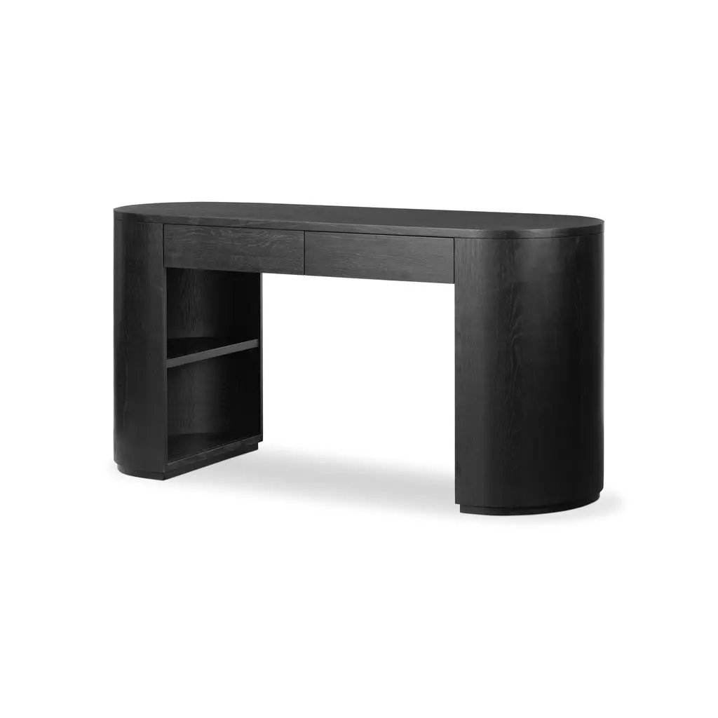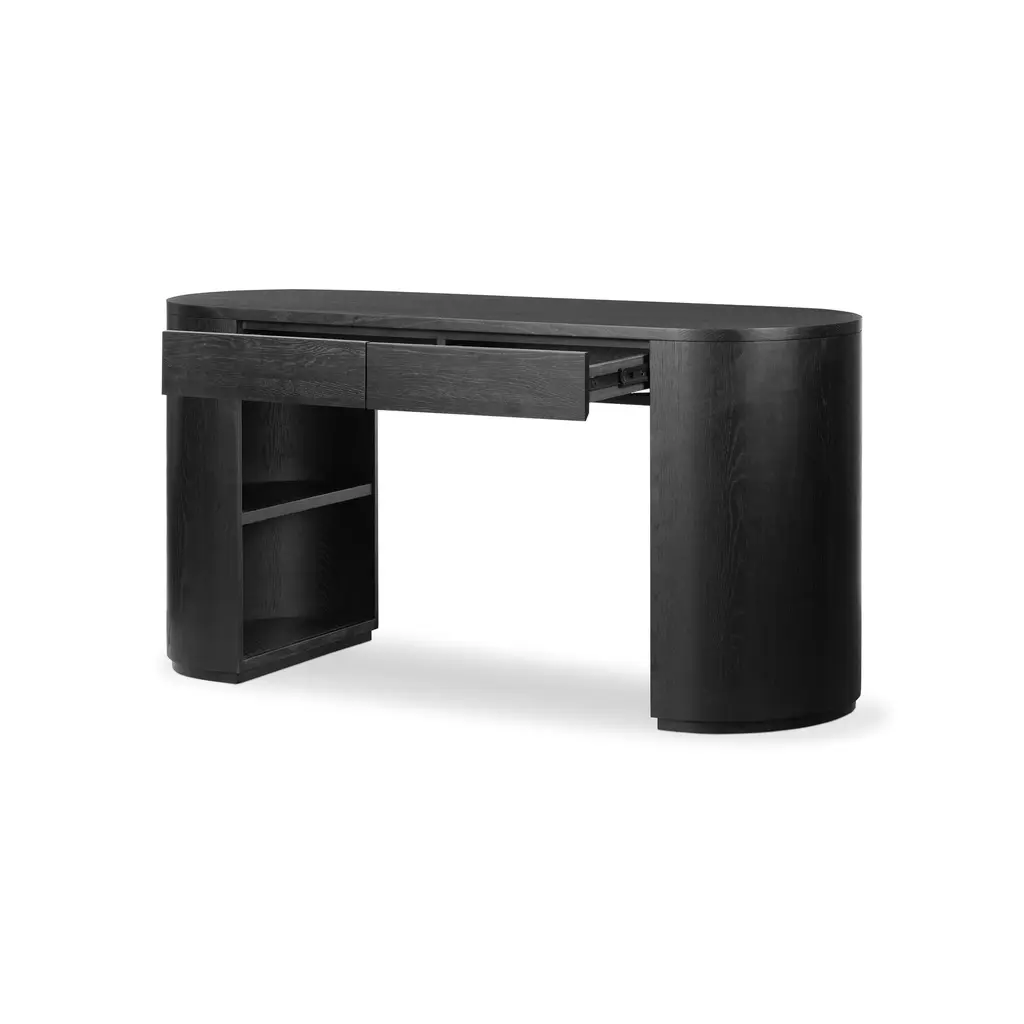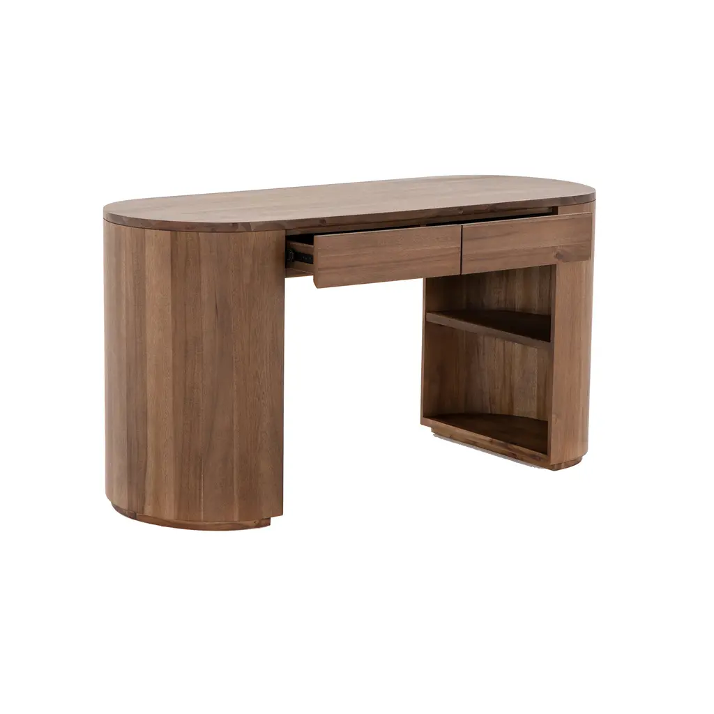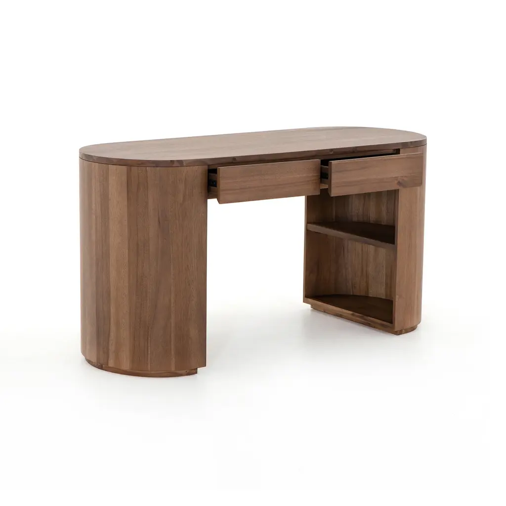 Create a timeless modern office with the Pilar Desk from Four Hands. Crafted from warm caramel brown-finished acacia wood, this Eighties-inspired piece showcases a pill shape, half-cylinder bases, and two top pencil drawers for keeping supplies close at hand. Each detail combines to create an unmistakably luxe feel, ensuring your space is nothing but the best. Highlights
