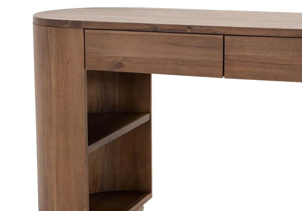 Inspired by 80s designs but given a modern update, this desk makes a handsome statement. Its pill-shaped top sets on half-cylinder legs showcasing open shelving for stowing electronics and papers. Two slim drawers provide further storage, for easy-to-access items. Its natural wood graning and patterning add a rich, visual texture, lending a refined touch to any space.