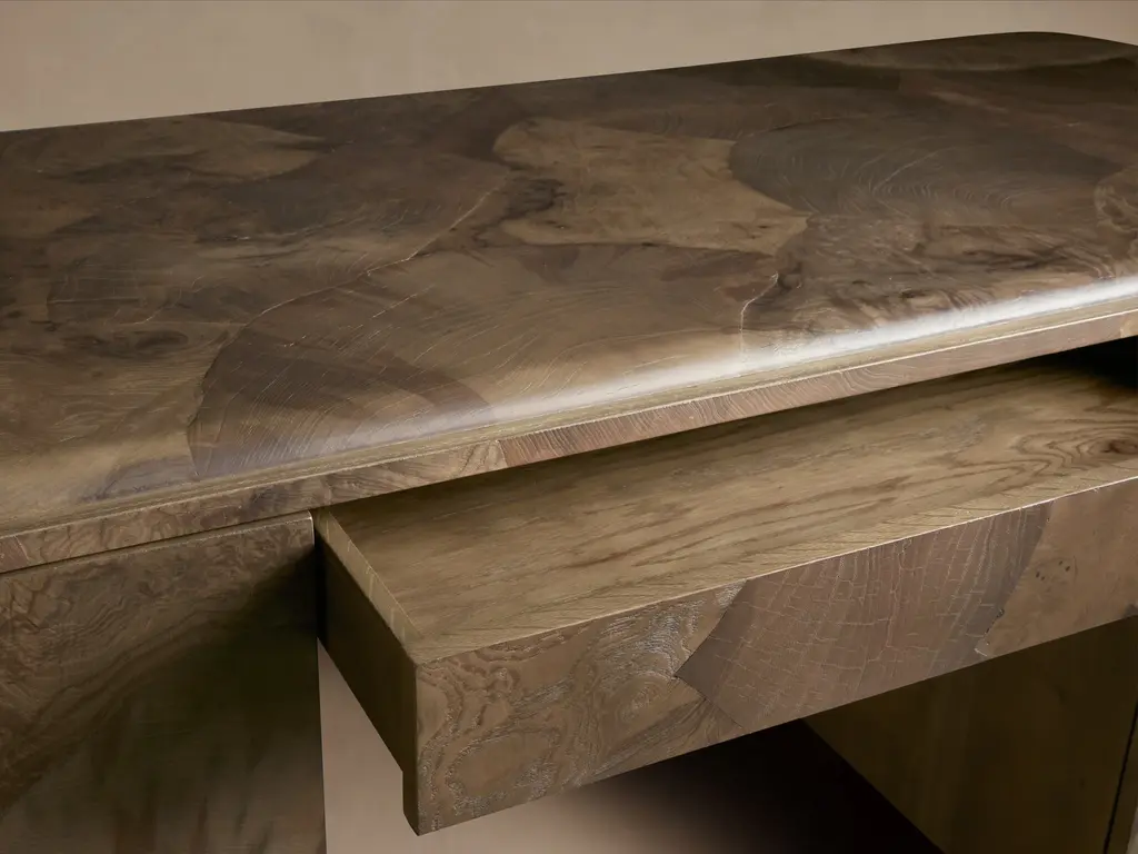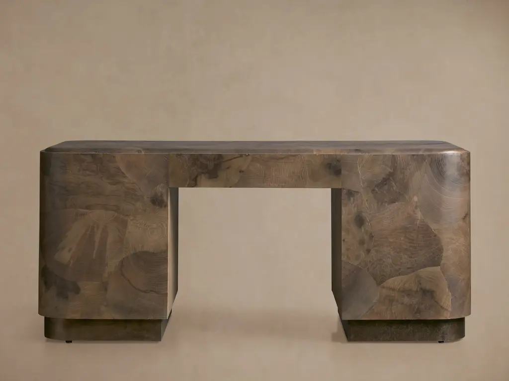 Following heavy storms, our artisan partners in Mexico search the forest for fallen trees of Mexican ash, salvaging as many as they can. Each log is oyster-cut, arranged, and stained by hand, united with fragments of sustainably grown European ash burl to create incredible, mosaic-like surfaces. Bases crafted from naturally oxidized metal add the perfect contrast, together forming the rustic beauty of our remarkable Polanco Collection.