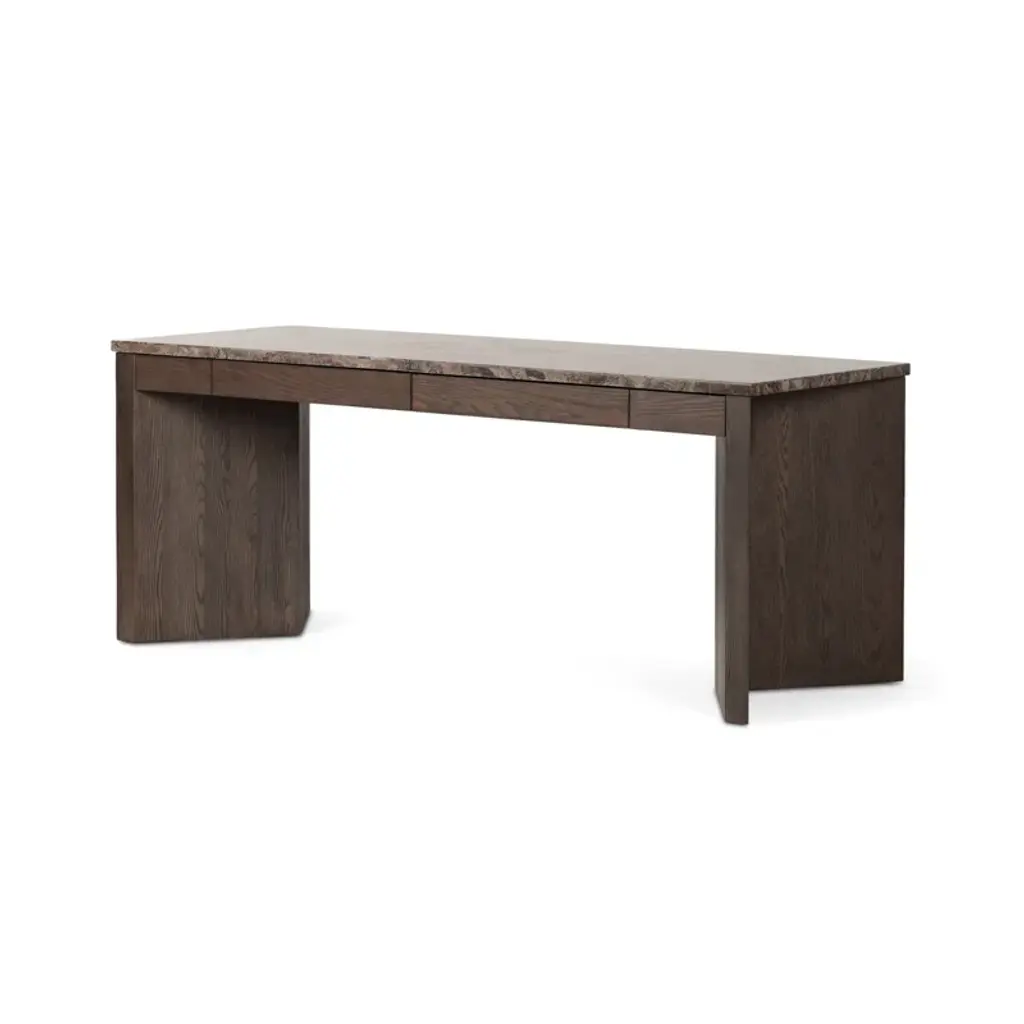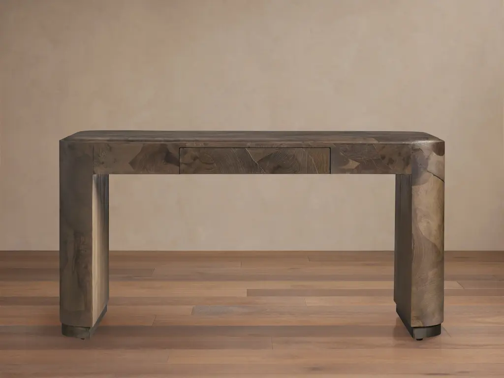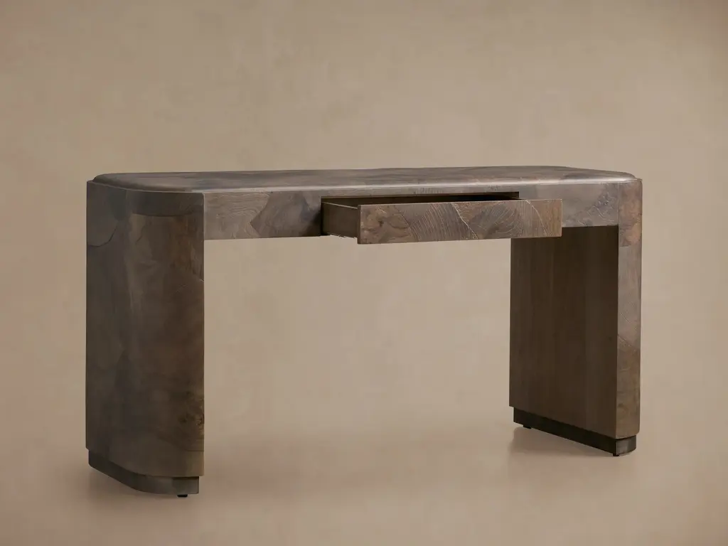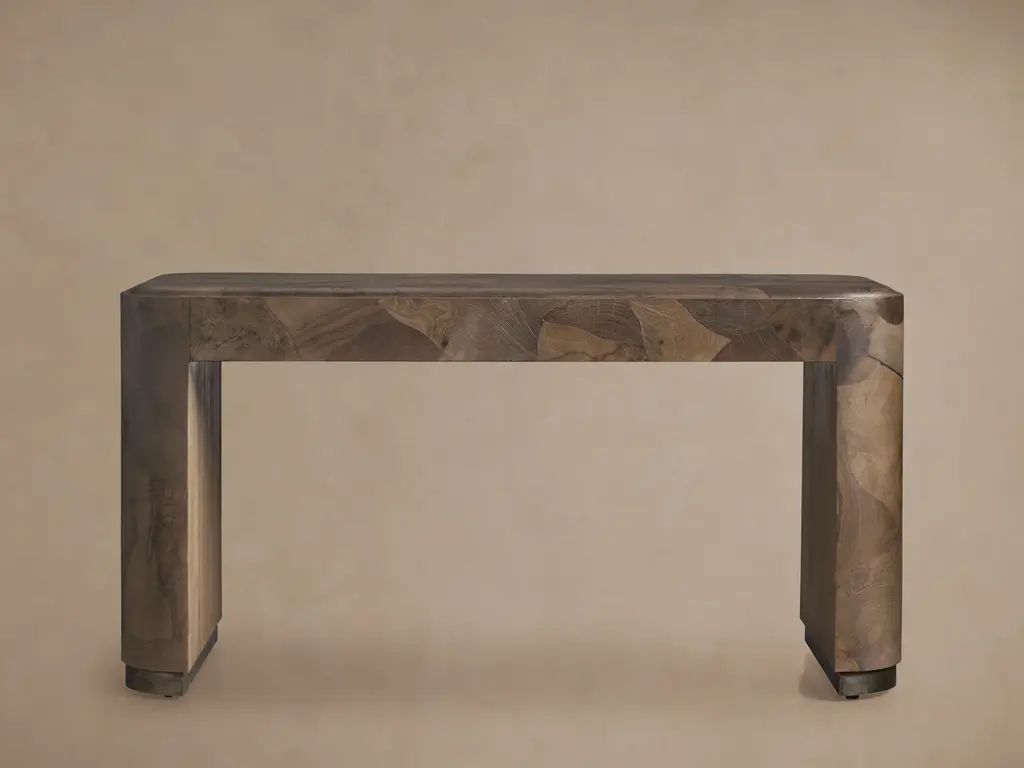 Following heavy storms, our artisan partners in Mexico search the forest for fallen trees of Mexican ash, salvaging as many as they can. Each log is oyster-cut, arranged, and stained by hand, united with fragments of sustainably grown European ash burl to create incredible, mosaic-like surfaces. Bases crafted from naturally oxidized metal add the perfect contrast, together forming the rustic beauty of our remarkable Polanco Collection.