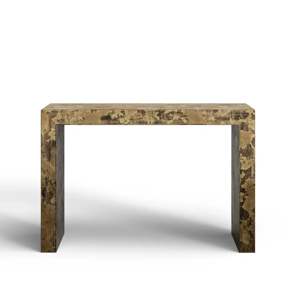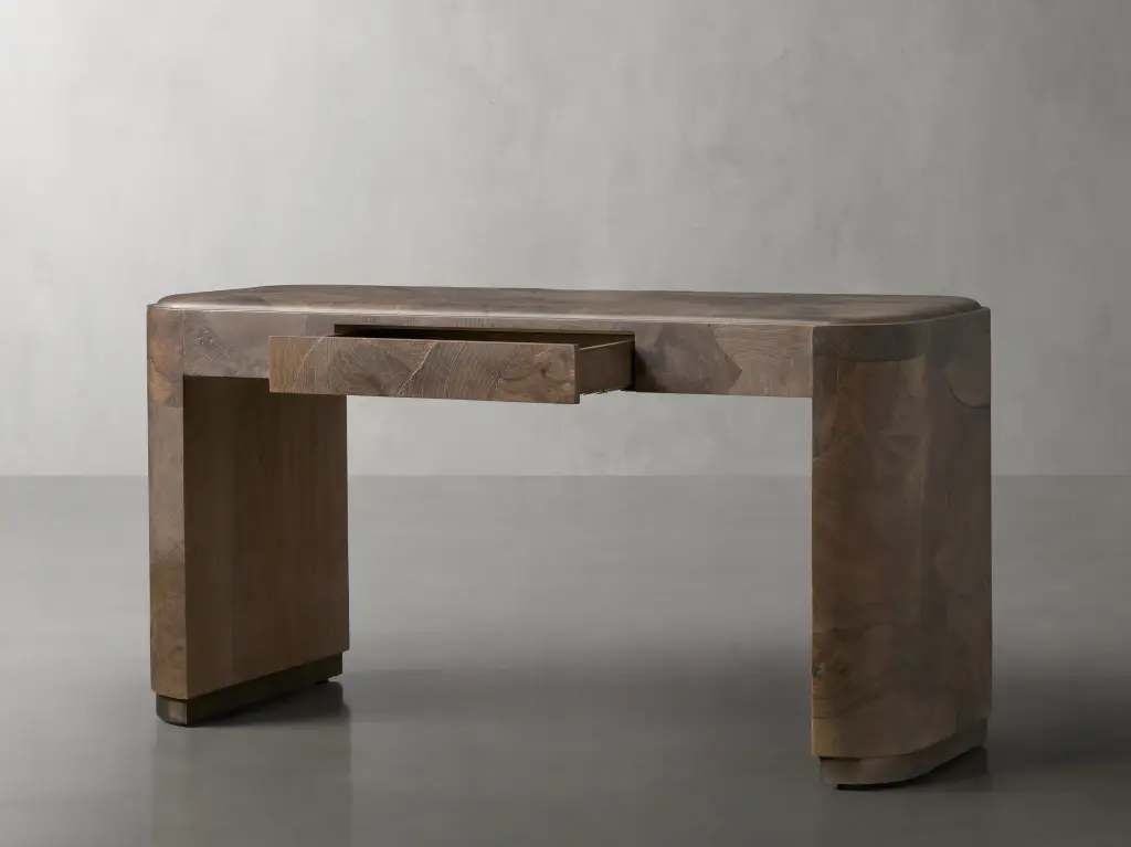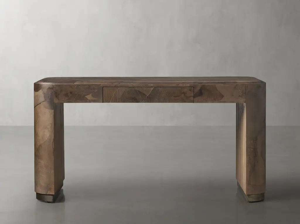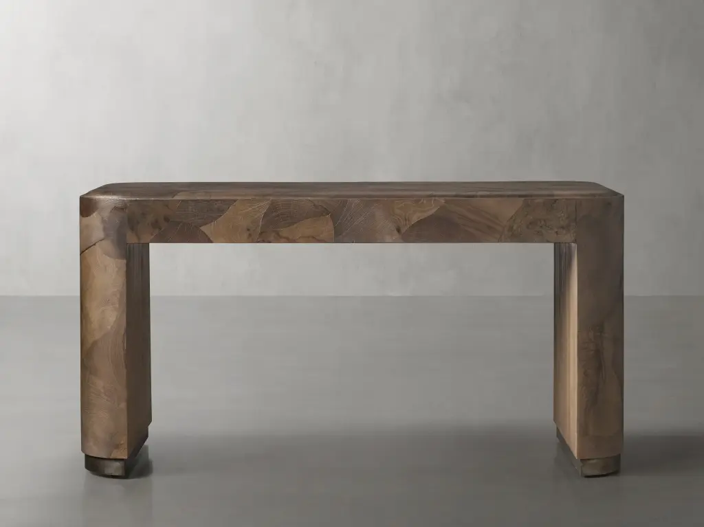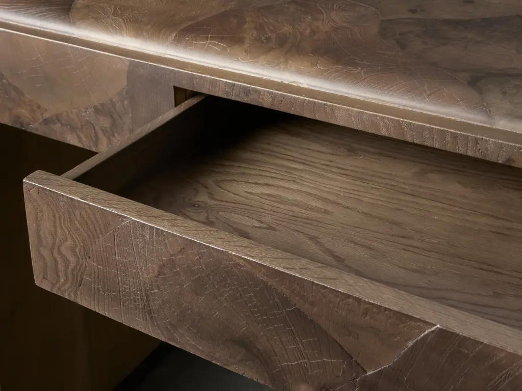 Following heavy storms, our artisan partners in Mexico search the forest for fallen trees of Mexican ash, salvaging as many as they can. Each log is oyster-cut, arranged, and stained by hand, united with fragments of sustainably grown European ash burl to create incredible, mosaic-like surfaces. Bases crafted from naturally oxidized metal add the perfect contrast, together forming the rustic beauty of our remarkable Polanco Collection.