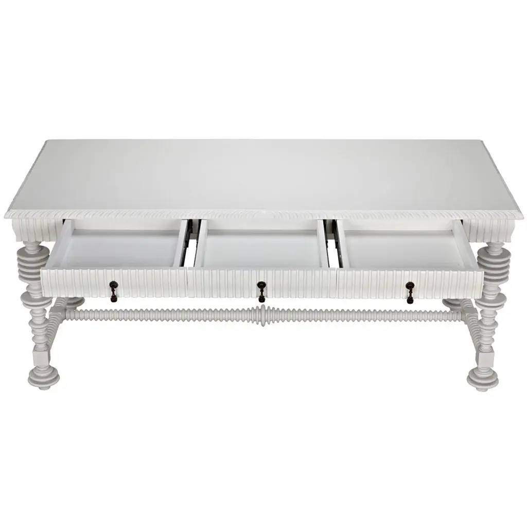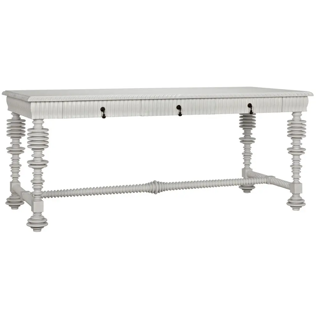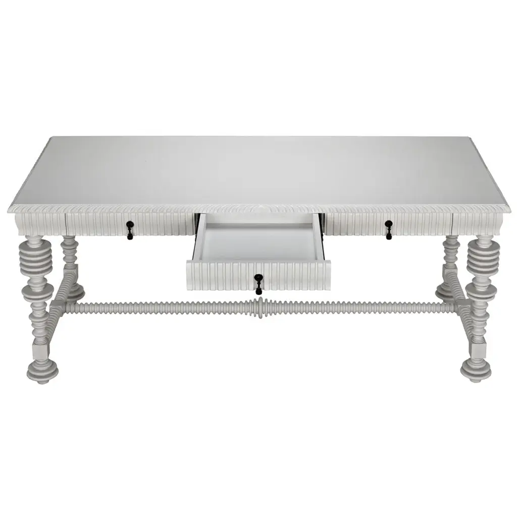 This striking desk is a sublime example of spool turning. Its magnificent legs and stretcher, ornately carved apron, and solid mahogany construction elevate an otherwise simple design. A hand-applied white wash finish and metal pulls complete the look.