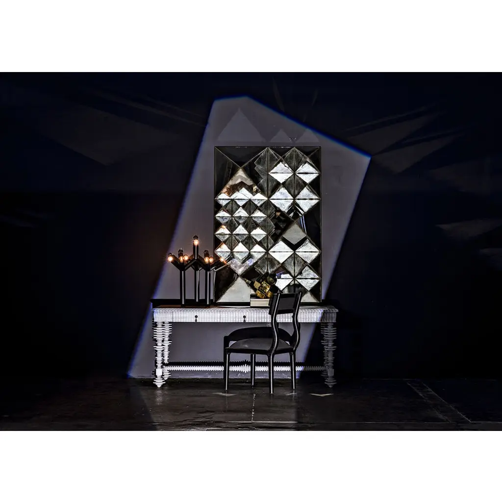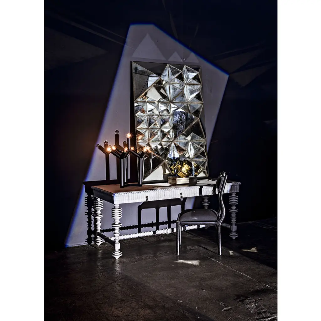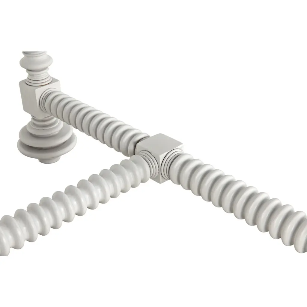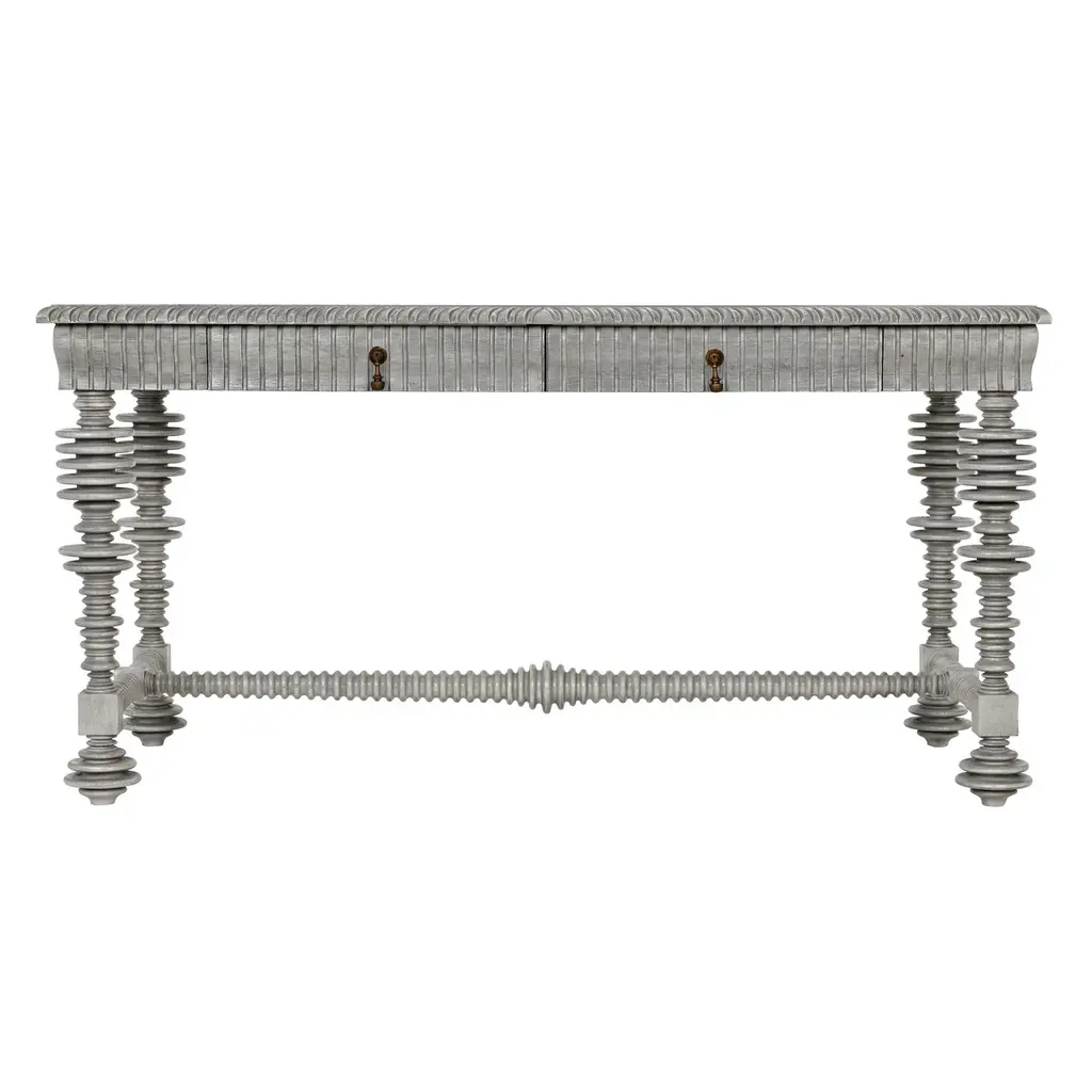This striking desk is a sublime example of spool turning. Its magnificent legs and stretcher, ornately carved apron, and solid mahogany construction elevate an otherwise simple design. A hand-applied white wash finish and metal pulls complete the look.
