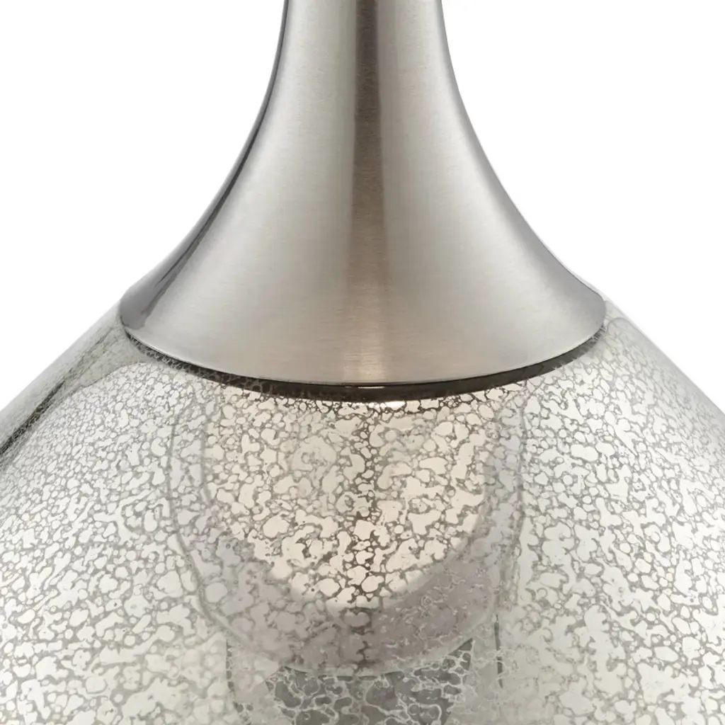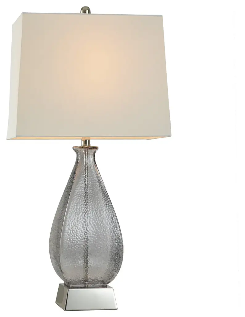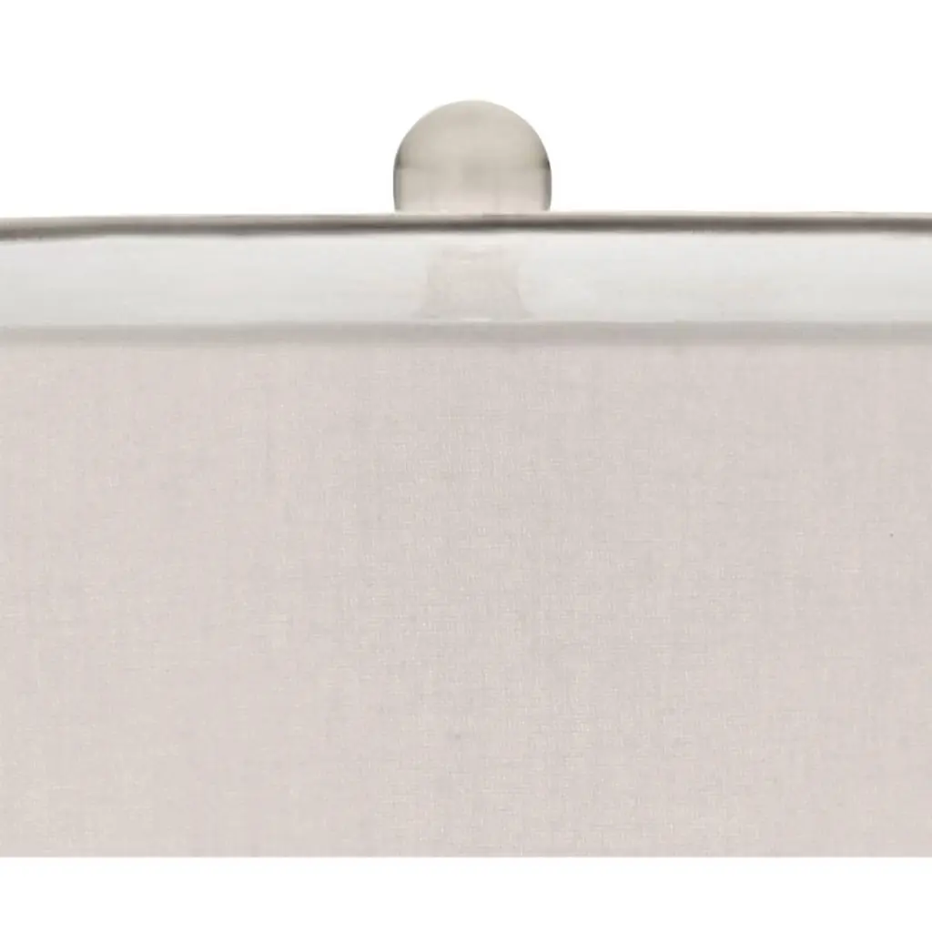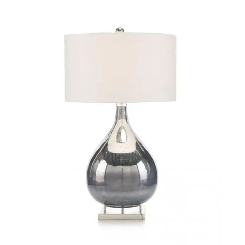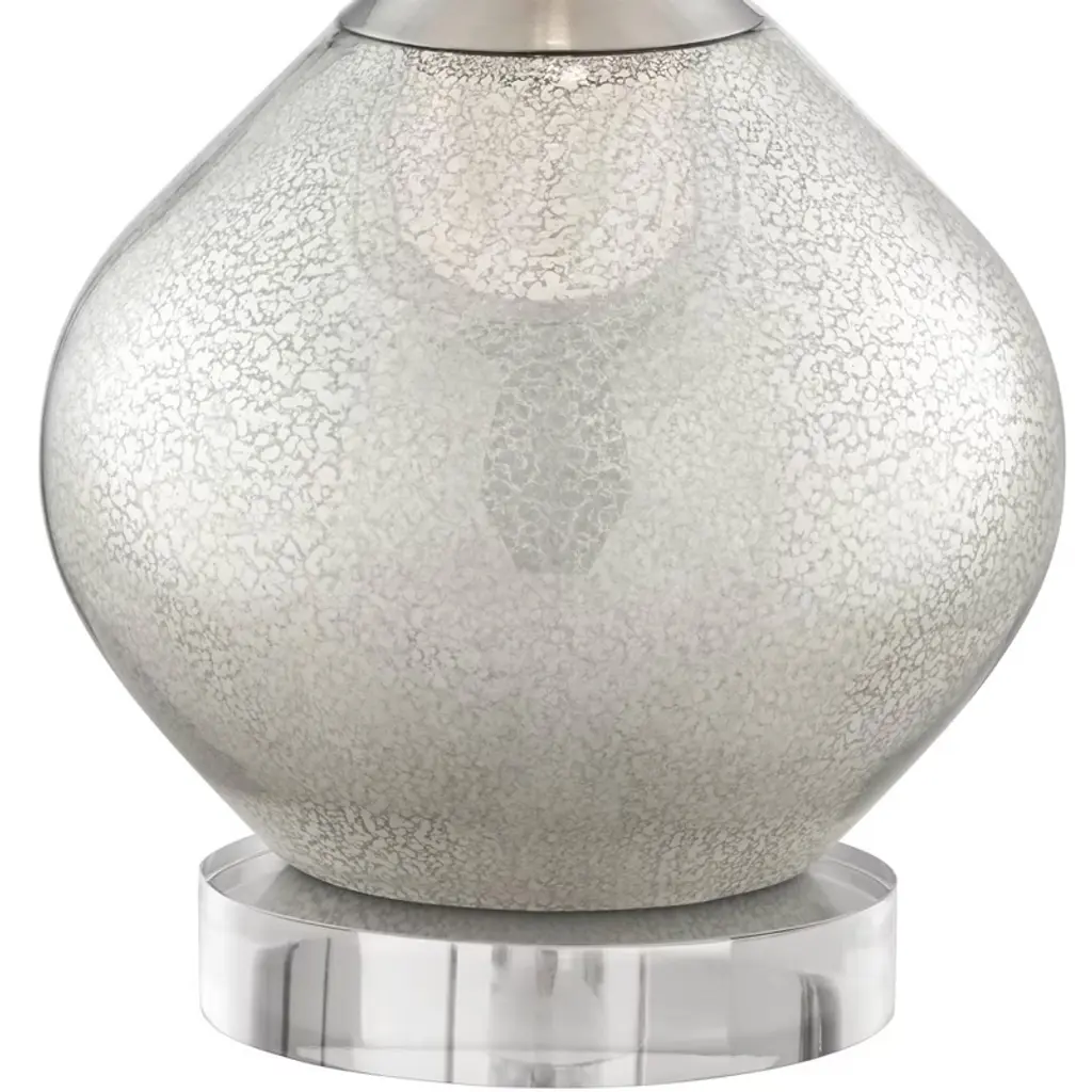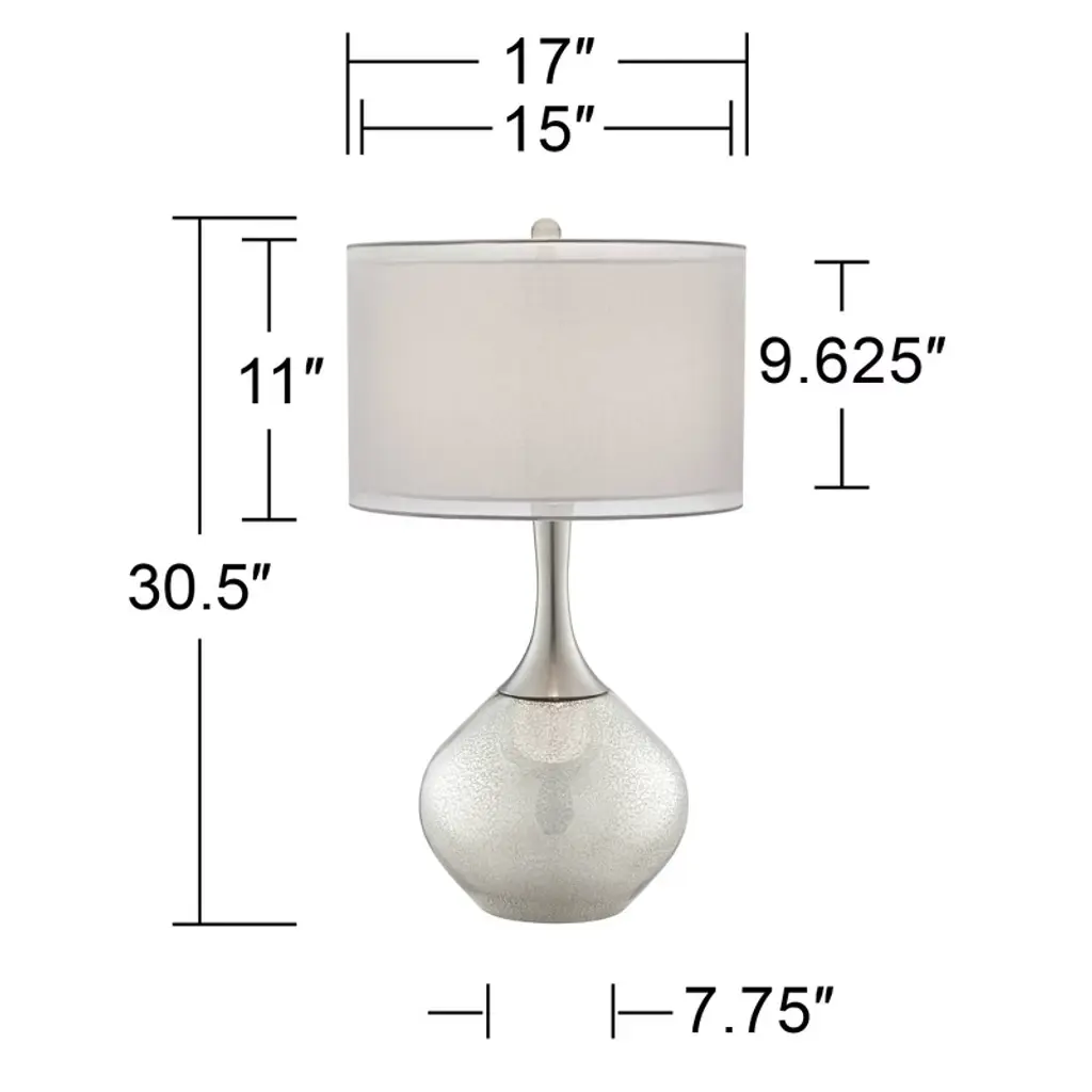 Sleek and contemporary table lamp with 8" wide round riser style in glass and metal construction. By Possini Euro Design, the mercury glass detail in the base creates a lovely effect. Paired with a layered drum lamp shade for added dimension and visual intrigue to complete the look.
