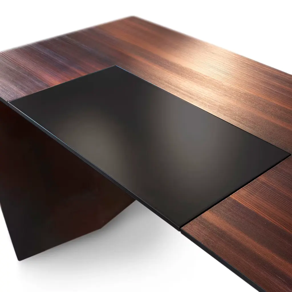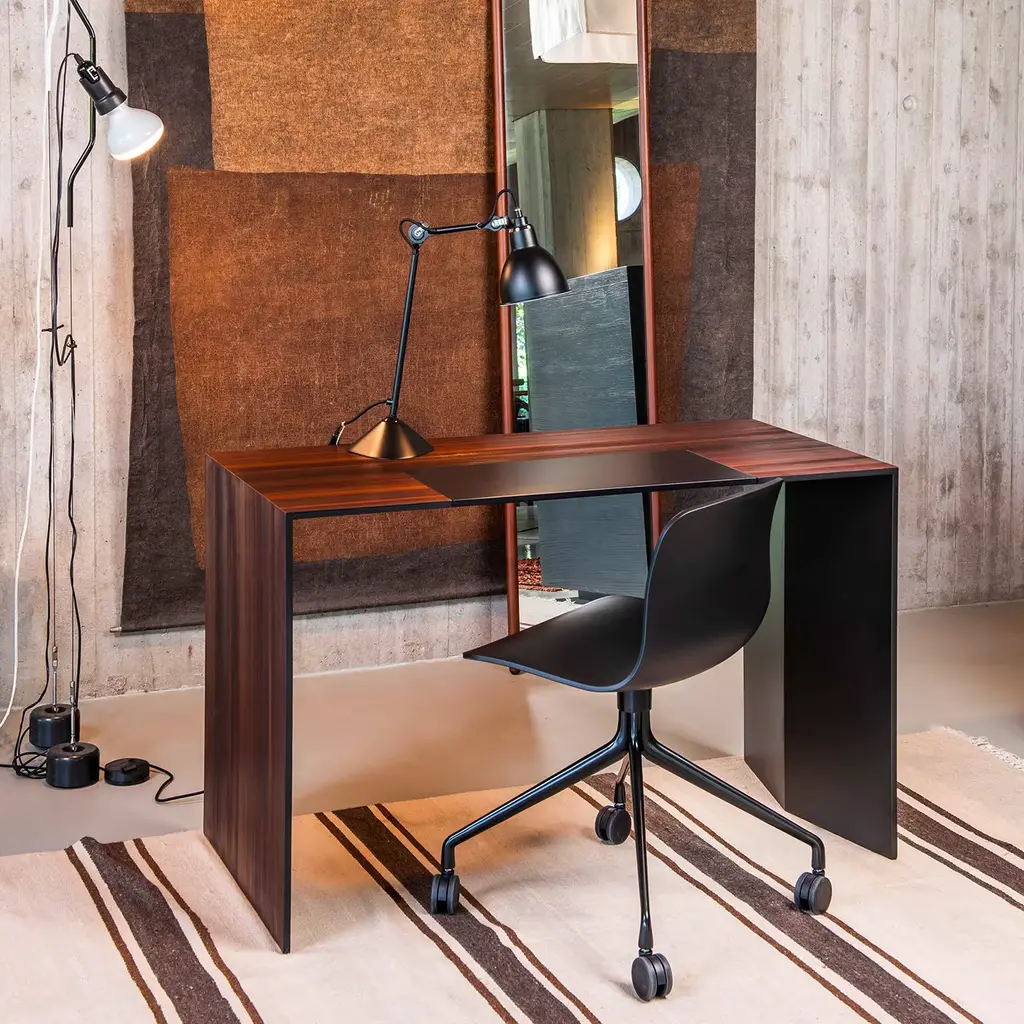 Perfect for both offices and homes, Praia is a home office desk with molded sides and a 45 ° joint between the top and the side, as well as a flap with an compartment space. Its structure is in MDF, the top is in heat-treated brushed larch and black interiors. The desk is available in different finishes.