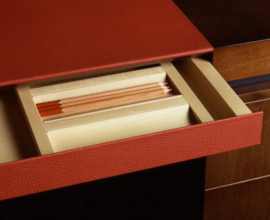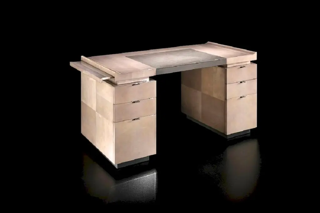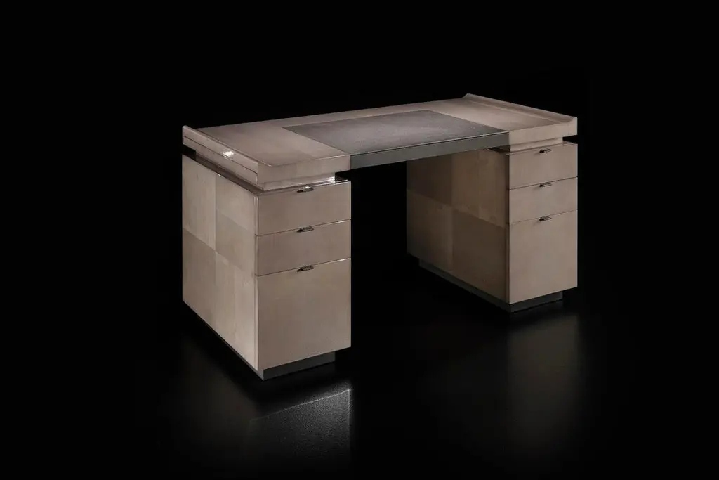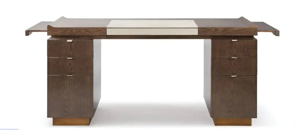 The Princeton Desk is a true statement piece — refined, bold, and designed with purpose. Its audacious details breathe new life into classic desk design while staying true to a sense of timeless elegance. Inspired by the Asian Art Deco movement, it blends exotic sophistication with functional artistry.Key Features:Material: Crafted from high-quality varnished Sycamore wood, available in matte, semi-gloss, or high-gloss finishes.Details: Leather underbody (Grade B leather) with two side zippers — a stylish and practical design element.Legs: Sleek metal feet available in bronze, polished chrome, or dark chrome — tailored to complement the overall aesthetic.Desktop Surface: Includes a luxurious leather blotter for a refined writing experience.Storage Option: Also available with a drawer — perfect for discreet storage without compromising the sleek look.The Princeton Desk is where aesthetic sophistication meets modern functionality. Perfect for a high-end home office or as a standout piece in an executive setting.