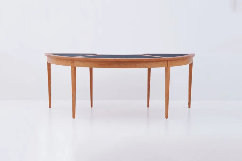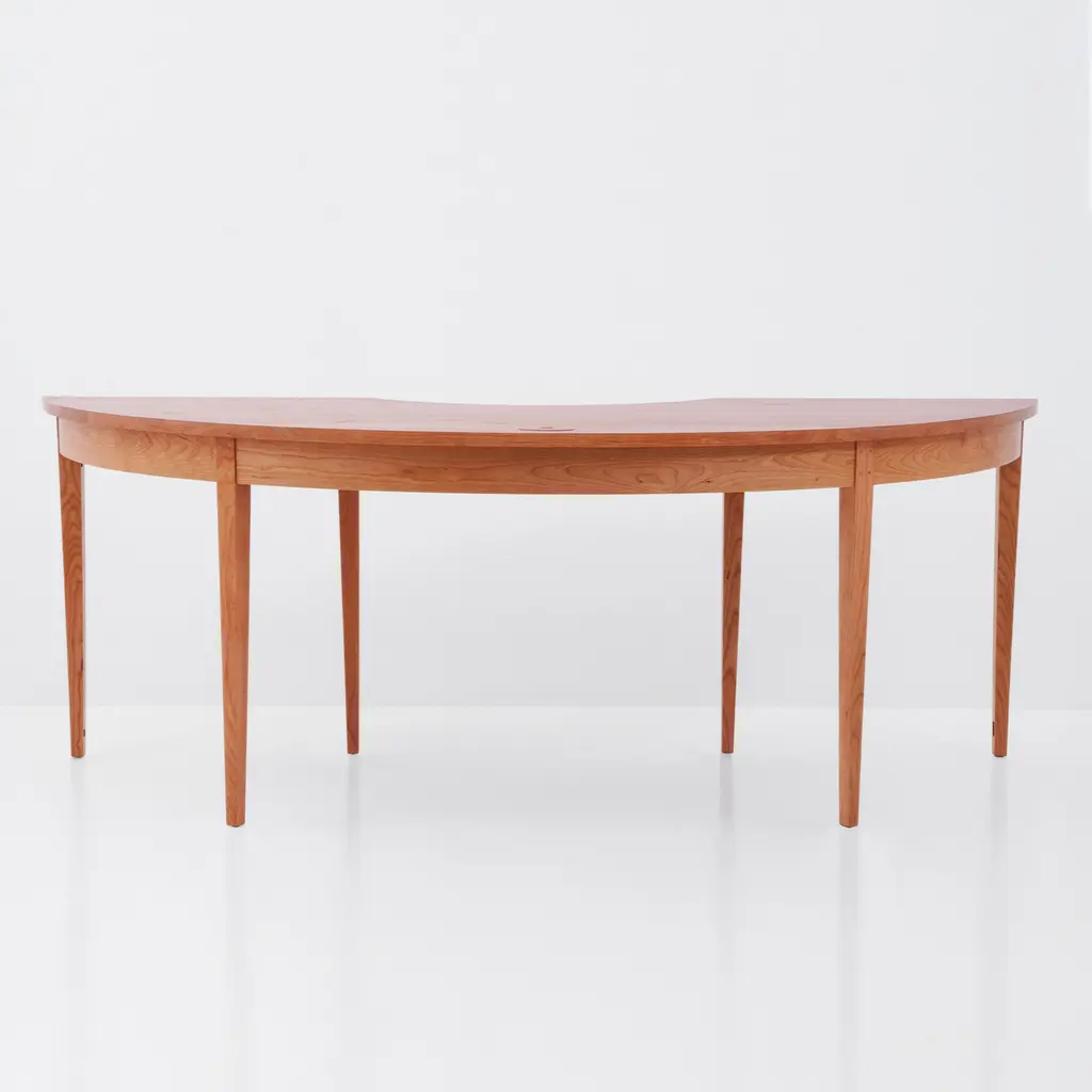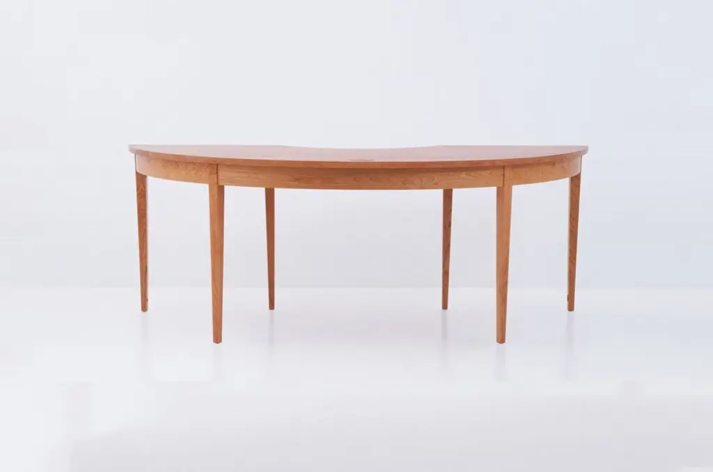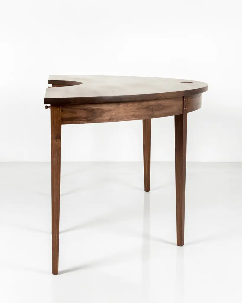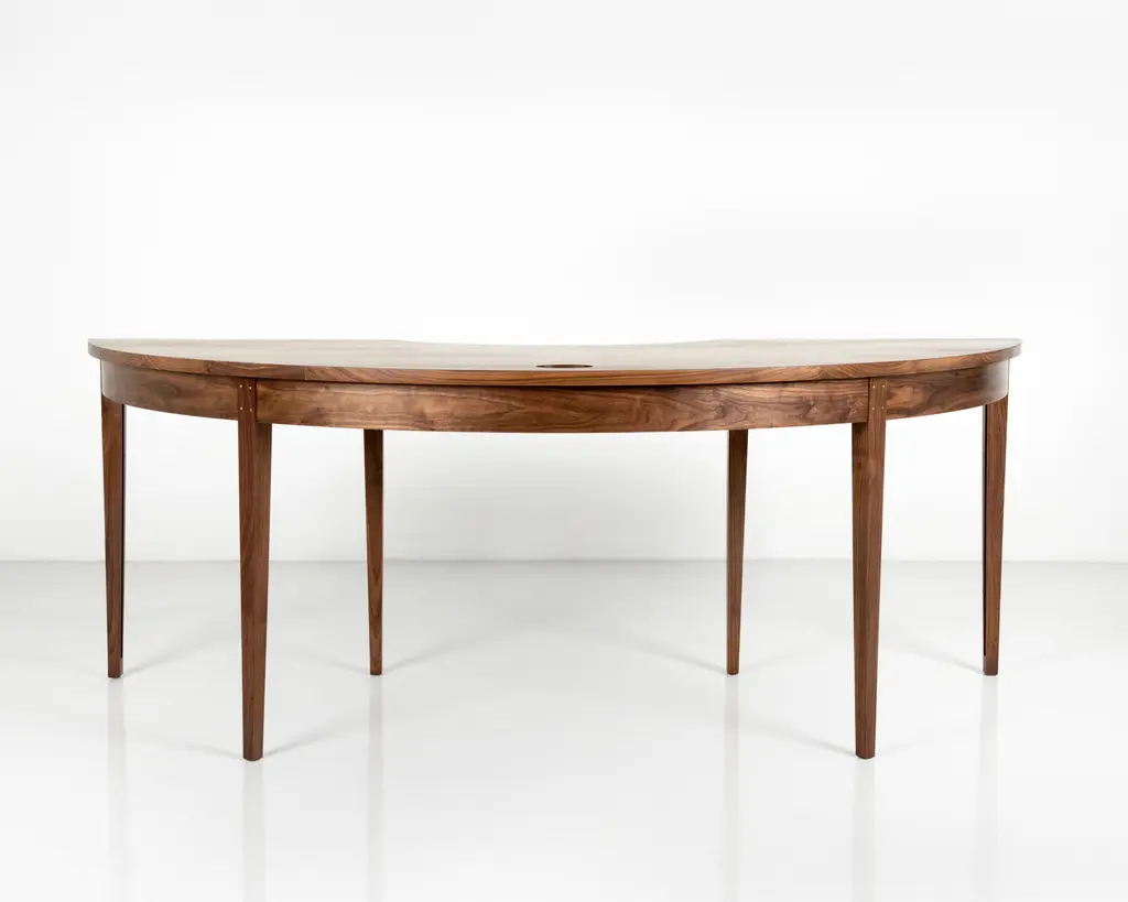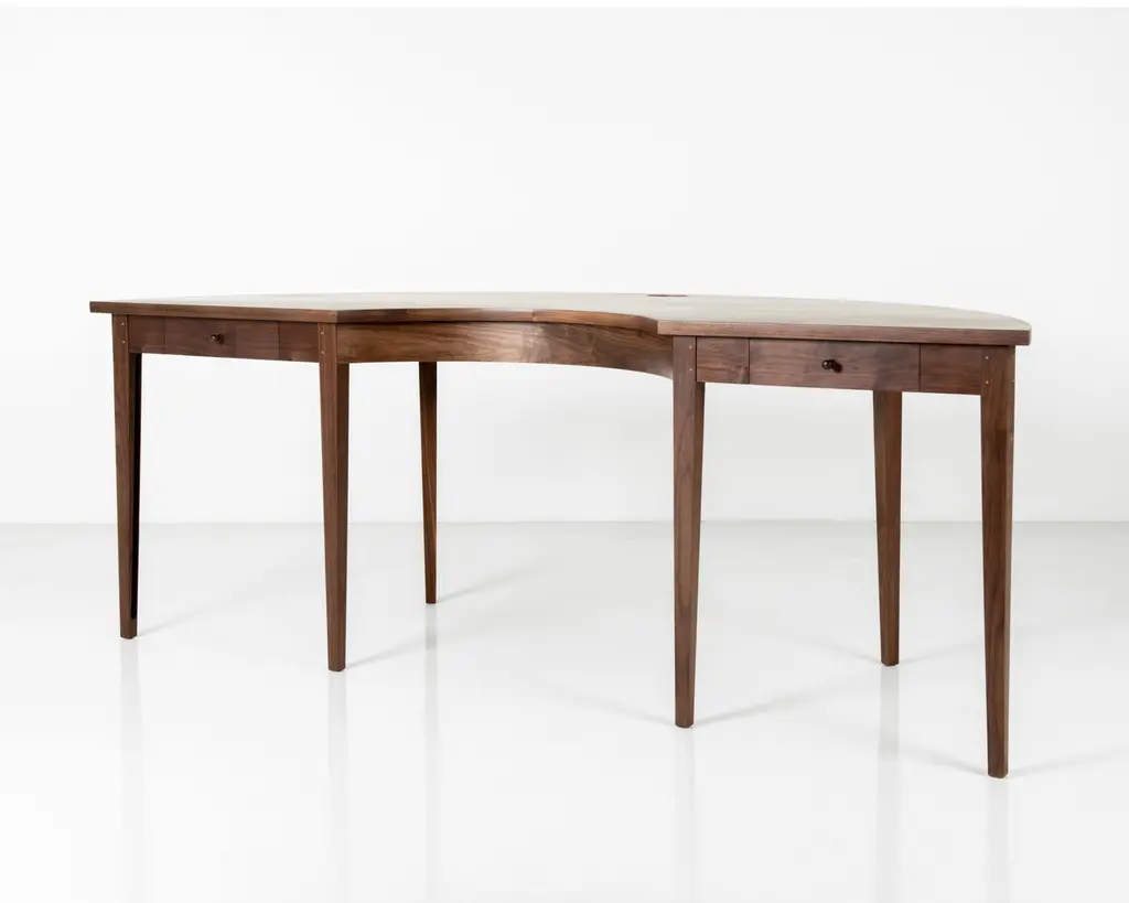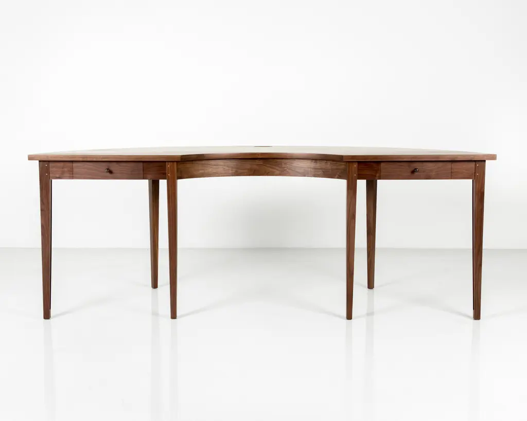 The Radius Desk offers an expansive work surface with six slender legs attached to a flitch-cut hardwood apron with pinned mortise-and-tenon joints. Small drawers eliminate clutter and a hollow channel hidden within the leg of the desk conceals wires that would otherwise tangle the clean lines of this refined desk.
