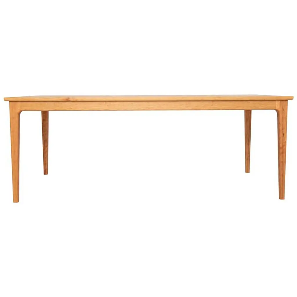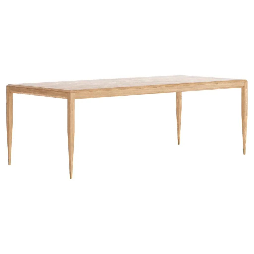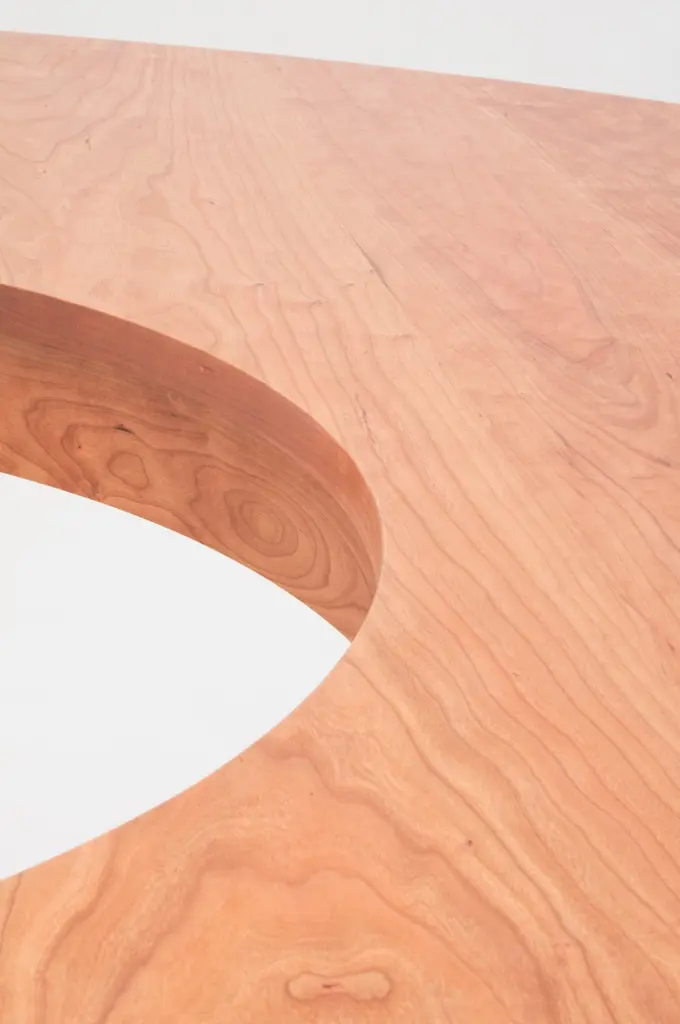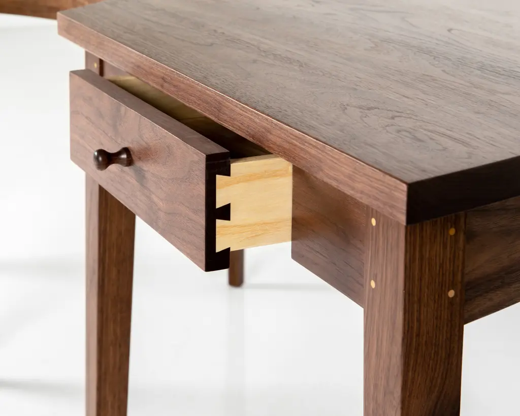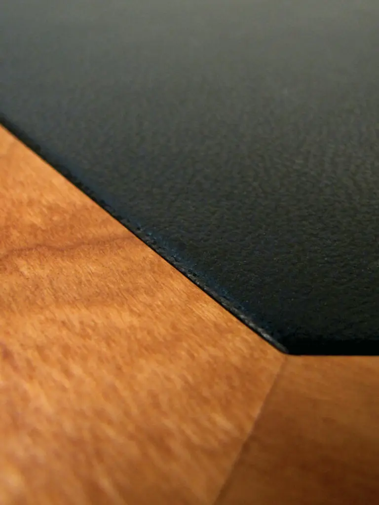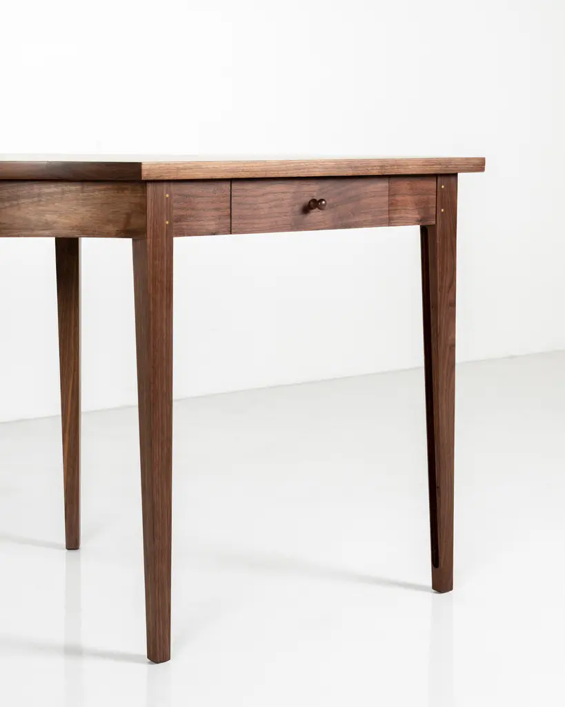 The Radius Desk offers an expansive work surface with six slender legs attached to a flitch-cut hardwood apron with pinned mortise-and-tenon joints. Small drawers eliminate clutter and a hollow channel hidden within the leg of the desk conceals wires that would otherwise tangle the clean lines of this refined desk.