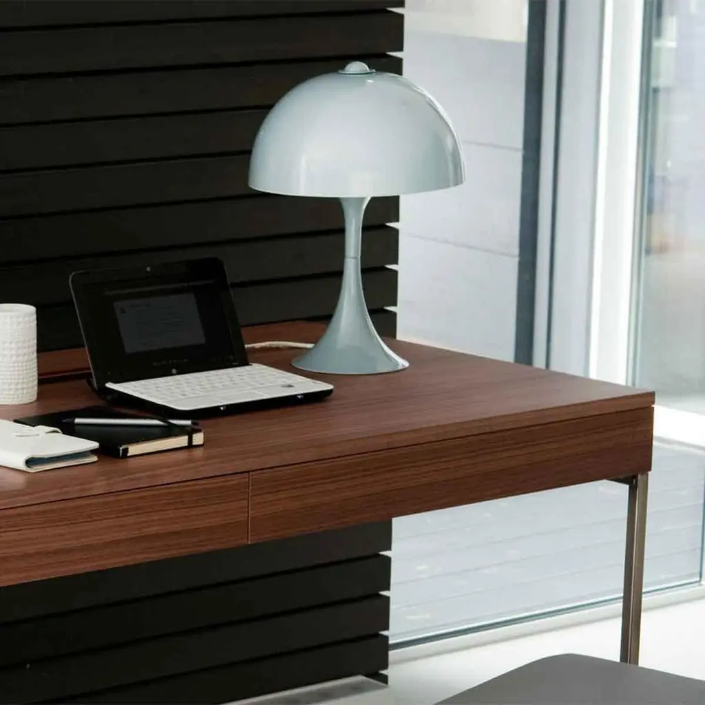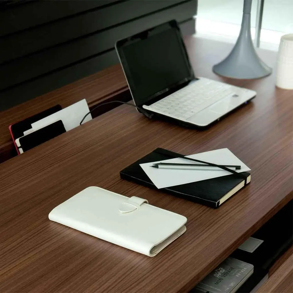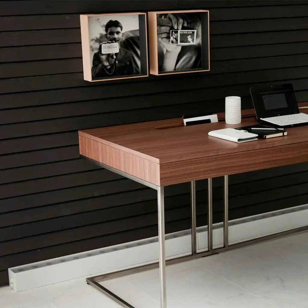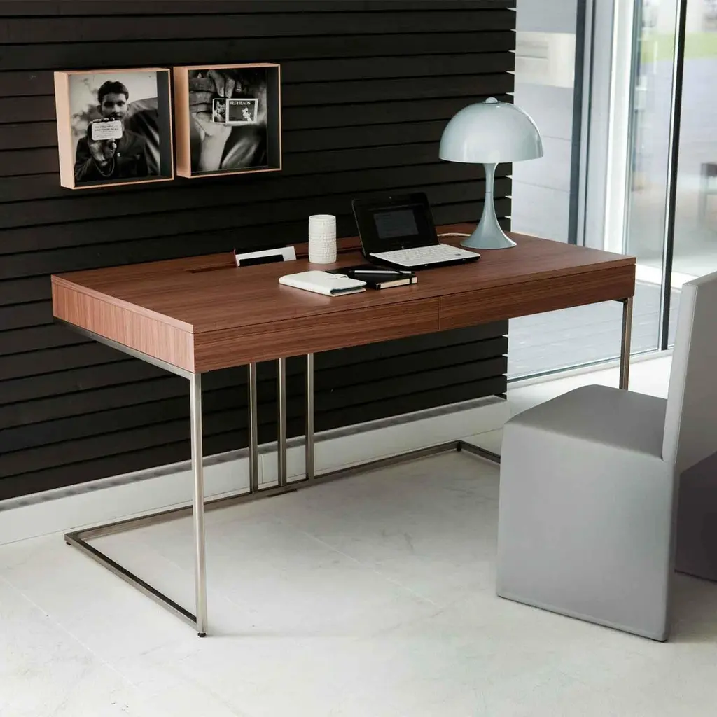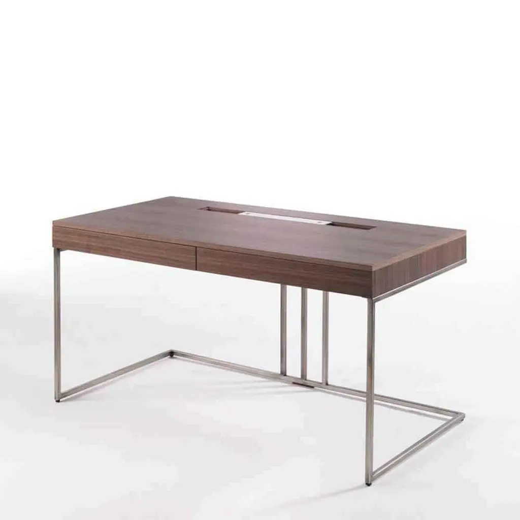 Desk Rapho with frame structure in polished steeland with walnut case top with 2 drawers, with a storagepart for objects and with holes for electric cables.