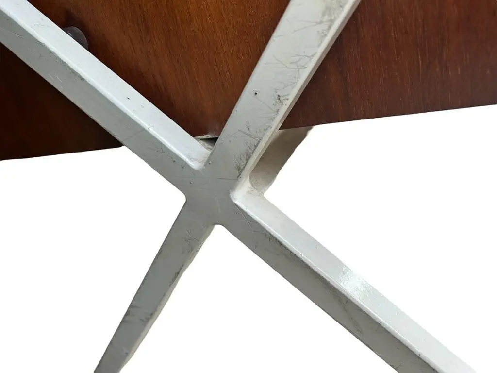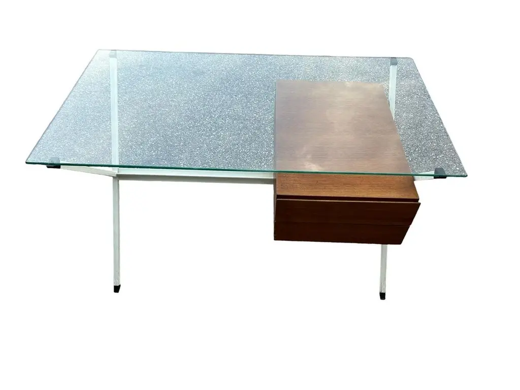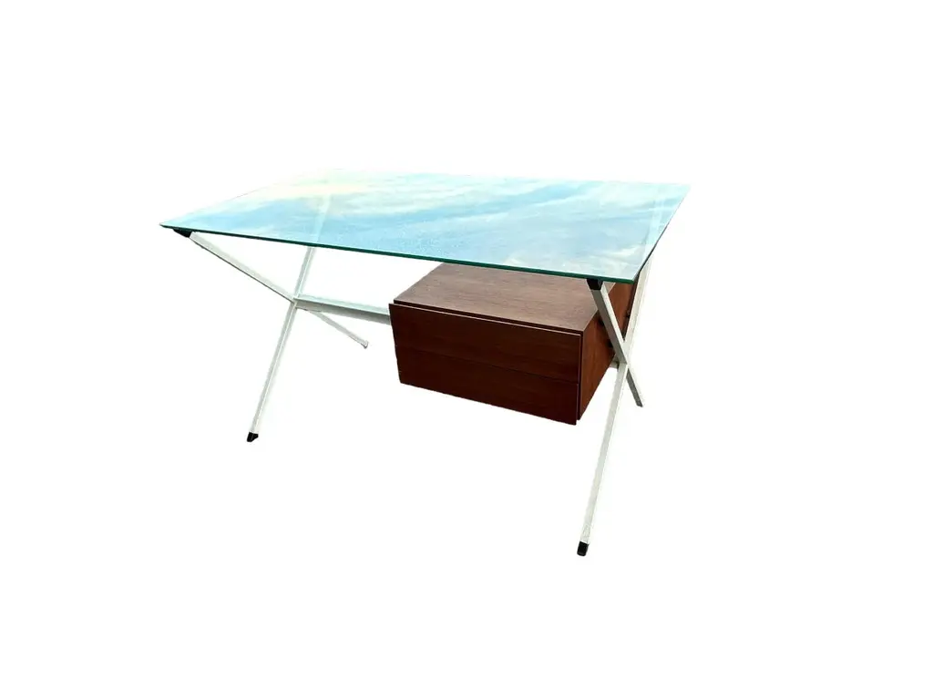 Magnificent desk model N80 by the designer Franco Albini, rare first editions model with white lacquered metal base and wooden box.The dimensions are slightly larger than the model still edited.Tempered glass tray on X base