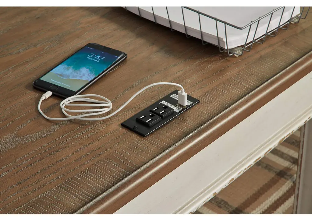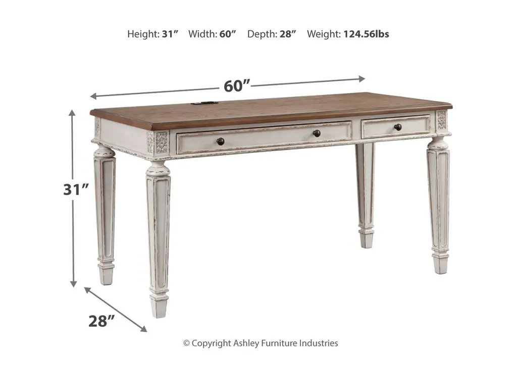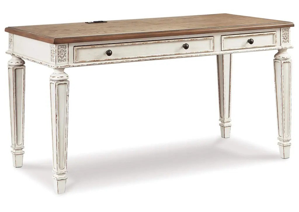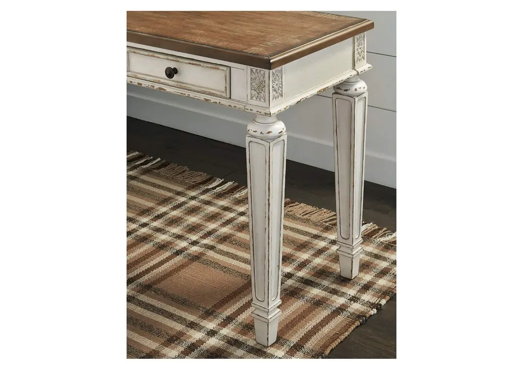 Elevating the art of traditional cottage styling, the Realyn desk is your heavenly home office realized. Its antiqued two-tone aesthetic blends a chipped white with a distressed wood tone top for added charm. Framed drawer fronts, decorative corbels and elegantly turned and tapered legs add refinement, while dark bronze-tone knobs lend a classic touch. Weight 98.000 lbs. (44.1kgs.)