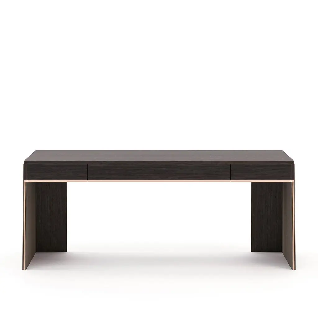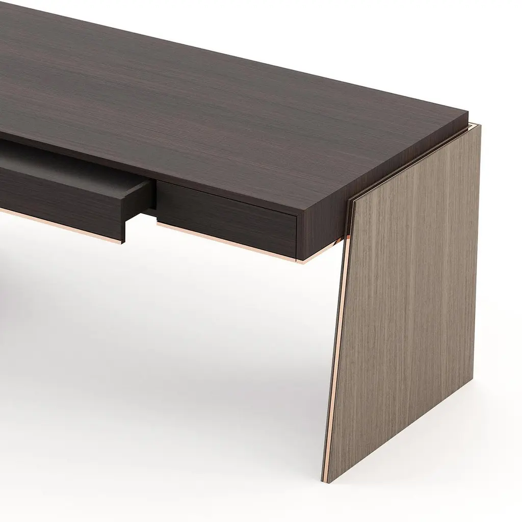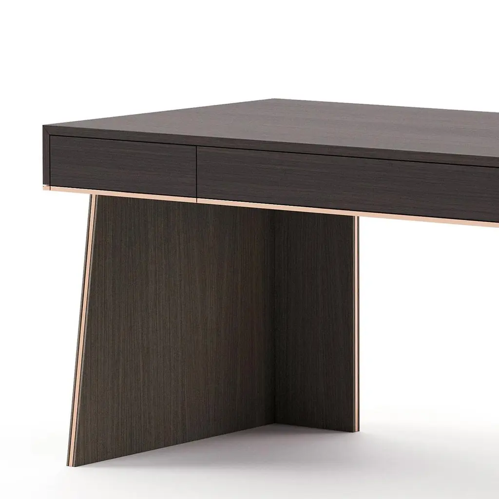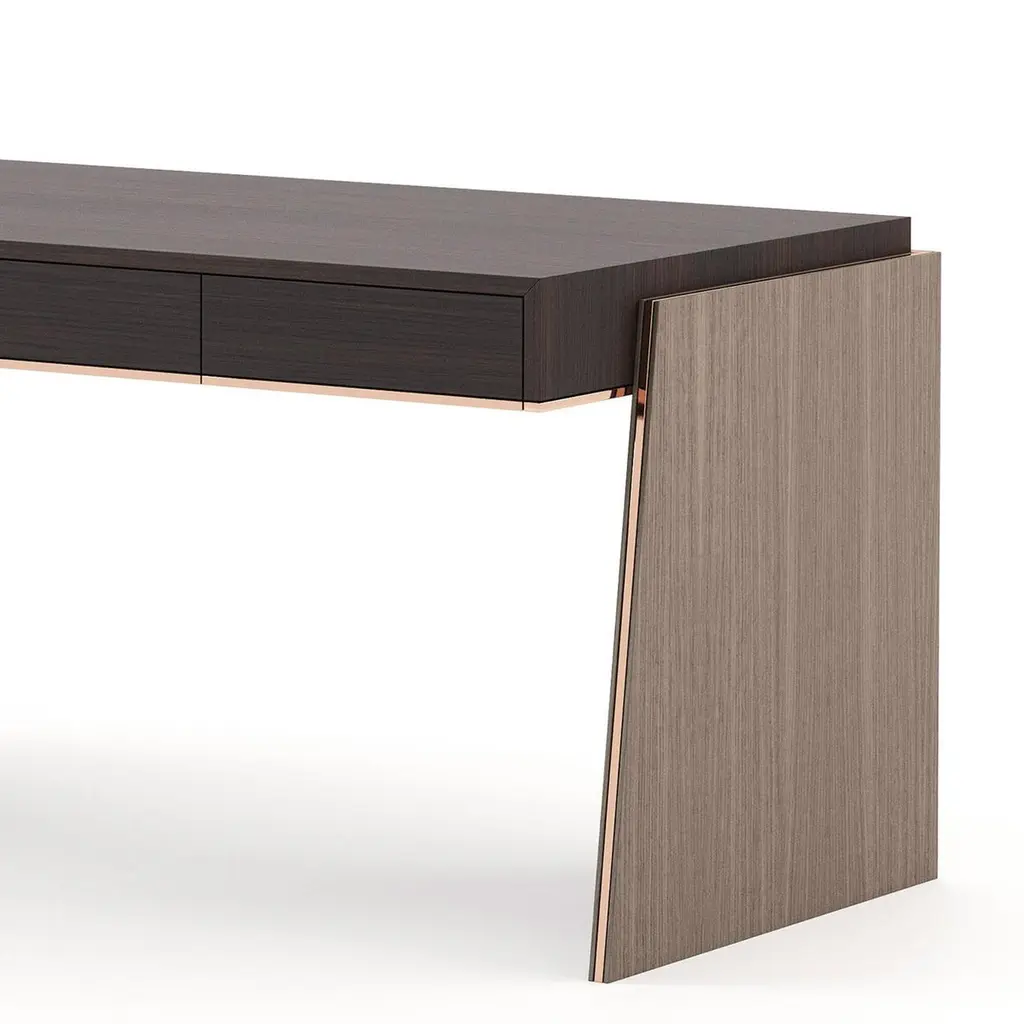 Desk Rector with wooden structure, table top with 3 drawers with easy glide system, in oak veneer in smocked matte finish,2 bases in oak in aged matte finish. Bottom of the top and base's sides with polished stainless trim in copper finish.Also available on request in other wooden finishes.