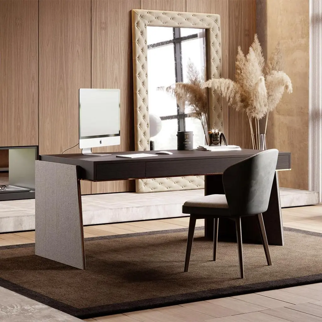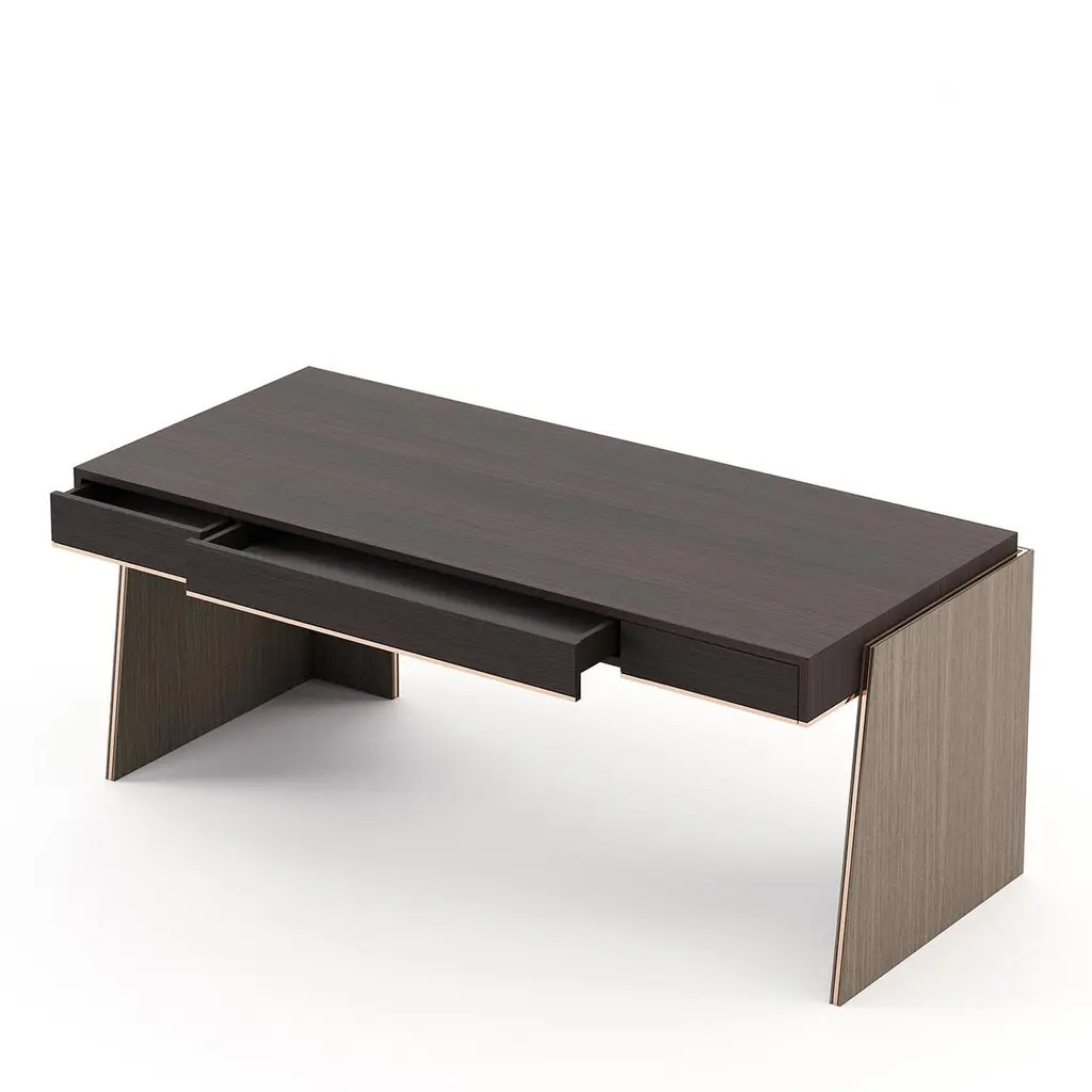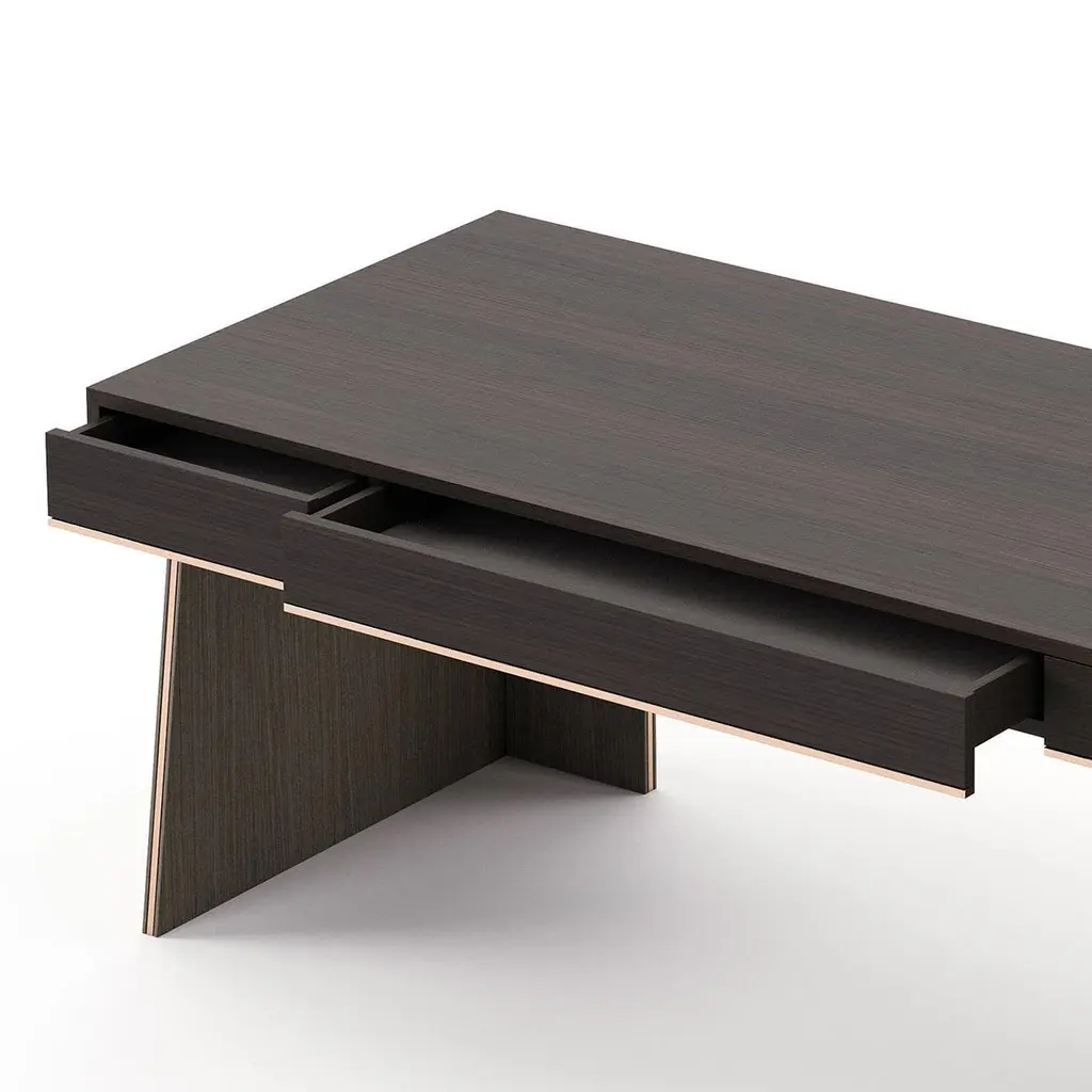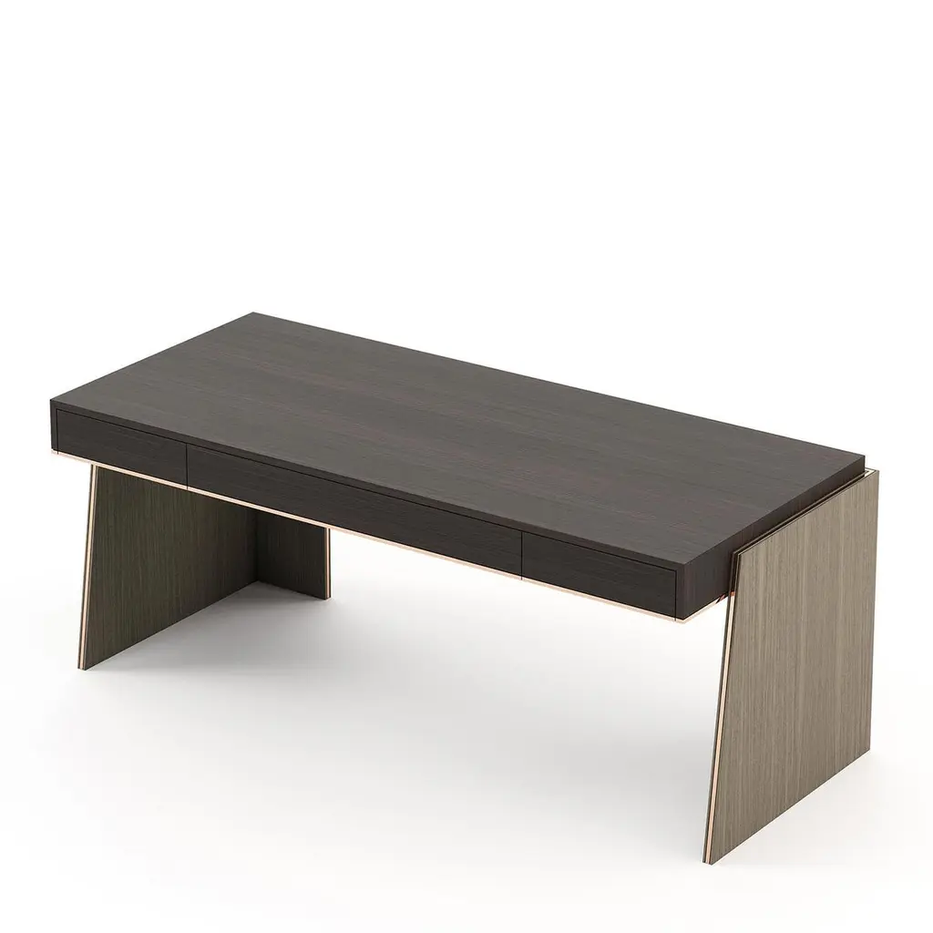 Desk Rector with wooden structure, table top with 3 drawers with easy glide system, in oak veneer in smocked matte finish,2 bases in oak in aged matte finish. Bottom of the top and base's sides with polished stainless trim in copper finish.Also available on request in other wooden finishes.